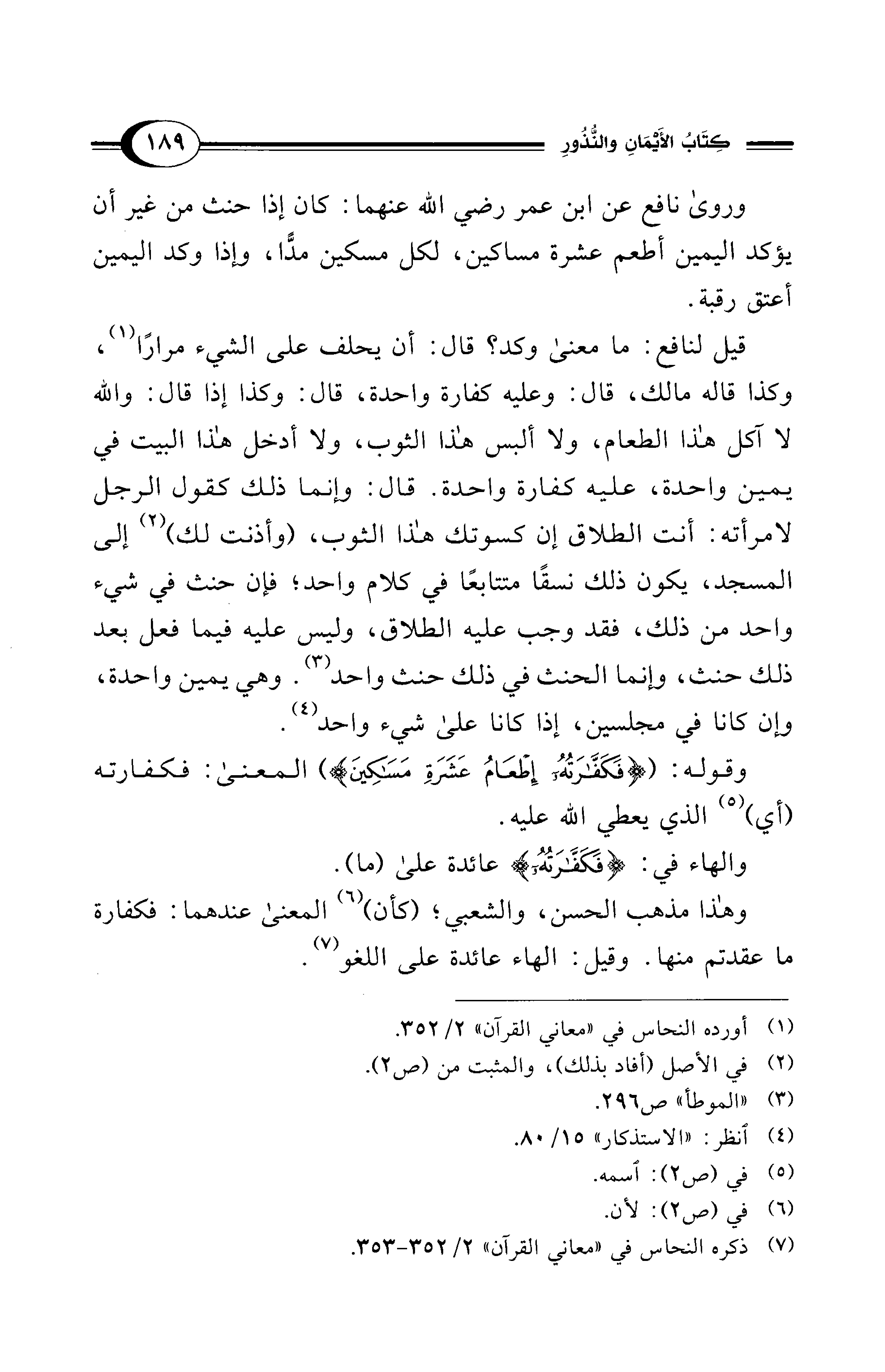 وروى نافع عن ابن عمر - رضي الله عنهما -: كان إذا حنث من غير أن يؤكد اليمين أطعم عشرة مساكين، لكل مسكين مدًّا، وإذا وكد اليمين أعتق رقبة.