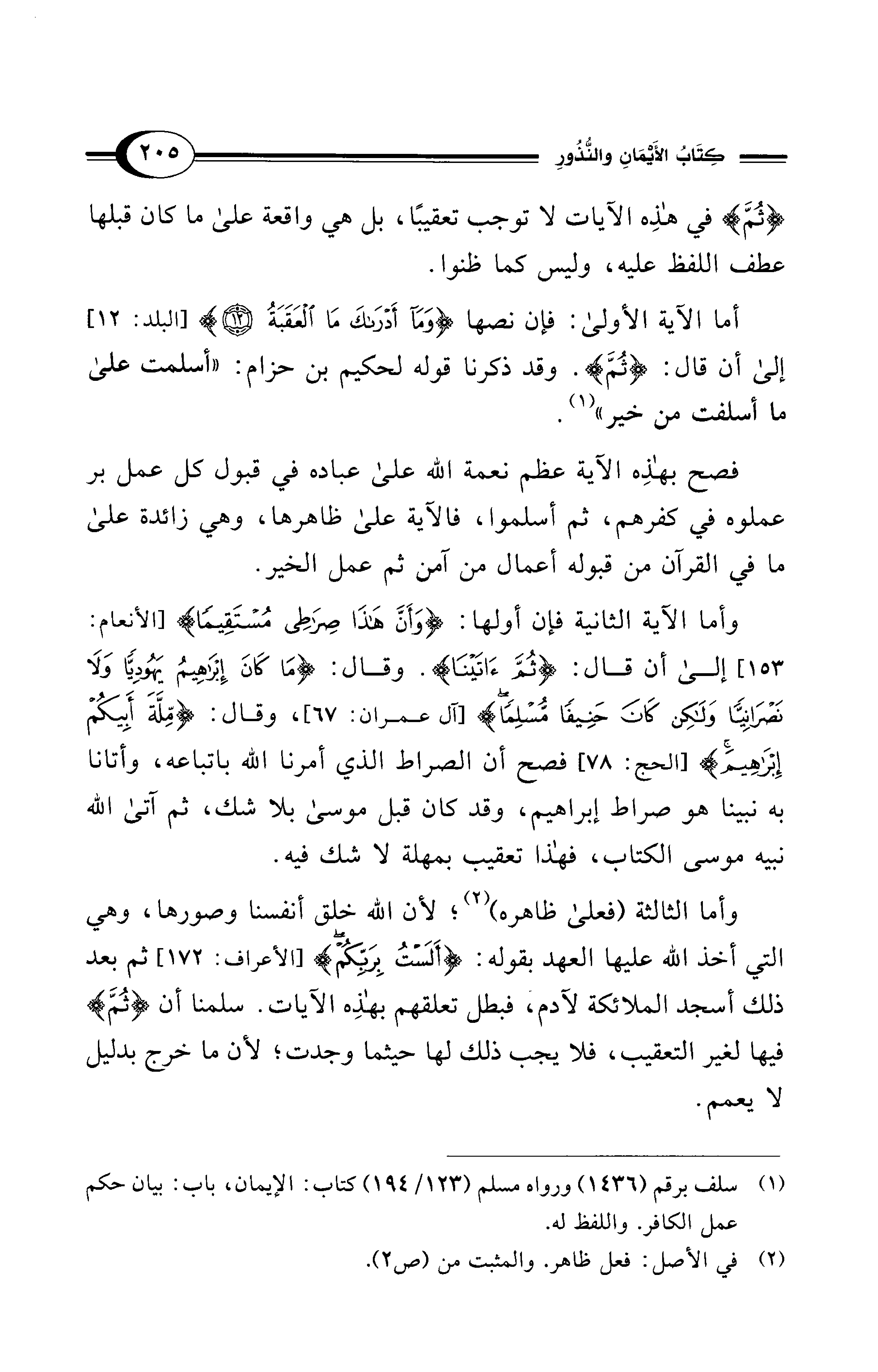 أما الآية الأولى: فإن نصها {وَمَا أَدْرَاكَ مَا الْعَقَبَةُ (12)} [البلد: 12]، إلى أن قال: {ثُمَّ}. وقد ذكرنا قوله لحكيم بن حزام: "أسلمت على ما أسلفت من خير" (¬1).