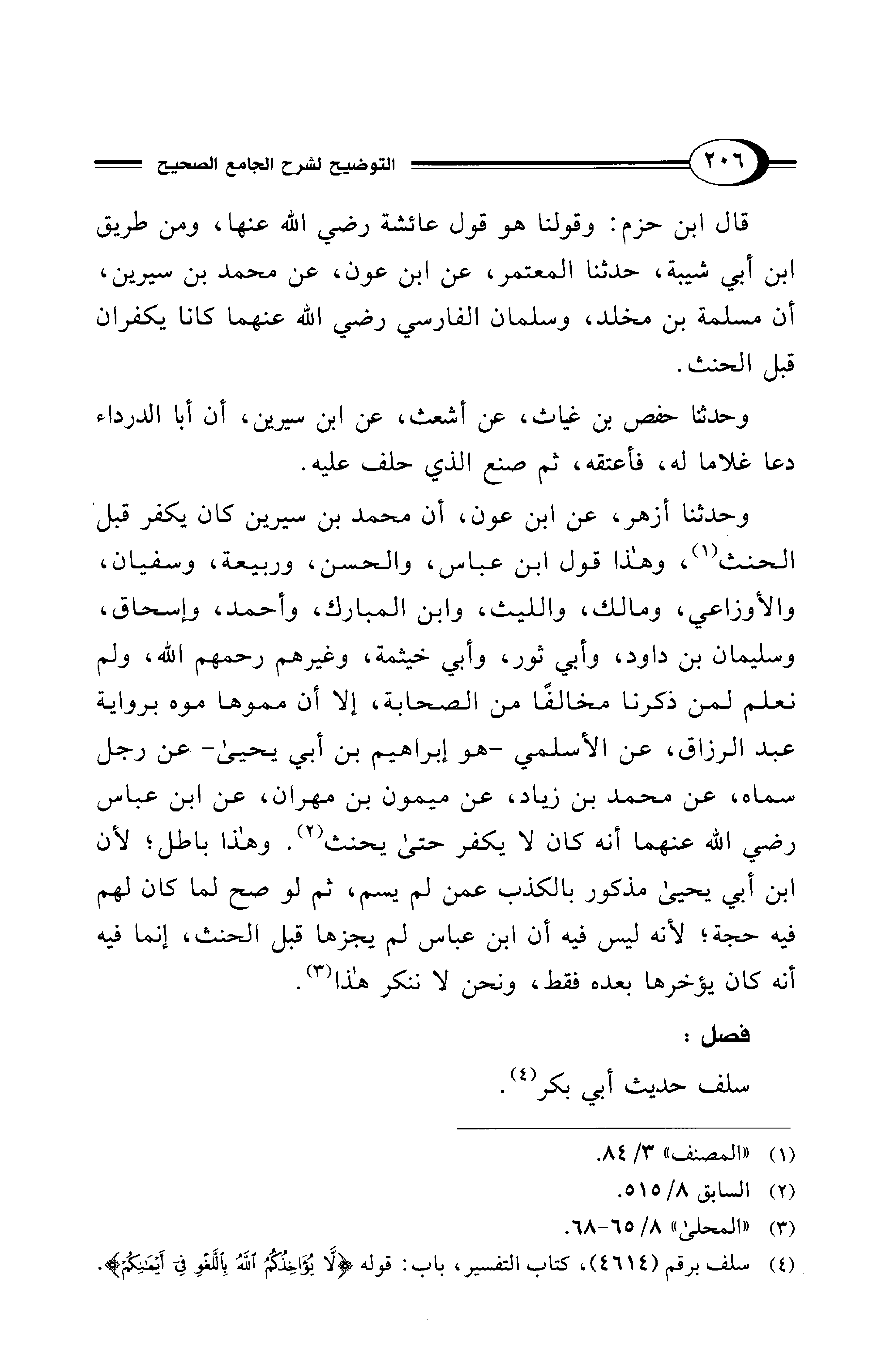 وحدثنا أزهر، عن ابن عون، أن محمد بن سيرين كان يكفر قبل الحنث (¬1)، وهذا قول ابن عباس، والحسن، وربيعة، وسفيان، والأوزاعي، ومالك، والليث، وابن المبارك، وأحمد، وإسحاق، وسليمان بن داود، وأبي ثور، وأبي خيثمة، وغيرهم -رحمهم الله-، ولم نعلم لمن ذكرنا مخالفًا من الصحابة، إلا أن مموها موه برواية عبد الرزاق، عن الأسلمي -هو إبراهيم بن أبي يحيى- عن رجل سماه، عن محمد بن زياد، عن ميمون بن مهران، عن ابن عباس - رضي الله عنهما - أنه كان لا يكفر حتى يحنث (¬2). وهذا باطل؛ لأن ابن أبي يحيى مذكور بالكذب عمن لم يسم، ثم لو صح لما كان لهم فيه حجة؛ لأنه ليس فيه أن ابن عباس لم يجزها قبل الحنث، إنما فيه أنه كان يؤخرها بعده فقط، ونحن لا ننكر هذا (¬3).