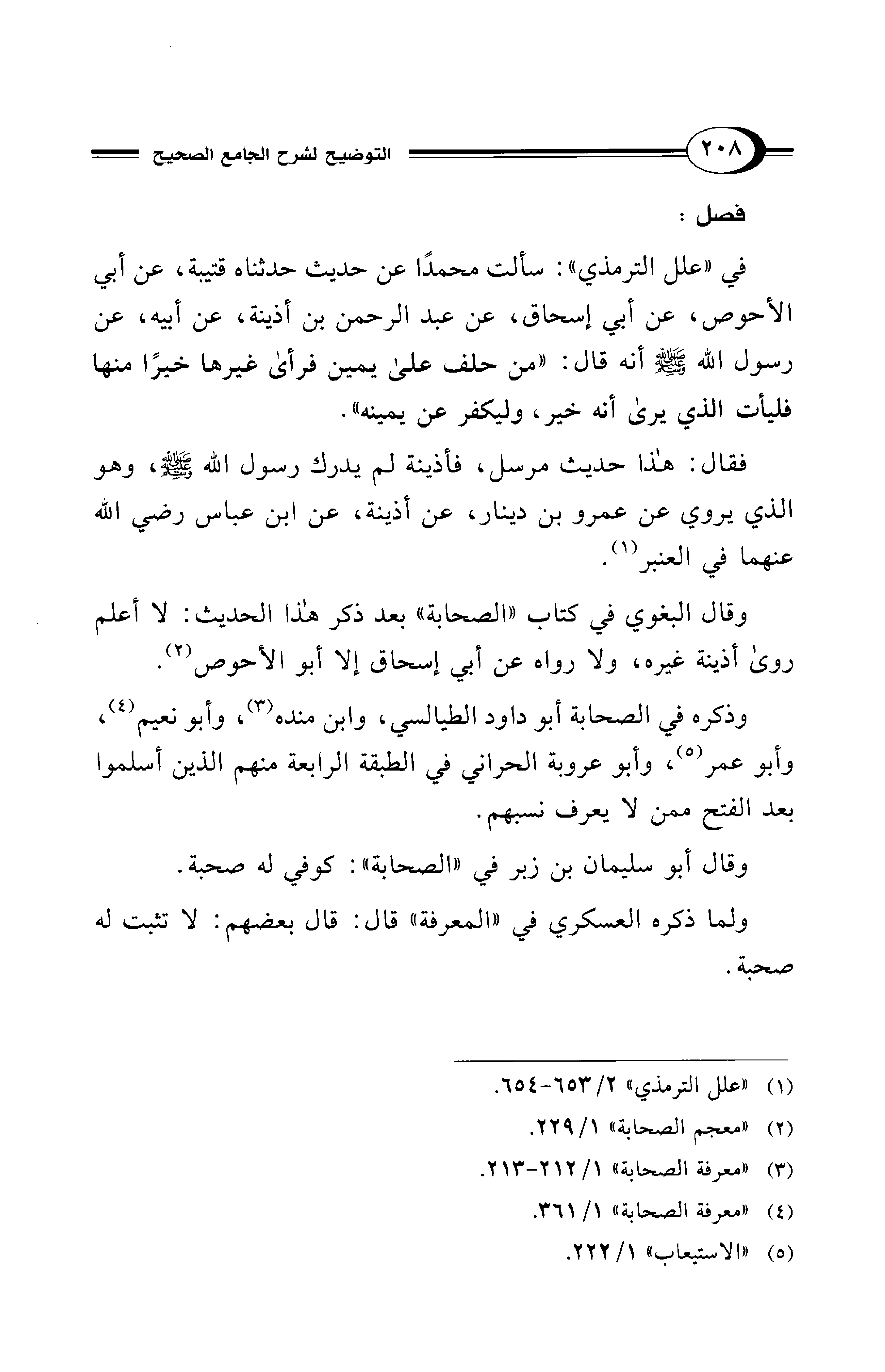 في "علل الترمذي": سألت محمدًا عن حديث حدثناه قتيبة، عن أبي الأحوص، عن أبي إسحاق، عن عبد الرحمن بن أذينة، عن أبيه، عن رسول الله - صلى الله عليه وسلم - "أنه قال: "من حلف على يمين فرأى غيرها خيرًا منها فليأت الذي يرى أنه خير، وليكفر عن يمينه".
