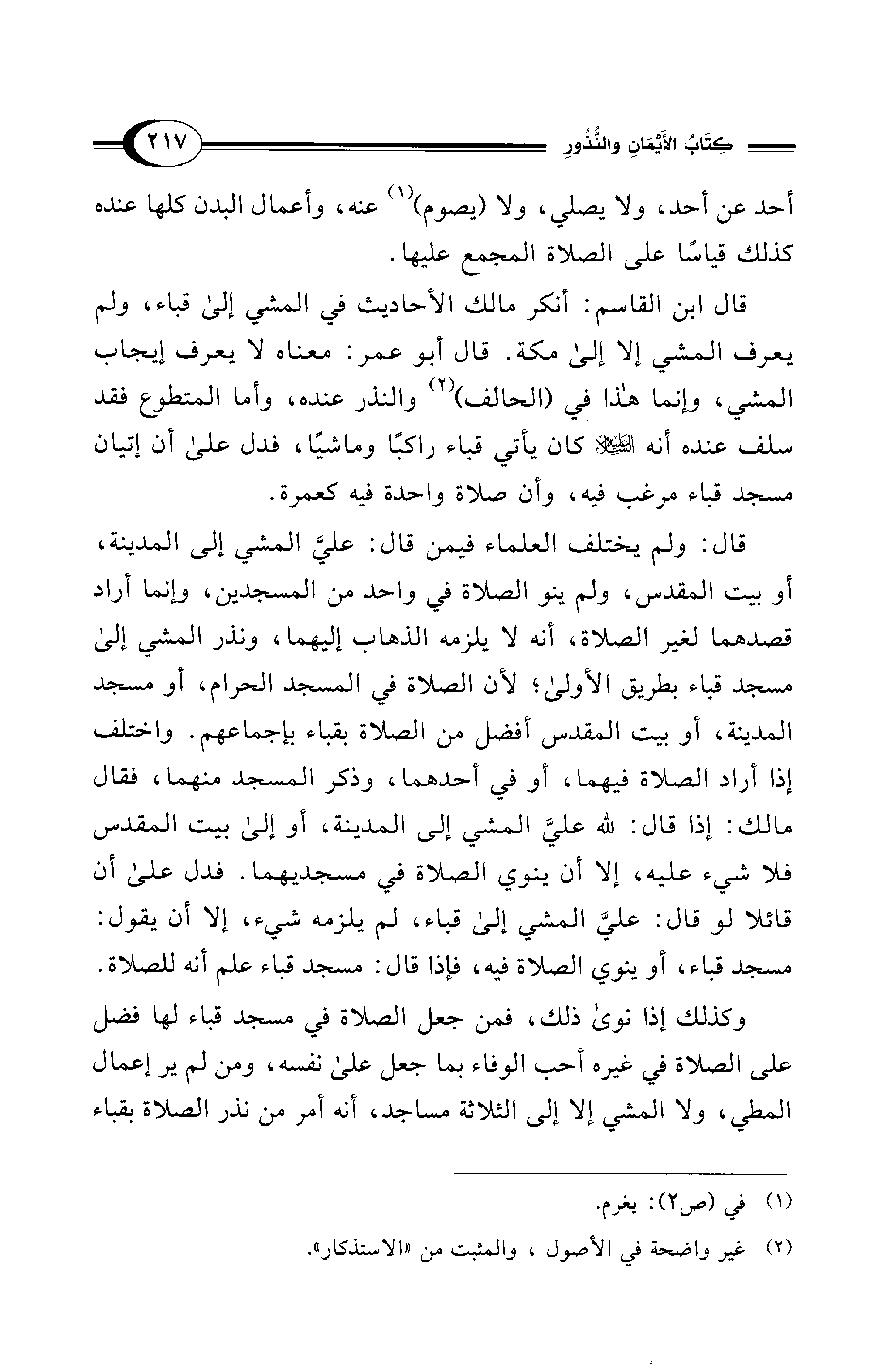 قال: ولم يختلف العلماء فيمن قال: عليَّ المشي إلى المدينة، أو بيت المقدس، ولم ينو الصلاة في واحد من المسجدين، وإنما أراد قصدهما لغير الصلاة، أنه لا يلزمه الذهاب إليهما، ونذر المشي إلى مسجد قباء بطريق الأولى؛ لأن الصلاة في المسجد الحرام، أو مسجد المدينة، أو بيت المقدس أفضل من الصلاة بقباء بإجماعهم. واختلف إذا أراد الصلاة فيهما، أو في أحدهما، وذكر المسجد منهما، فقال مالك: إذا قال: لله عليَّ المشي إلى المدينة، أو إلى بيت المقدس فلا شيء عليه، إلا أن ينوي الصلاة في مسجديهما. فدل على أن قائلا لو قال: عليَّ المشي إلى قباء، لم يلزمه شيء، إلا أن يقول: مسجد قباء، أو ينوي الصلاة فيه، فإذا قال: مسجد قباء علم أنه للصلاة.