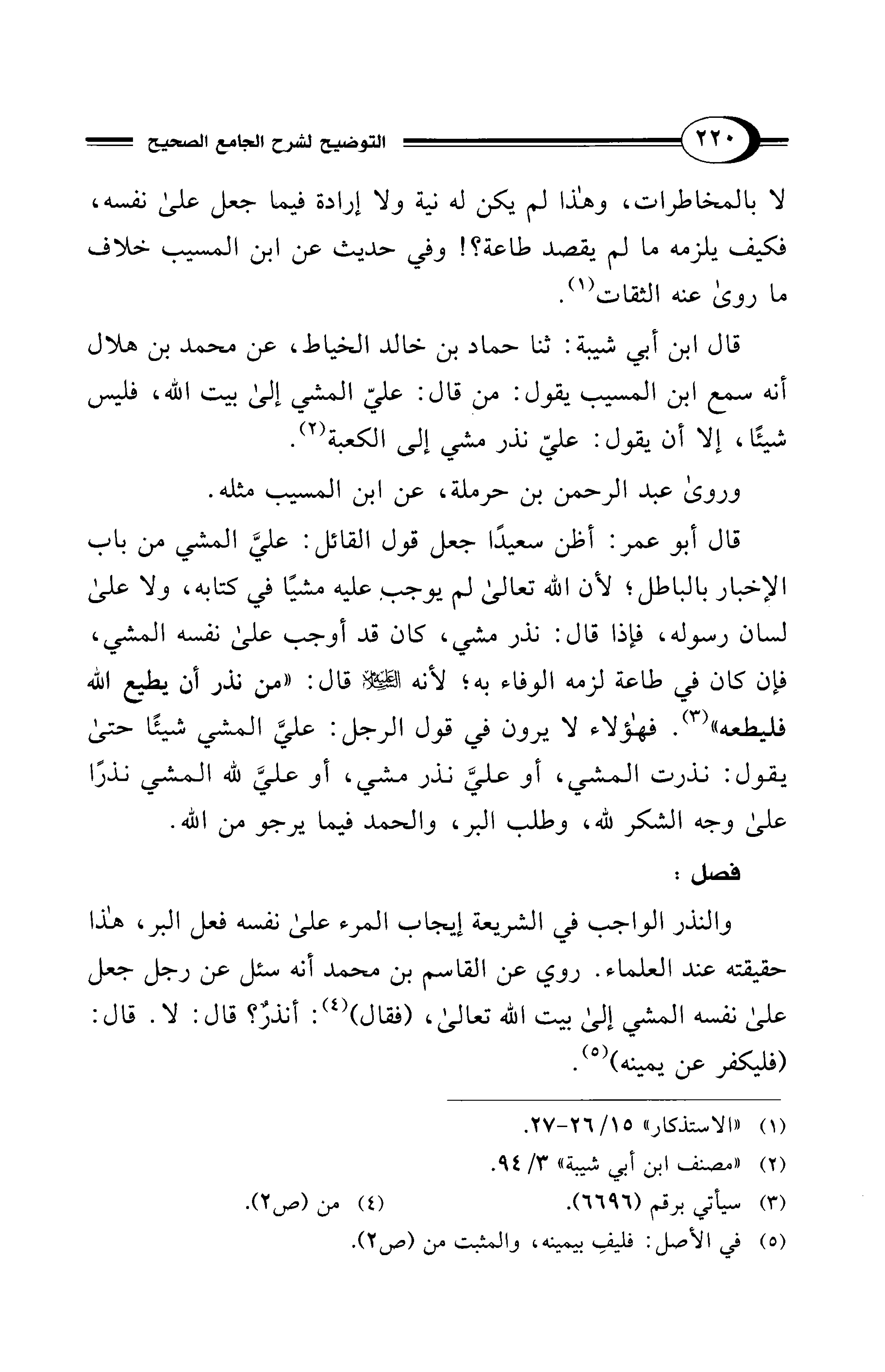 والنذر الواجب في الشريعة إيجاب المرء على نفسه فعل البر، هذا حقيقته عند العلماء. روي عن القاسم بن محمد أنه سئل عن رجل جعل على نفسه المشي إلى بيت الله تعالى، (فقال) (¬4): أنذرٌ؟ قال: لا. قال: (فليكفر عن يمينه) (¬5).