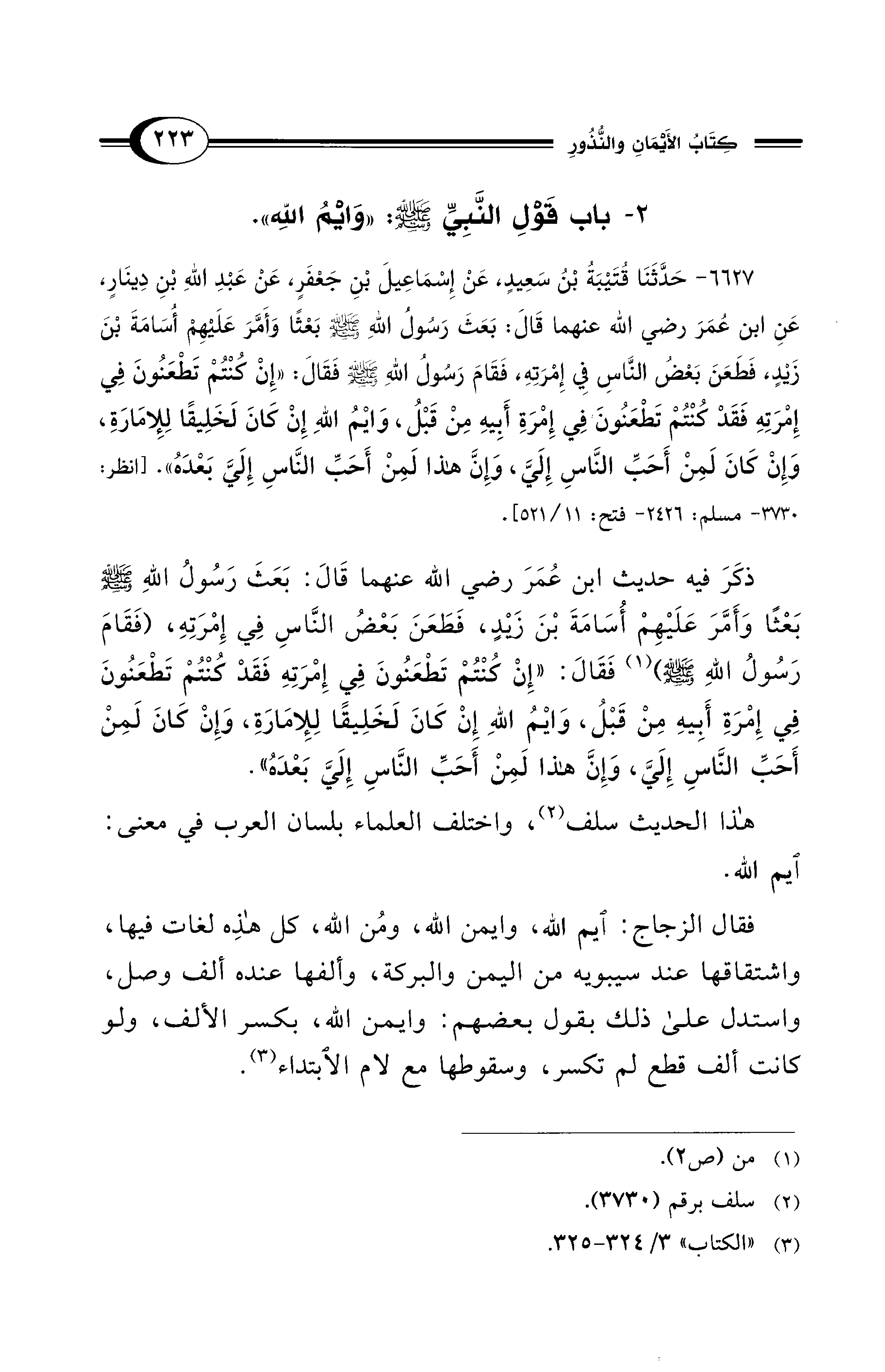 إِمْرَتِهِ فَقَدْ كُنْتُمْ تَطْعَنُونَ، فِي إِمْرَةِ أَبِيهِ مِنْ قَبْلُ، وَايْمُ اللهِ إِنْ كَانَ لَخَلِيقًا لِلإِمَارَةِ، وَإِنْ كَانَ لَمِنْ أَحَبِّ النَّاسِ إِلَيَّ، وَإِنَّ هَذَا لَمِنْ أَحَبِّ النَّاسِ إِلَيَّ بَعْدَهُ». [انظر: 3730 - مسلم: 2426 - فتح: 11/ 521].