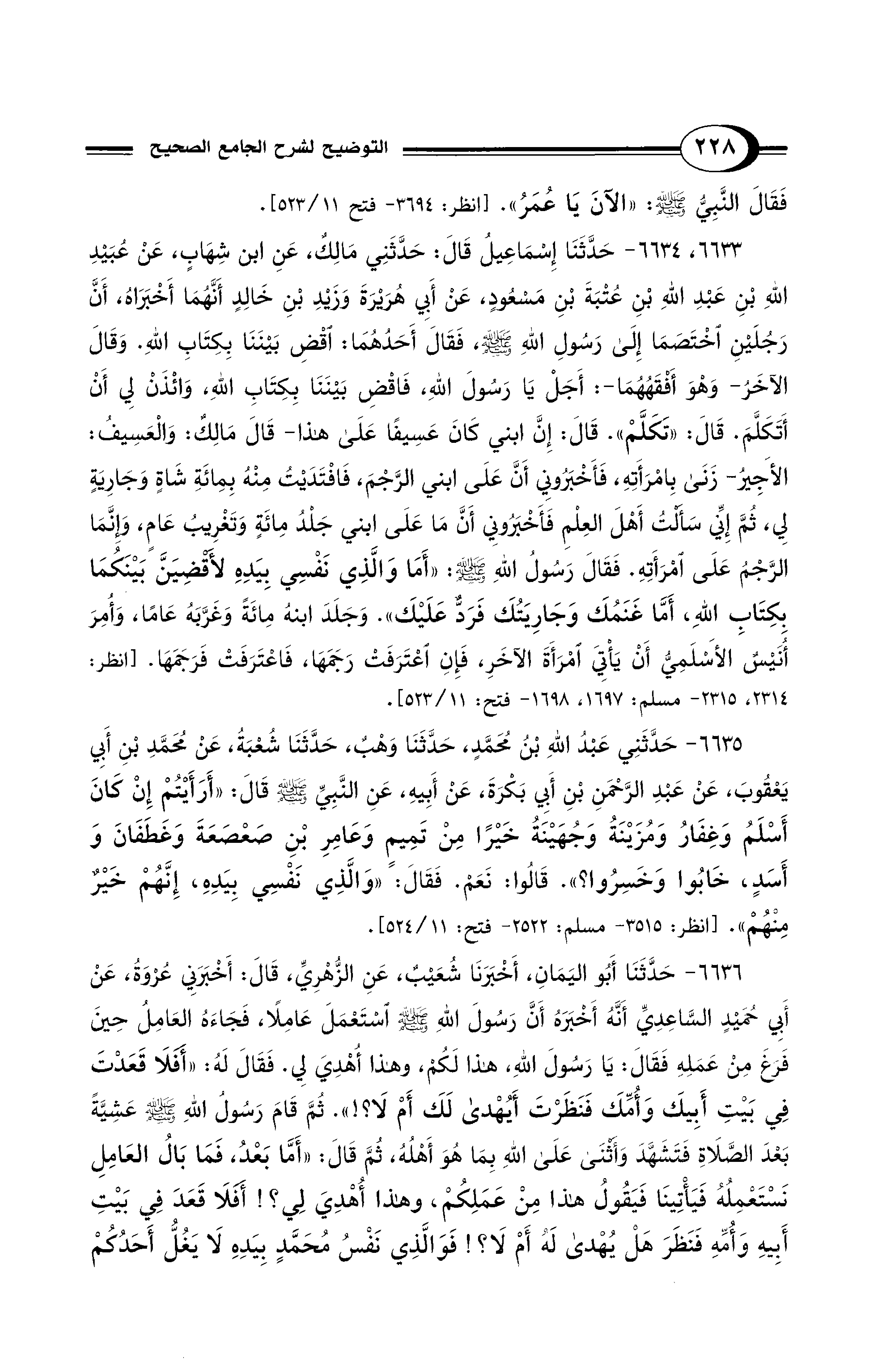 6633، 6634 - حَدَّثَنَا إِسْمَاعِيلُ قَالَ: حَدَّثَنِي مَالِكٌ، عَنِ ابْنِ شِهَابٍ، عَنْ عُبَيْدِ اللهِ بْنِ عَبْدِ اللهِ بْنِ عُتْبَةَ بْنِ مَسْعُودٍ، عَنْ أَبِي هُرَيْرَةَ وَزَيْدِ بْنِ خَالِدٍ أَنَّهُمَا أَخْبَرَاهُ، أَنَّ رَجُلَيْنِ اخْتَصَمَا إِلَى رَسُولِ اللهِ - صلى الله عليه وسلم - فَقَالَ أَحَدُهُمَا: اقْضِ بَيْنَنَا بِكِتَابِ اللهِ. وَقَالَ الآخَرُ -وَهْوَ أَفْقَهُهُمَا-: أَجَلْ يَا رَسُولَ اللهِ، فَاقْضِ بَيْنَنَا بِكِتَابِ اللهِ، وَائْذَنْ لِي أَنْ أَتَكَلَّمَ. قَالَ: «تَكَلَّمْ». قَالَ: إِنَّ ابْنِي كَانَ عَسِيفًا عَلَى هَذَا -قَالَ مَالِكٌ: وَالْعَسِيفُ: الأَجِيرُ- زَنَى بِامْرَأَتِهِ، فَأَخْبَرُونِي أَنَّ عَلَى ابْنِي الرَّجْمَ، فَافْتَدَيْتُ مِنْهُ بِمِائَةِ شَاةٍ وَجَارِيَةٍ لِي، ثُمَّ إِنِّي سَأَلْتُ أَهْلَ الْعِلْمِ فَأَخْبَرُونِي أَنَّ مَا عَلَى ابْنِي جَلْدُ مِائَةٍ وَتَغْرِيبُ عَامٍ، وَإِنَّمَا الرَّجْمُ عَلَى امْرَأَتِهِ. فَقَالَ رَسُولُ اللهِ - صلى الله عليه وسلم -: «أَمَا وَالَّذِى نَفْسِي بِيَدِهِ لأَقْضِيَنَّ بَيْنَكُمَا بِكِتَابِ اللهِ، أَمَّا غَنَمُكَ وَجَارِيَتُكَ فَرَدٌّ عَلَيْكَ». وَجَلَدَ ابْنَهُ مِائَةً وَغَرَّبَهُ عَامًا، وَأُمِرَ أُنَيْسٌ الأَسْلَمِيُّ أَنْ يَأْتِيَ امْرَأَةَ الآخَرِ، فَإِنِ اعْتَرَفَتْ رَجَمَهَا، فَاعْتَرَفَتْ فَرَجَمَهَا. [انظر: 2314، 2315 - مسلم: 1697، 1698 - فتح: 11/ 523].