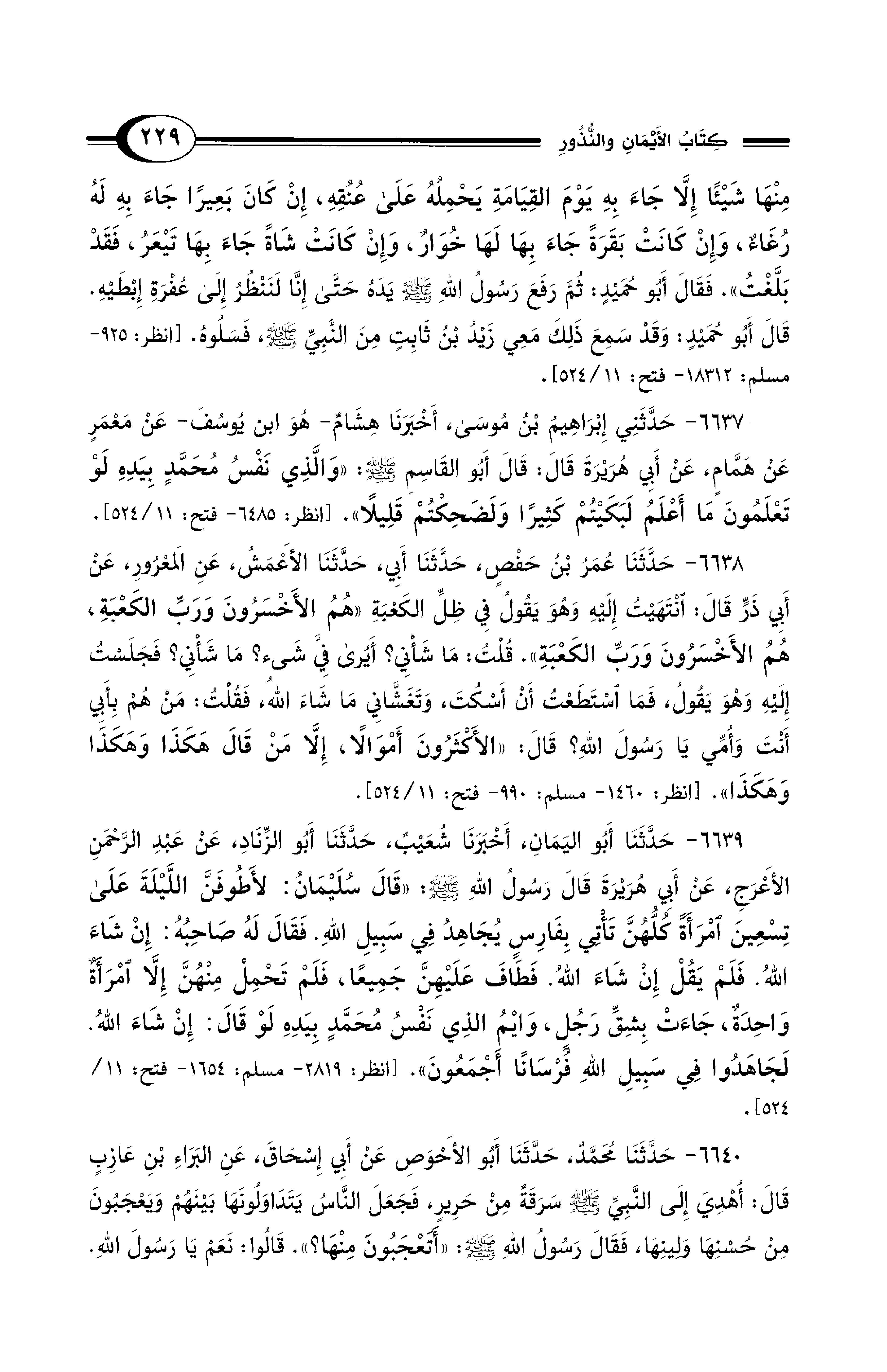 مِنْهَا شَيْئًا إِلاَّ جَاءَ بِهِ يَوْمَ الْقِيَامَةِ يَحْمِلُهُ عَلَى عُنُقِهِ، إِنْ كَانَ بَعِيرًا جَاءَ بِهِ لَهُ رُغَاءٌ، وَإِنْ كَانَتْ بَقَرَةً جَاءَ بِهَا لَهَا خُوَارٌ، وَإِنْ كَانَتْ شَاةً جَاءَ بِهَا تَيْعَرُ، فَقَدْ بَلَّغْتُ». فَقَالَ أَبُو حُمَيْدٍ: ثُمَّ رَفَعَ رَسُولُ اللهِ - صلى الله عليه وسلم - يَدَهُ حَتَّى إِنَّا لَنَنْظُرُ إِلَى عُفْرَةِ إِبْطَيْهِ. قَالَ أَبُو حُمَيْدٍ: وَقَدْ سَمِعَ ذَلِكَ مَعِي زَيْدُ بْنُ ثَابِتٍ مِنَ النَّبِيِّ - صلى الله عليه وسلم -, فَسَلُوهُ. [انظر: 925 - مسلم: 18312 - فتح: 11/ 524].