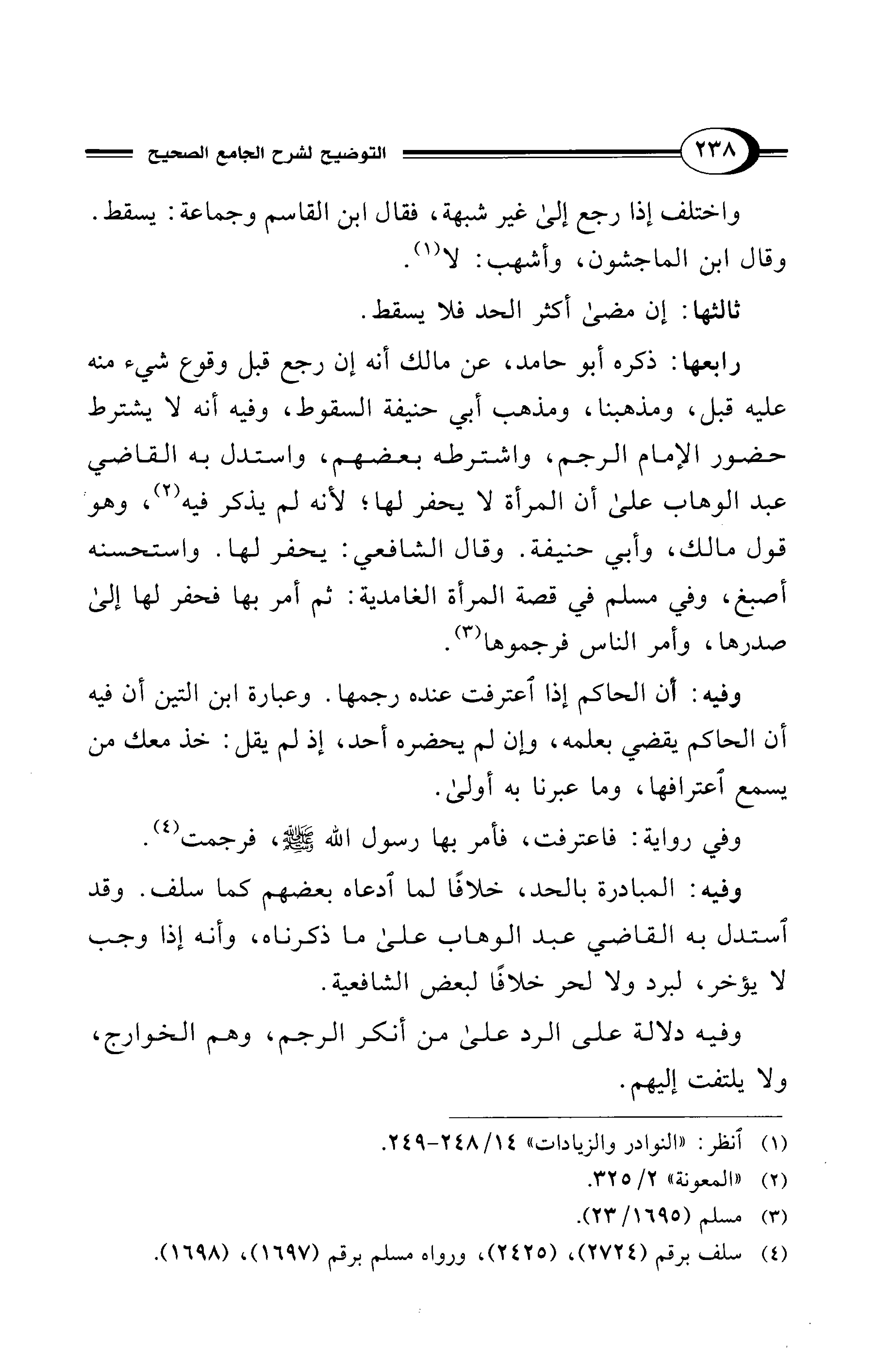 واختلف إذا رجع إلى غير شبهة، فقال ابن القاسم وجماعة: يسقط. وقال ابن الماجشون، وأشهب: لا (¬1).