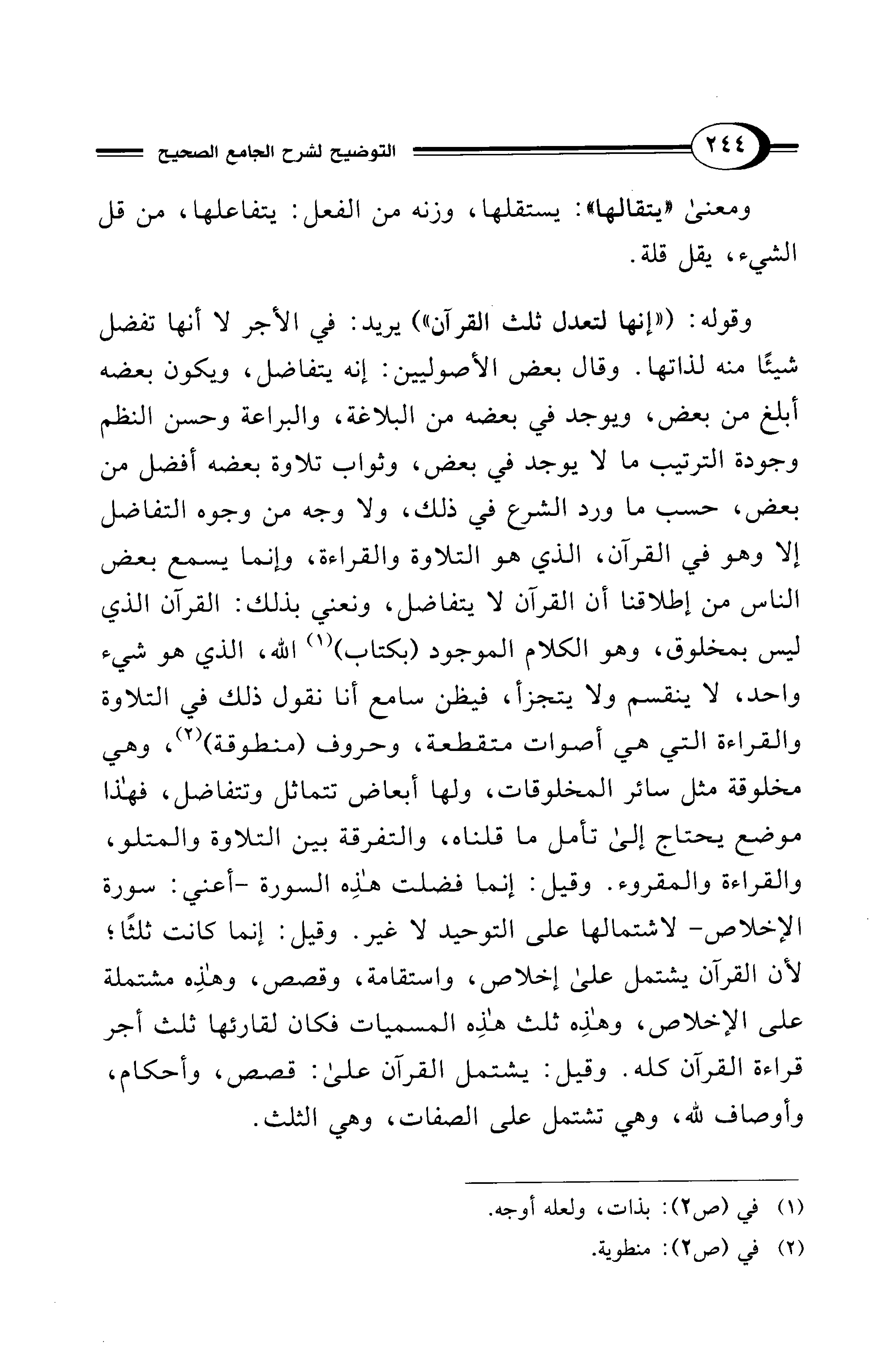 وقوله: ("إنها لتعدل ثلث القرآن") يريد: في الأجر لا أنها تفضل شيئًا منه لذاتها. وقال بعض الأصوليين: إنه يتفاضل، ويكون بعضه أبلغ من بعض، ويوجد في بعضه من البلاغة، والبراعة وحسن النظم وجودة الترتيب ما لا يوجد في بعض، وثواب تلاوة بعضه أفضل من بعض، حسب ما ورد الشرع في ذلك، ولا وجه من وجوه التفاضل إلا وهو في القرآن، الذي هو التلاوة والقراءة، وإنما يسمع بعض الناس من إطلاقنا أن القرآن لا يتفاضل، ونعني بذلك: القرآن الذي ليس بمخلوق، وهو الكلام الموجود (بكتاب) (¬1) الله، الذي هو شيء واحد، لا ينقسم ولا يتجزأ، فيظن سامع أنا نقول ذلك في التلاوة والقراءة التي هي أصوات متقطعة، وحروف (منطوقة) (¬2)، وهي مخلوقة مثل سائر المخلوقات، ولها أبعاض تتماثل وتتفاضل، فهذا موضع يحتاج إلى تأمل ما قلناه، والتفرقة بين التلاوة والمتلو، والقراءة والمقروء. وقيل: إنما فضلت هذِه السورة -أعني: سورة الإخلاص- لاشتمالها على التوحيد لا غير. وقيل: إنما كانت ثلثًا؛ لأن القرآن يشتمل على إخلاص، واستقامة، وقصص، وهذِه مشتملة على الإخلاص، وهذِه ثلث هذِه المسميات فكان لقارئها ثلث أجر قراءة القرآن كله. وقيل: يشتمل القرآن على: قصص، وأحكام، وأوصاف لله، وهي تشتمل على الصفات، وهي الثلث.