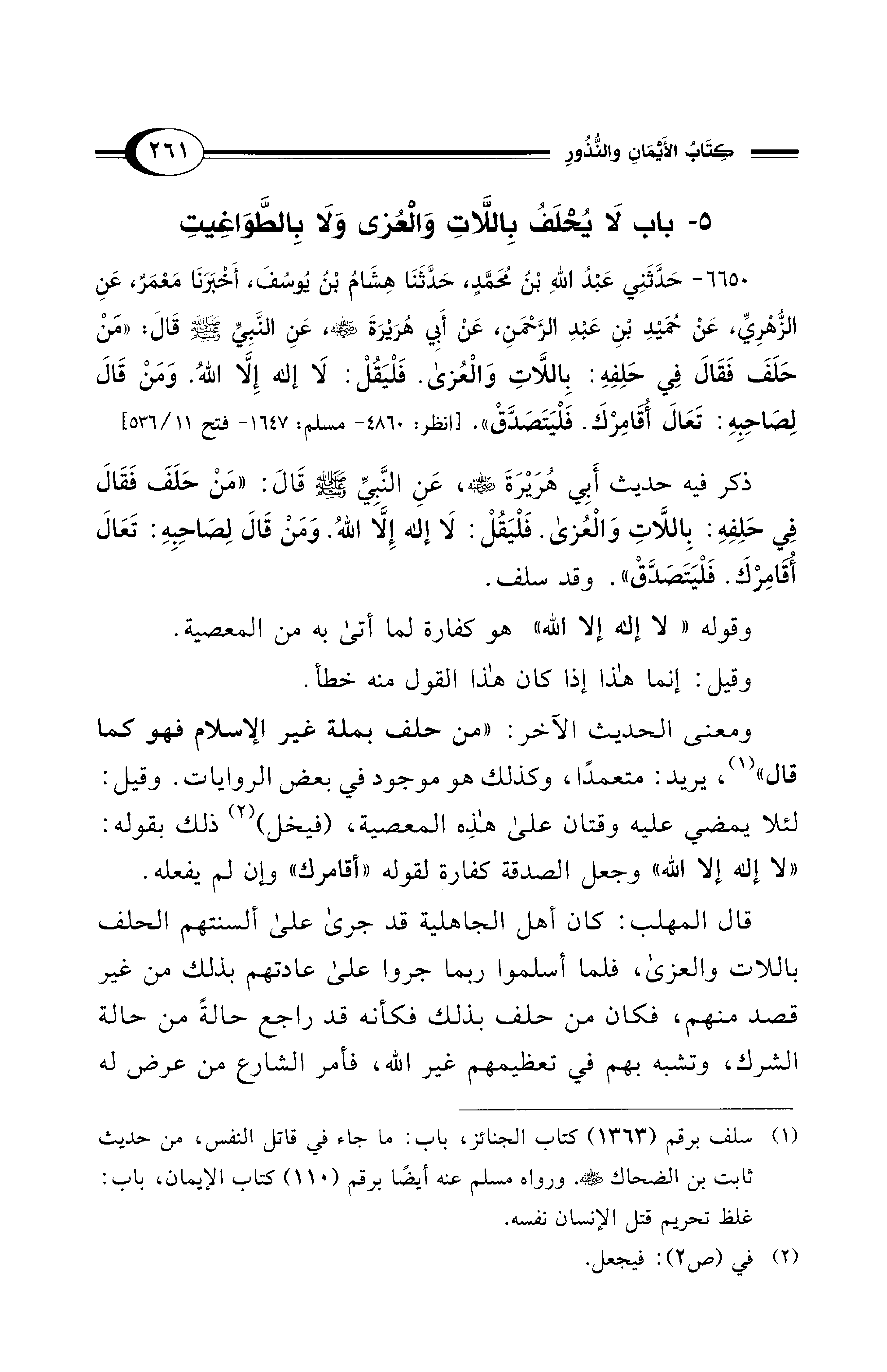 حَلَفَ فَقَالَ فِى حَلِفِهِ: بِاللاَّتِ وَالْعُزَّى. فَلْيَقُلْ: لاَ إِلَهَ إِلاَّ اللَّهُ. وَمَنْ قَالَ لِصَاحِبِهِ تَعَالَ أُقَامِرْكَ. فَلْيَتَصَدَّقْ» [انظر: 4860 - مسلم: 1647 - فتح 11/ 536].