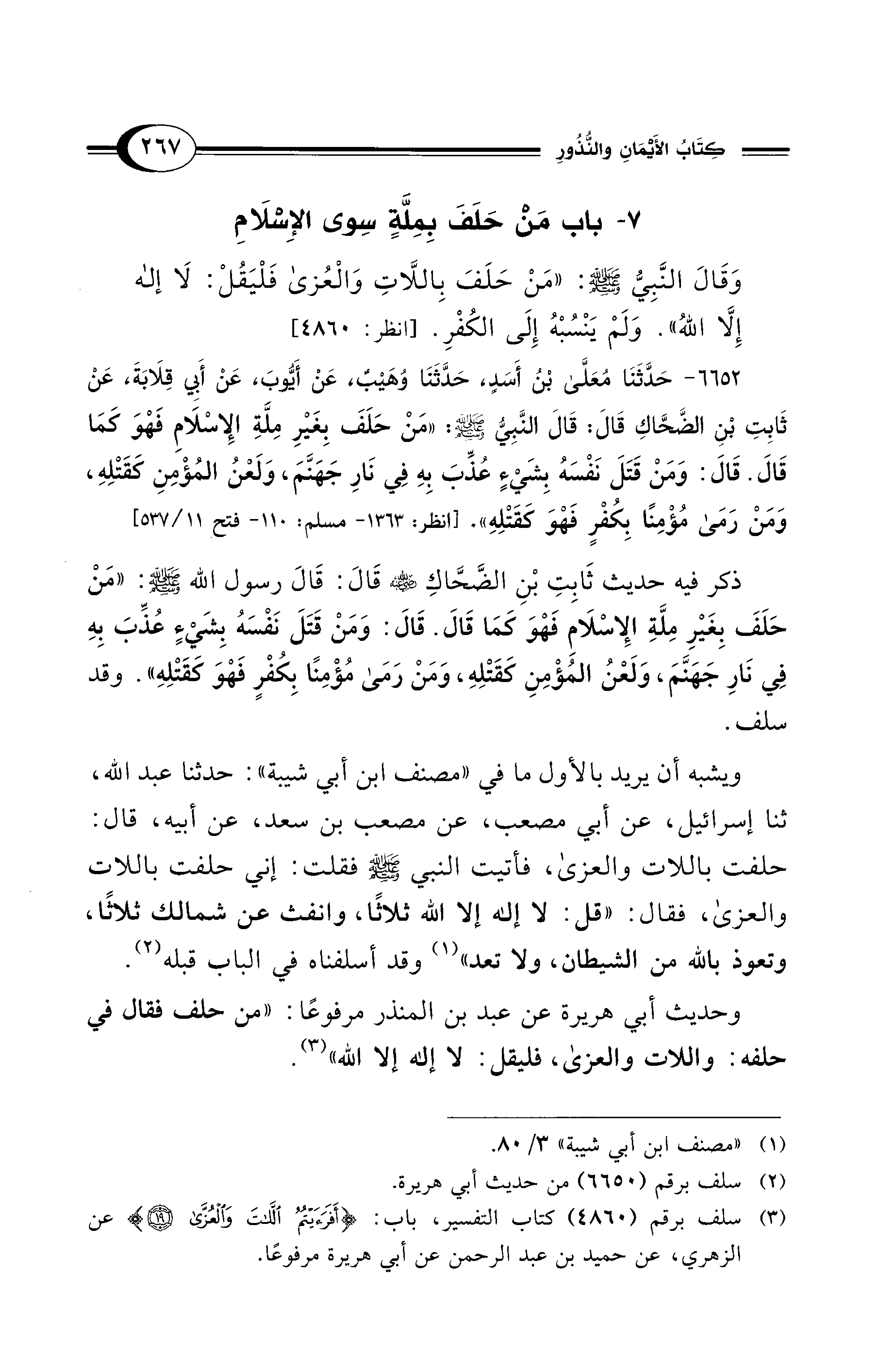 وَقَالَ النَّبِيُّ - صلى الله عليه وسلم -: «مَنْ حَلَفَ بِاللاَّتِ وَالْعُزَّى فَلْيَقُلْ: لاَ إِلَهَ إِلاَّ اللهُ». وَلَمْ يَنْسُبْهُ إِلَى الكُفْرِ. [انظر: 4860].