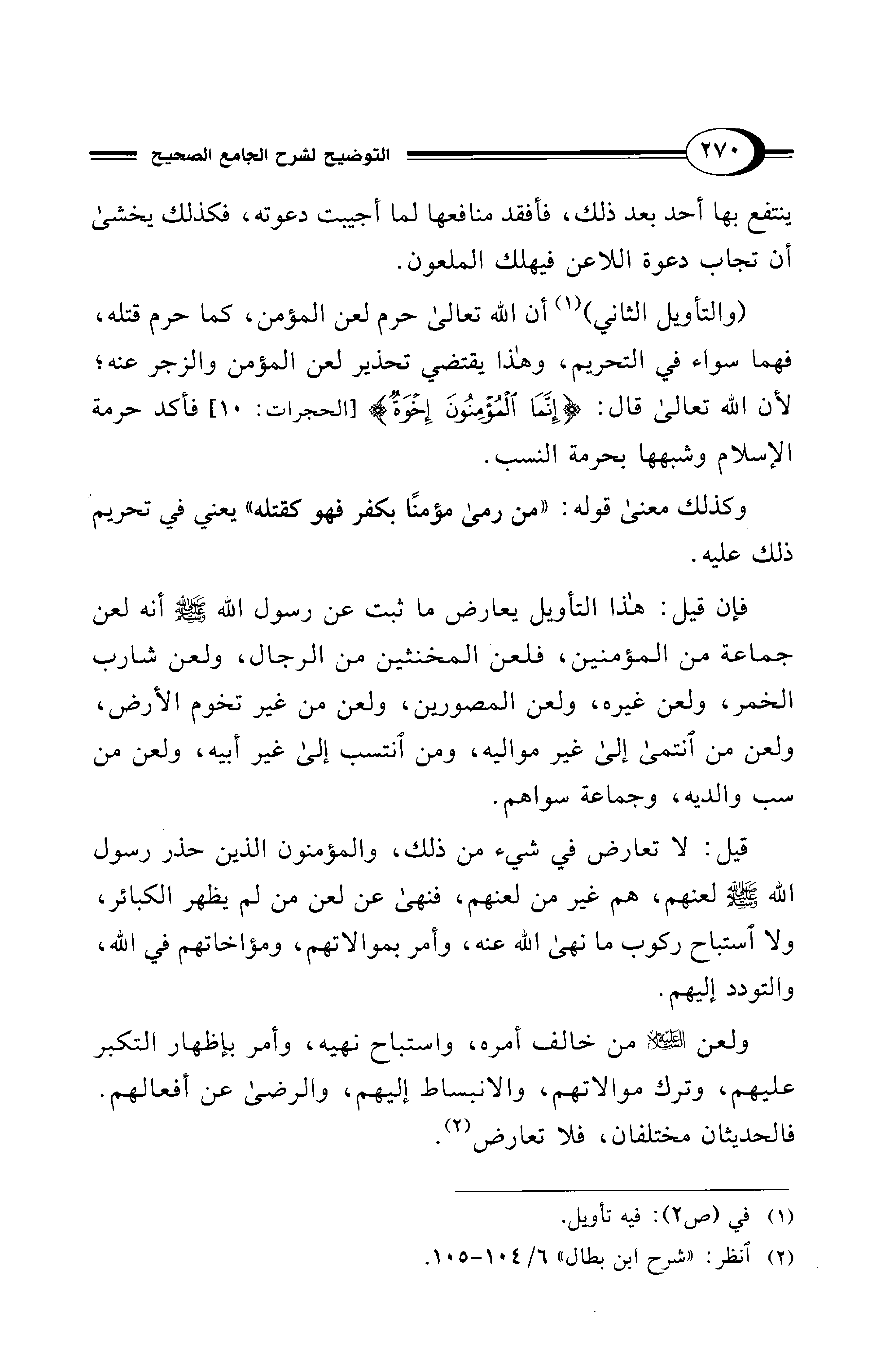 (والتأويل الثاني) (¬1) أن الله تعالى حرم لعن المؤمن، كما حرم قتله، فهما سواء في التحريم، وهذا يقتضي تحذير لعن المؤمن والزجر عنه؛ لأن الله تعالى قال: {إِنَّمَا الْمُؤْمِنُونَ إِخْوَةٌ} [الحجرات: 10]، فأكد حرمة الإسلام وشبهها بحرمة النسب.