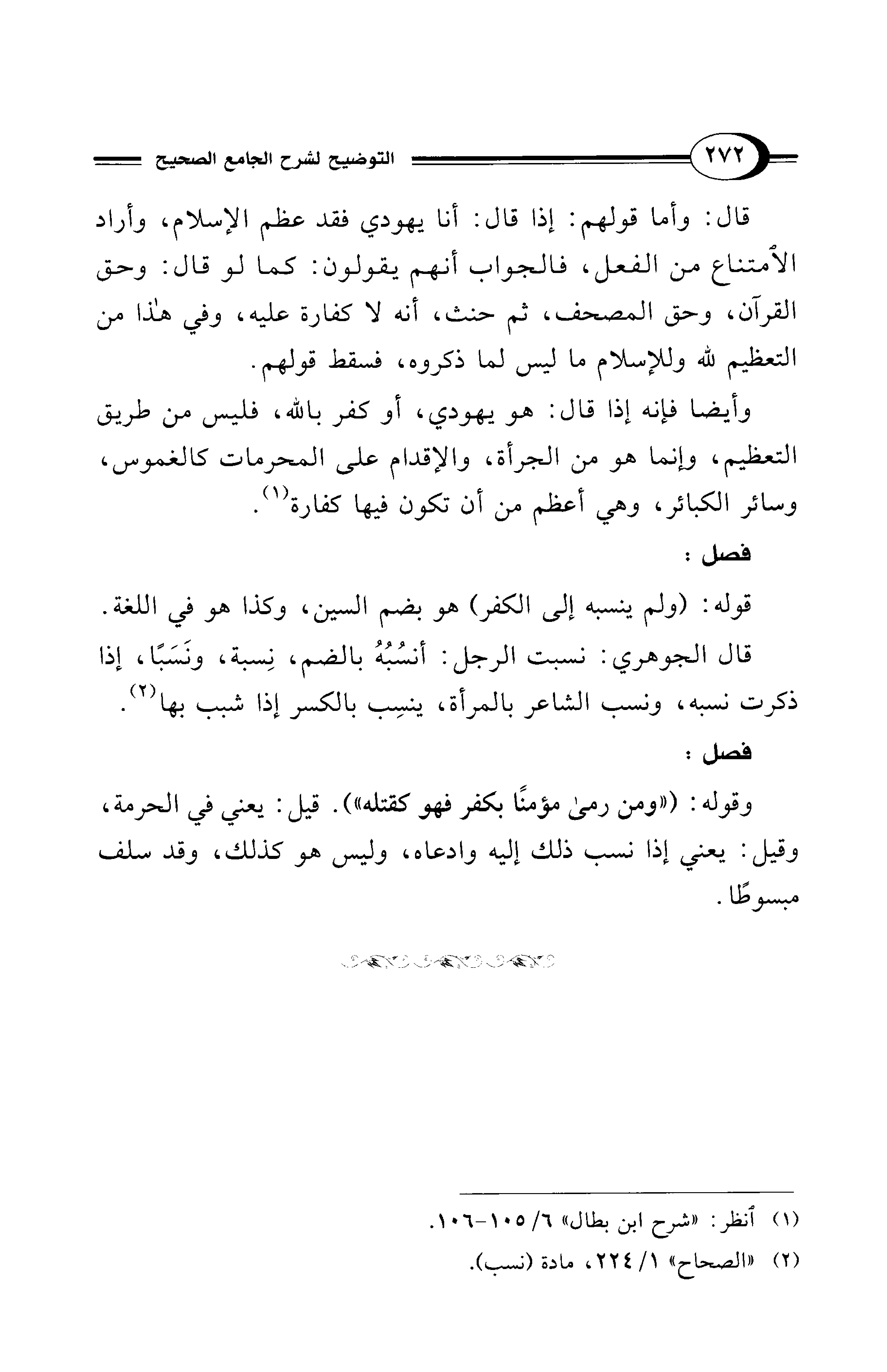 قوله: (ولم ينسبه إلى الكفر) هو بضم السين، وكذا هو في اللغة.