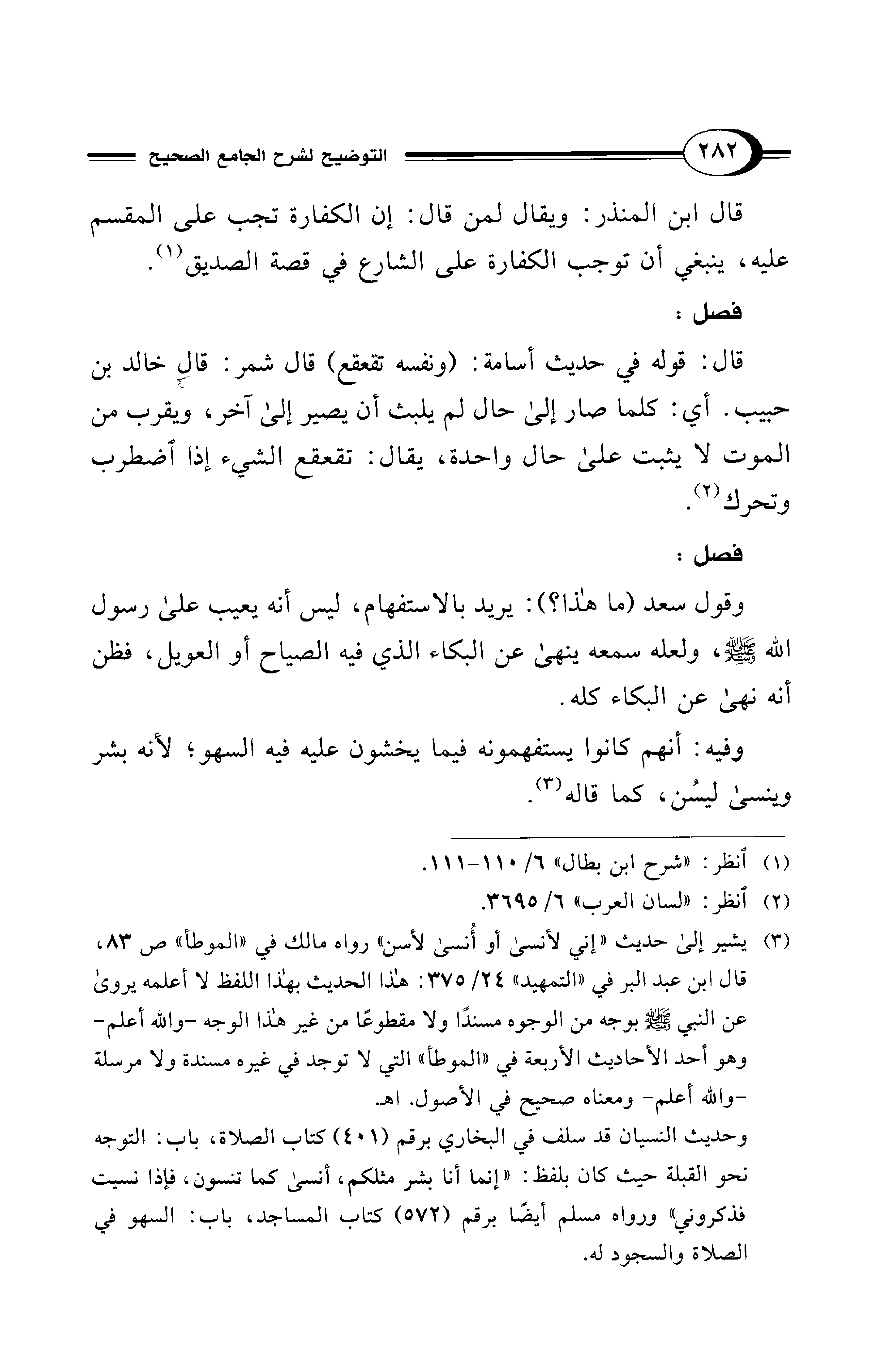 (¬3) يشير إلى حديث "إني لأنسى أو أُنسى لأسن" رواه مالك في "الموطأ" ص 83، قال ابن عبد البر في "التمهيد" 24/ 375: هذا الحديث بهذا اللفظ أعلمه يروى عن النبي - صلى الله عليه وسلم - بوجه من الوجوه مسندًا ولا مقطوعًا من غير هذا الوجه -والله أعلم- وهو أحد الأحاديث الأربعة في "الموطأ" التي لا توجد في غيره مسندة ولا مرسلة -والله أعلم- ومعناه صحيح في الأصول. اهـ.