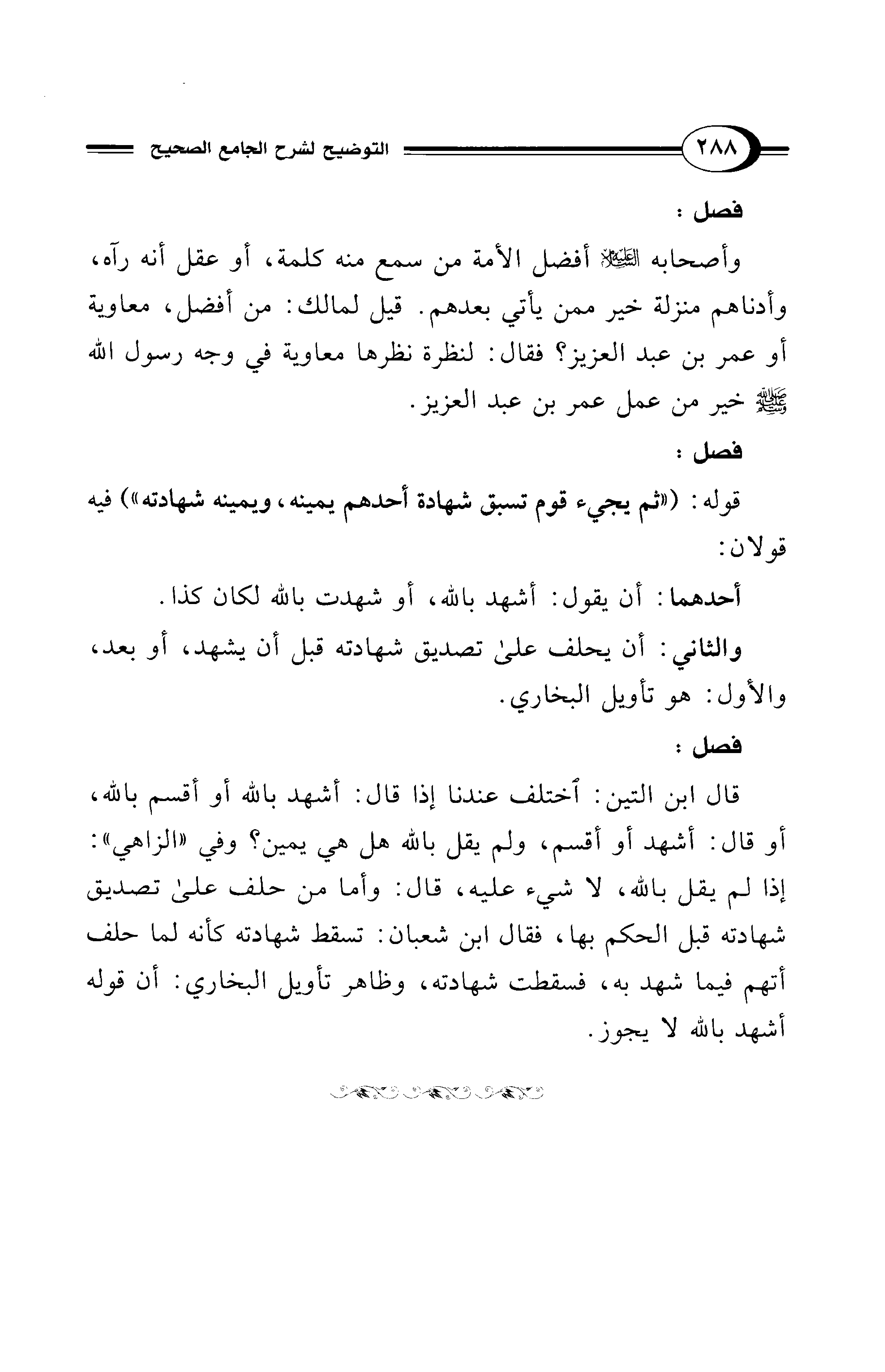 وأصحابه - عليه السلام - أفضل الأمة من سمع منه كلمة، أو عقل أنه رآه، وأدناهم منزلة خير ممن يأتي بعدهم. قيل لمالك: من أفضل، معاوية أو عمر بن عبد العزيز؟ فقال: لنظرة نظرها معاوية في وجه رسول الله - صلى الله عليه وسلم - خير من عمل عمر بن عبد العزيز.