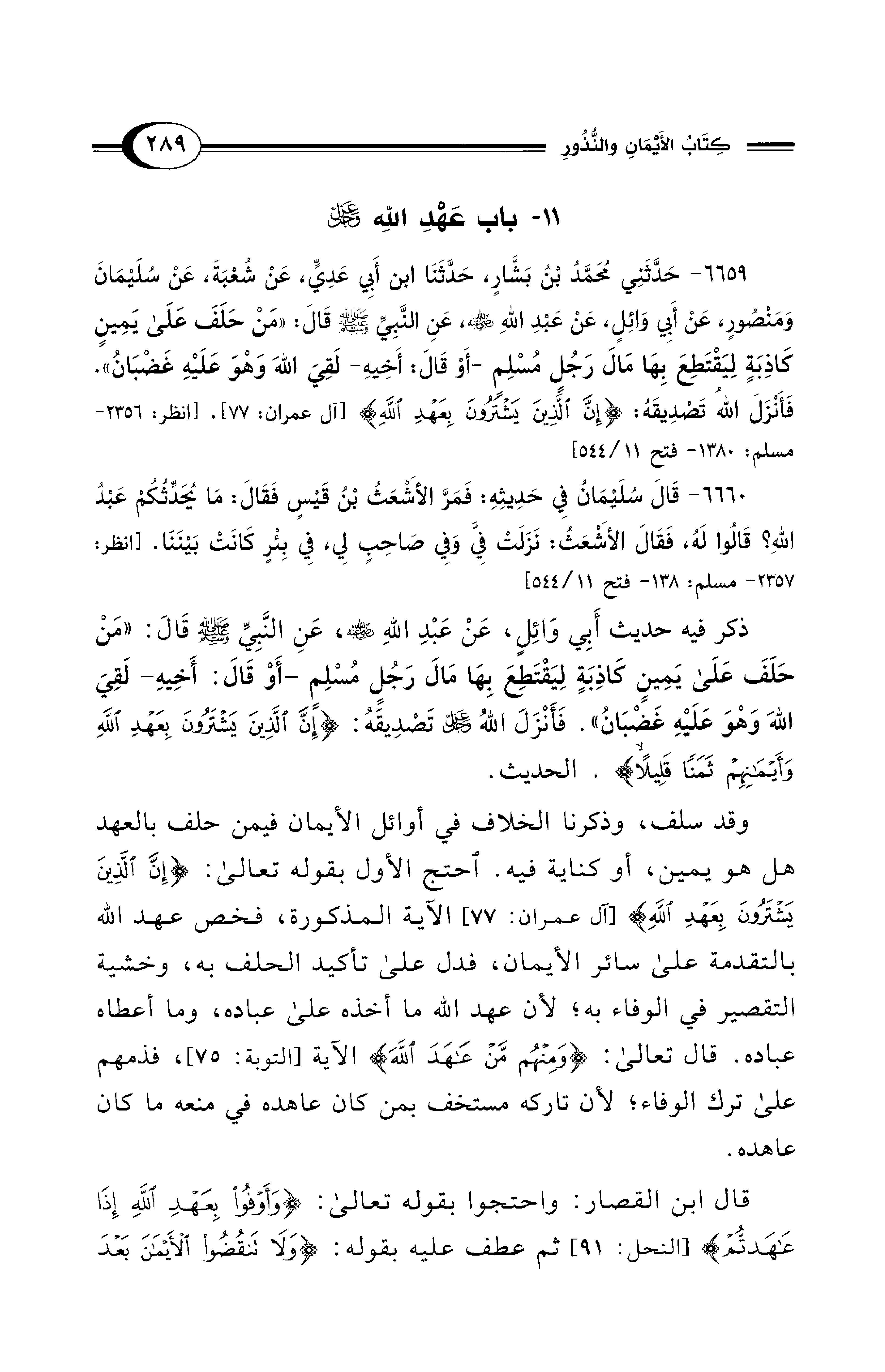 ذكر فيه حديث أَبِي وَائِلٍ، عَنْ عَبْدِ اللهِ - رضي الله عنه -، عَنِ النَّبِيِّ - صلى الله عليه وسلم -:قَالَ: "مَنْ حَلَفَ عَلَى يَمِينٍ كَاذِبَةٍ لِيَقْتَطِعَ بِهَا مَالَ رَجُلٍ مُسْلِمٍ -أَوْ قَالَ: أَخِيهِ- لَقِيَ اللهَ وَهْوَ عَلَيْهِ غَضْبَانُ". فَأَنْزَلَ اللهُ -عَزَّ وَجَلَّ- تصديقه: {إِنَّ الَّذِينَ يَشْتَرُونَ بِعَهْدِ اللهِ ثَمَنًا قَلِيلًا}. الحديث.