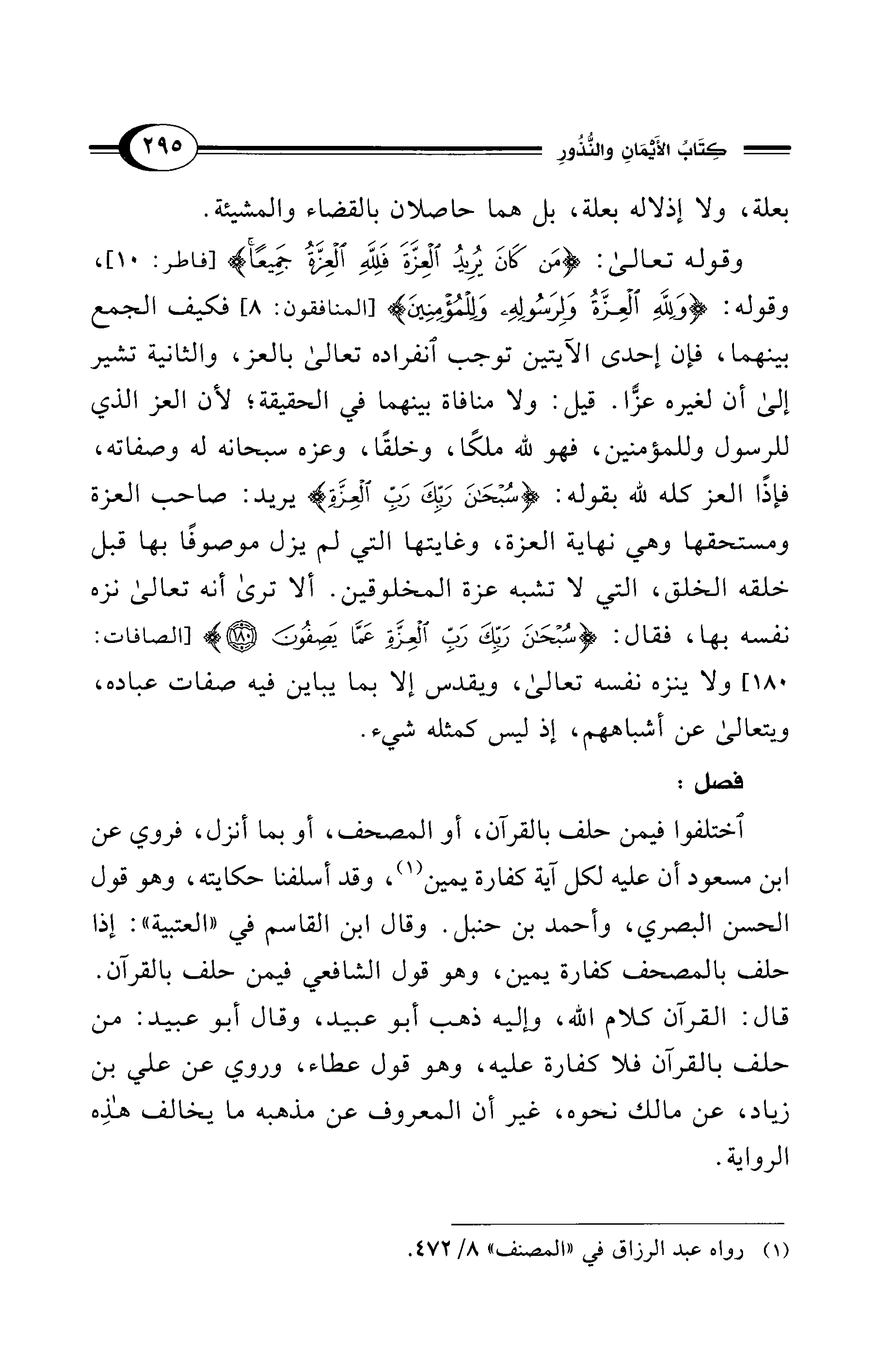 وقوله تعالى: {مَنْ كَانَ يُرِيدُ الْعِزَّةَ فَلِلَّهِ الْعِزَّةُ جَمِيعًا} [فاطر: 10]، وقوله: {وَلِلَّهِ الْعِزَّةُ وَلِرَسُولِهِ وَلِلْمُؤْمِنِينَ} [المنافقون: 8] فكيف الجمع بينهما، فإن إحدى الآيتين توجب انفراده تعالى بالعز، والثانية تشير إلى أن لغيره عزًّا. قيل: ولا منافاة بينهما في الحقيقة؛ لأن العز الذي للرسول وللمؤمنين، فهو لله ملكًا، وخلقًا، وعزه سبحانه له وصفاته، فإذًا العز كله لله بقوله: {سُبْحَانَ رَبِّكَ رَبِّ الْعِزَّةِ} يريد: صاحب العزة ومستحقها وهي نهاية العزة، وغايتها التي لم يزل موصوفًا بها قبل خلقه الخلق، التي لا تشبه عزة المخلوقين. ألا ترى أنه تعالى نزه نفسه بها، فقال: {سُبْحَانَ رَبِّكَ رَبِّ الْعِزَّةِ عَمَّا يَصِفُونَ (180)} [الصافات: 180] ولا ينزه نفسه تعالى، ويقدس إلا بما يباين فيه صفات عباده، ويتعالى عن أشباههم، إذ ليس كمثله شيء.