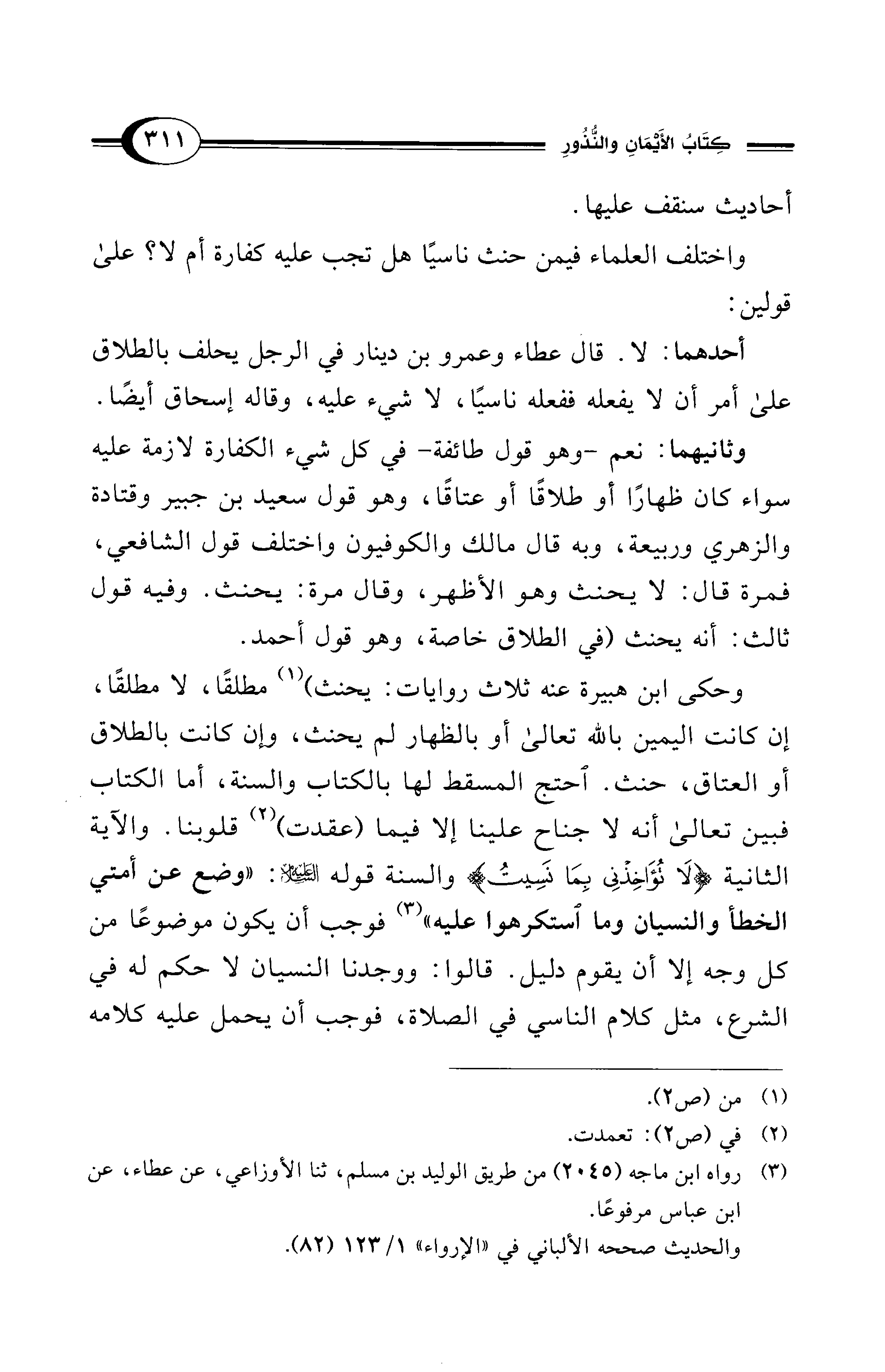 وثانيهما: نعم -وهو قول طائفة- في كل شيء الكفارة لازمة عليه سواء كان ظهارًا أو طلاقًا أو عتاقًا، وهو قول سعيد بن جبير وقتادة والزهري وربيعة، وبه قال مالك والكوفيون واختلف قول الشافعي، فمرة قال: لا يحنث وهو الأظهر، وقال مرة: يحنث. وفيه قول ثالث: أنه يحنث (في الطلاق خاصة، وهو قول أحمد.