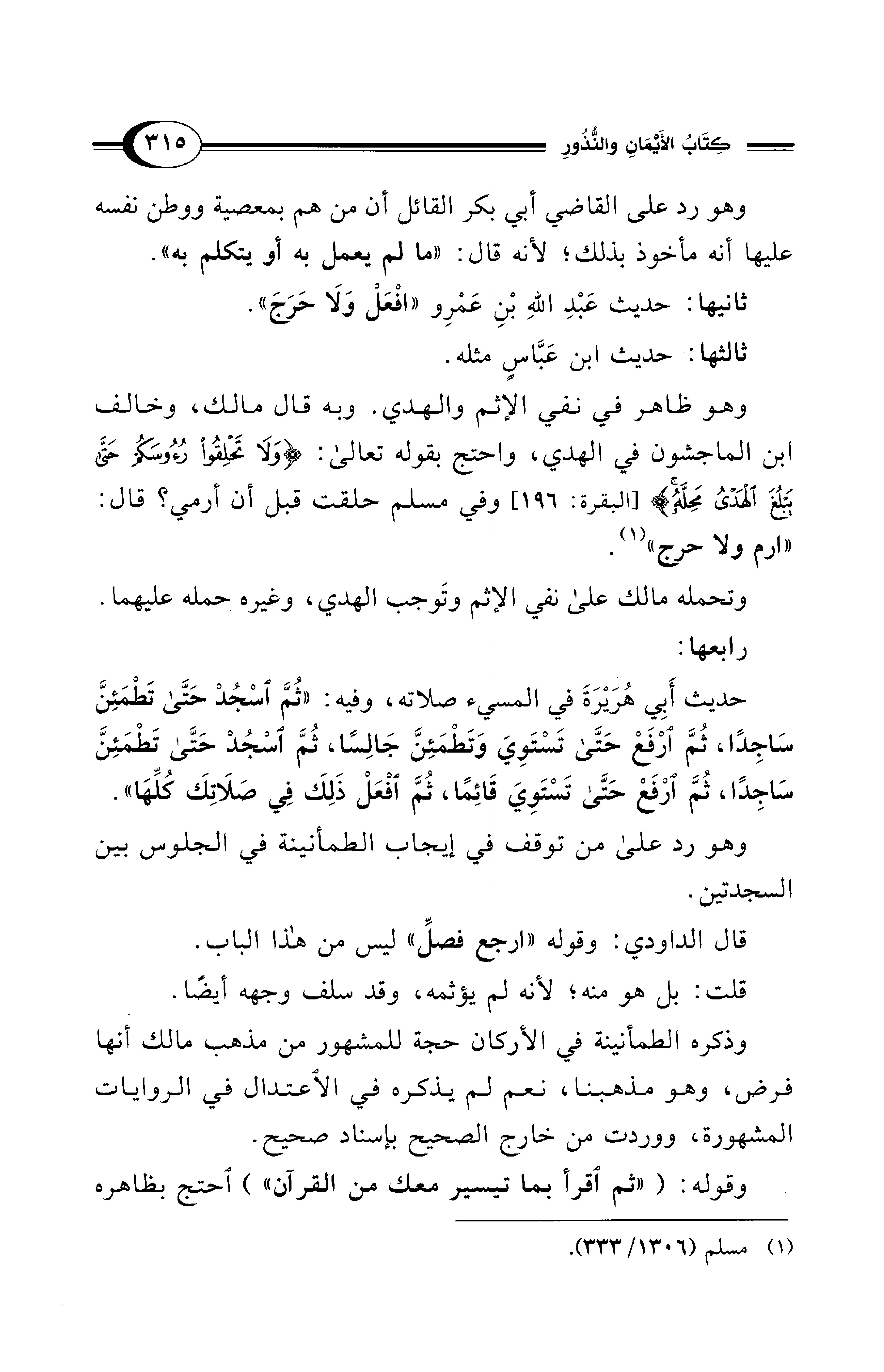 وذكره الطمأنينة في الأركان حجة للمشهور من مذهب مالك أنها فرض، وهو مذهبنا، نعم لم يذكره في الاعتدال في الروايات المشهورة، ووردت من خارج الصحيح بإسناد صحيح.