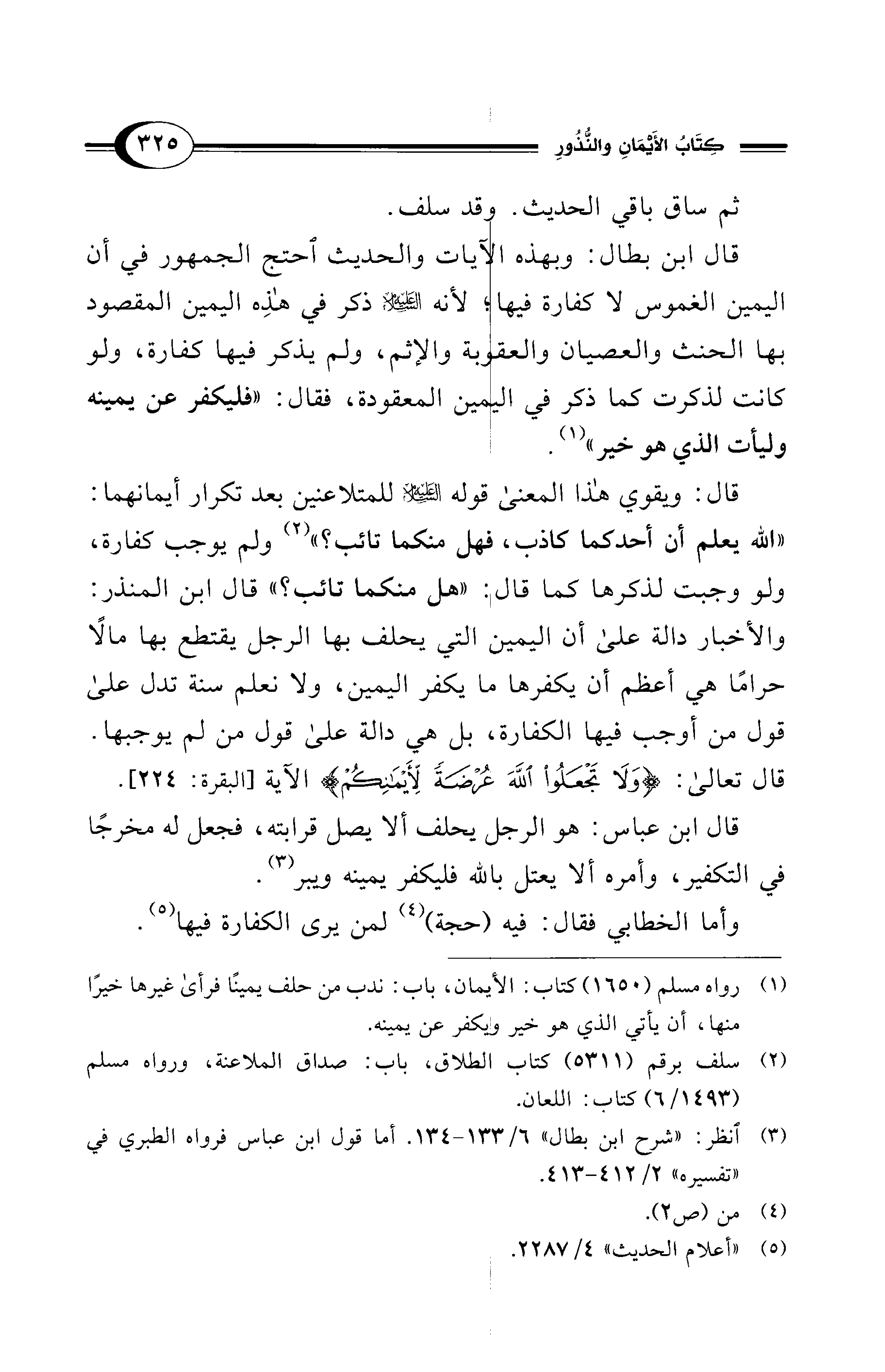 قال: ويقوي هذا المعنى قوله - عليه السلام - للمتلاعنين بعد تكرار أيمانهما: "الله يعلم أن أحدكما كاذب، فهل منكما تائب؟ " (¬2) ولم يوجب كفارة، ولو وجبت لذكرها كما قال: "هل منكما تائب؟ " قال ابن المنذر: والأخبار دالة على أن اليمين التي يحلف بها الرجل يقتطع بها مالاً حرامًا هي أعظم أن يكفرها ما يكفر اليمين، ولا نعلم سنة تدل على قول من أوجب فيها الكفارة، بل هي دالة على قول من لم يوجبها. قال تعالى: {وَلَا تَجْعَلُوا اللهَ عُرْضَةً لِأَيْمَانِكُمْ} الآية [البقرة: 224].
