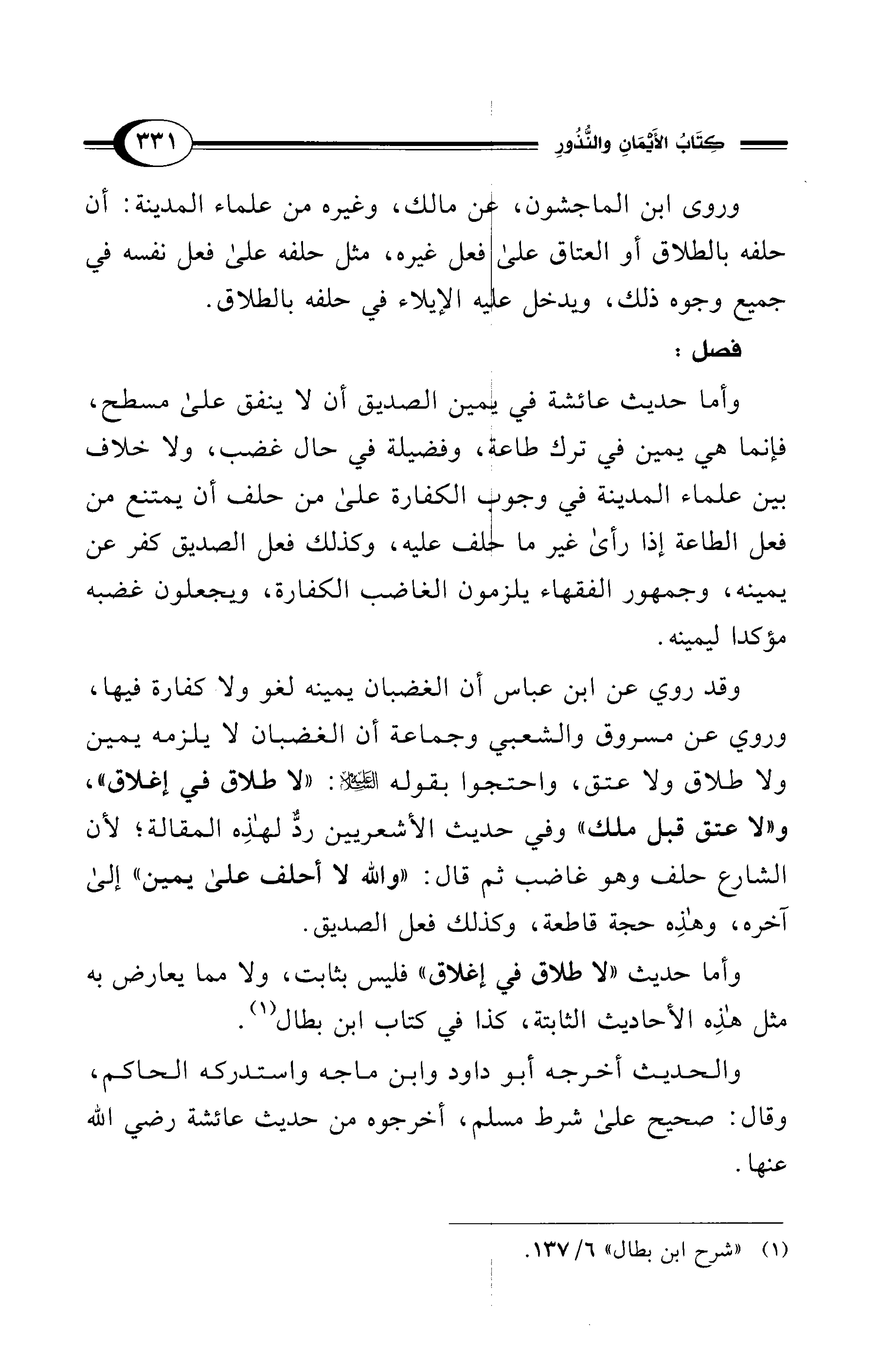 وأما حديث عائشة في يمين الصديق أن لا ينفق على مسطح، فإنما هي يمين في ترك طاعة، وفضيلة في حال غضب، ولا خلاف بين علماء المدينة في وجوب الكفارة على من حلف أن يمتنع من فعل الطاعة إذا رأى غير ما حلف عليه، وكذلك فعل الصديق كفر عن يمينه، وجمهور الفقهاء يلزمون الغاضب الكفارة، ويجعلون غضبه مؤكدا ليمينه.