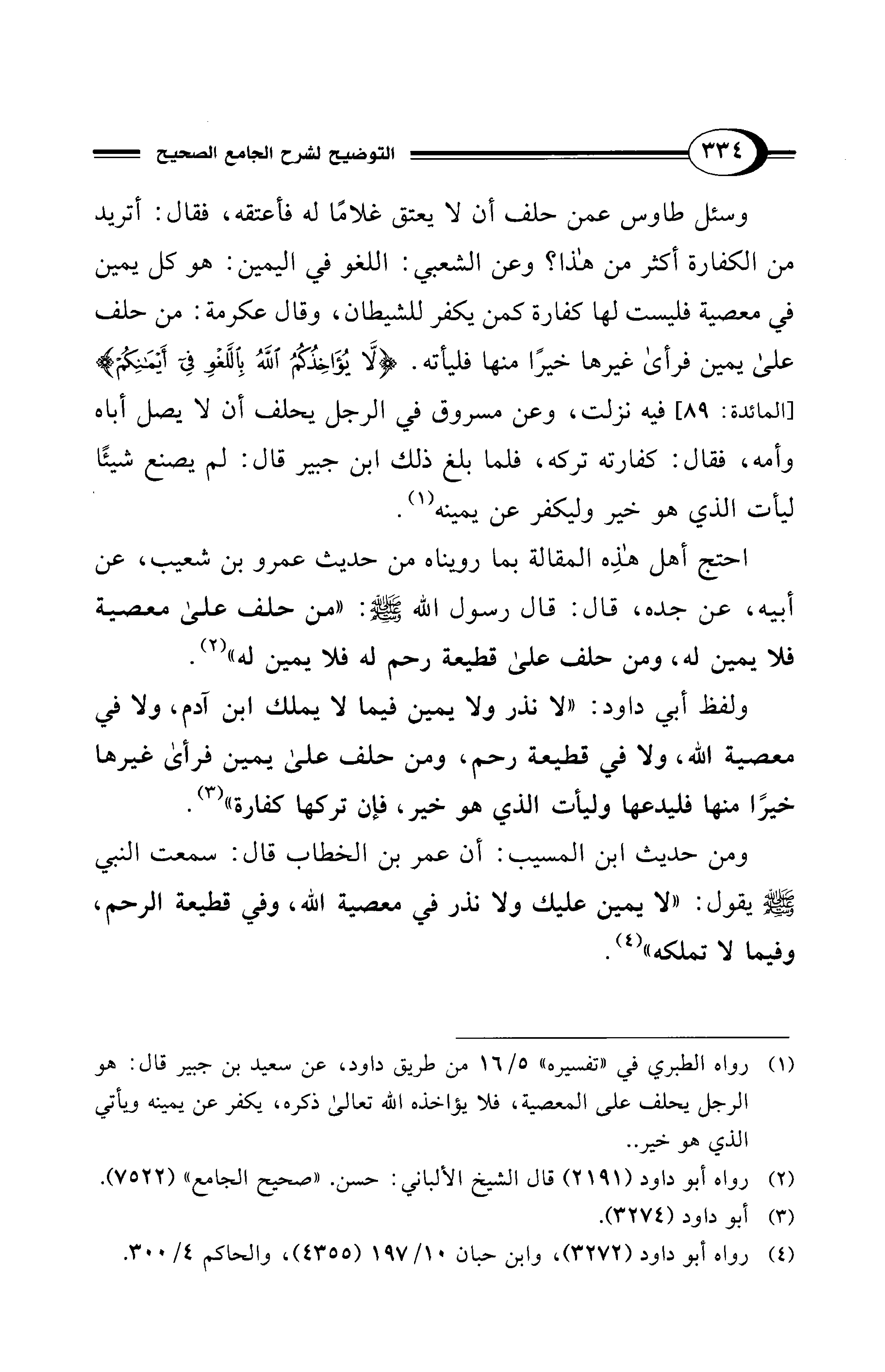 ولفظ أبي داود: "لا نذر ولا يمين فيما لا يملك ابن آدم، ولا في معصية الله، ولا في قطيعة رحم، ومن حلف على يمين فرأى غيرها خيرًا منها فليدعها وليأت الذي هو خير، فإن تركها كفارة" (¬3).