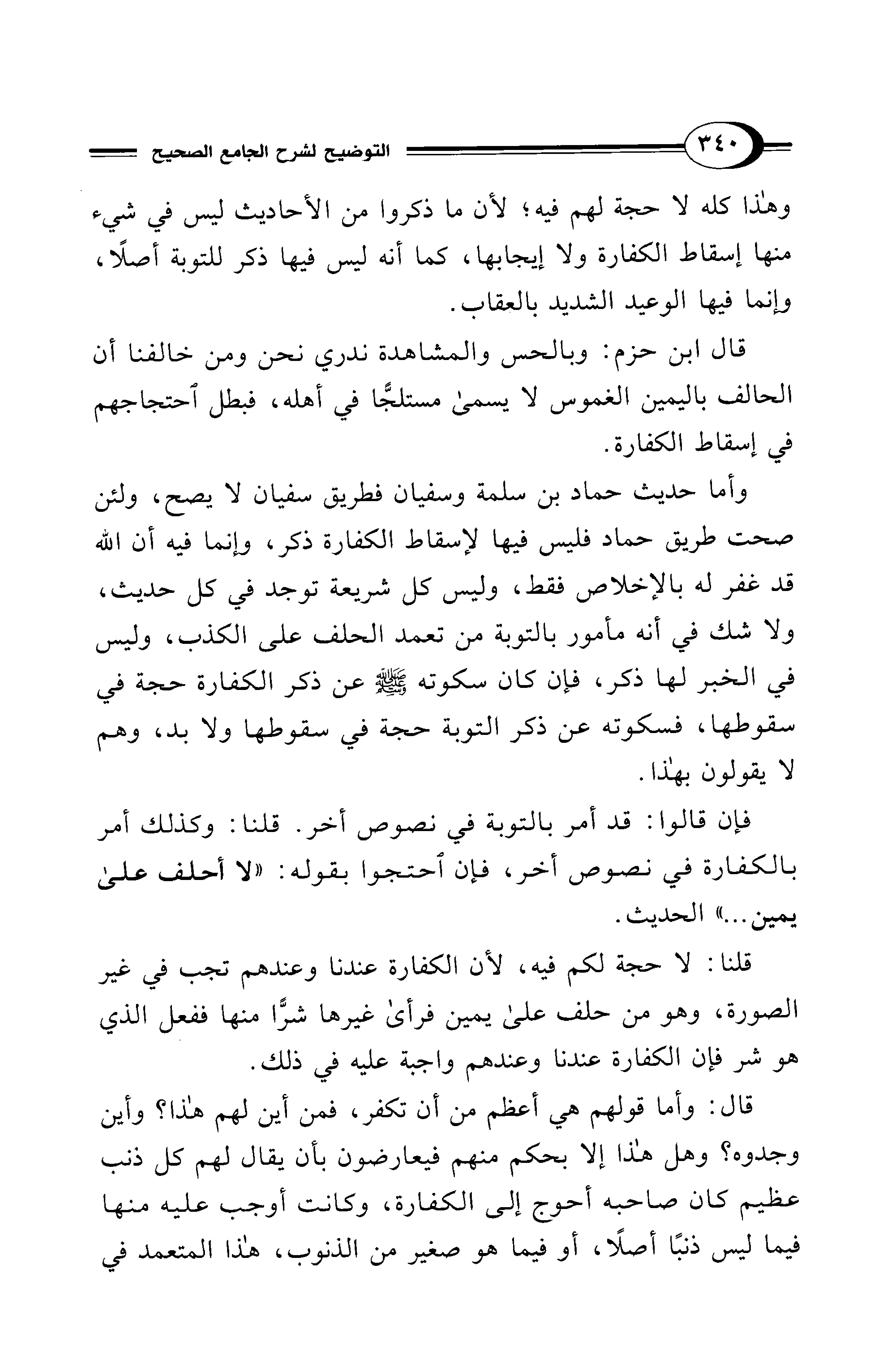 وأما حديث حماد بن سلمة وسفيان فطريق سفيان لا يصح، ولئن صحت طريق حماد فليس فيها لإسقاط الكفارة ذكر، وإنما فيه أن الله قد غفر له بالإخلاص فقط، وليس كل شريعة توجد في كل حديث، ولا شك في أنه مأمور بالتوبة من تعمد الحلف على الكذب، وليس في الخبر لها ذكر، فإن كان سكوته - صلى الله عليه وسلم - عن ذكر الكفارة حجة في سقوطها، فسكوته عن ذكر التوبة حجة في سقوطها ولا بد، وهم لا يقولون بهذا.