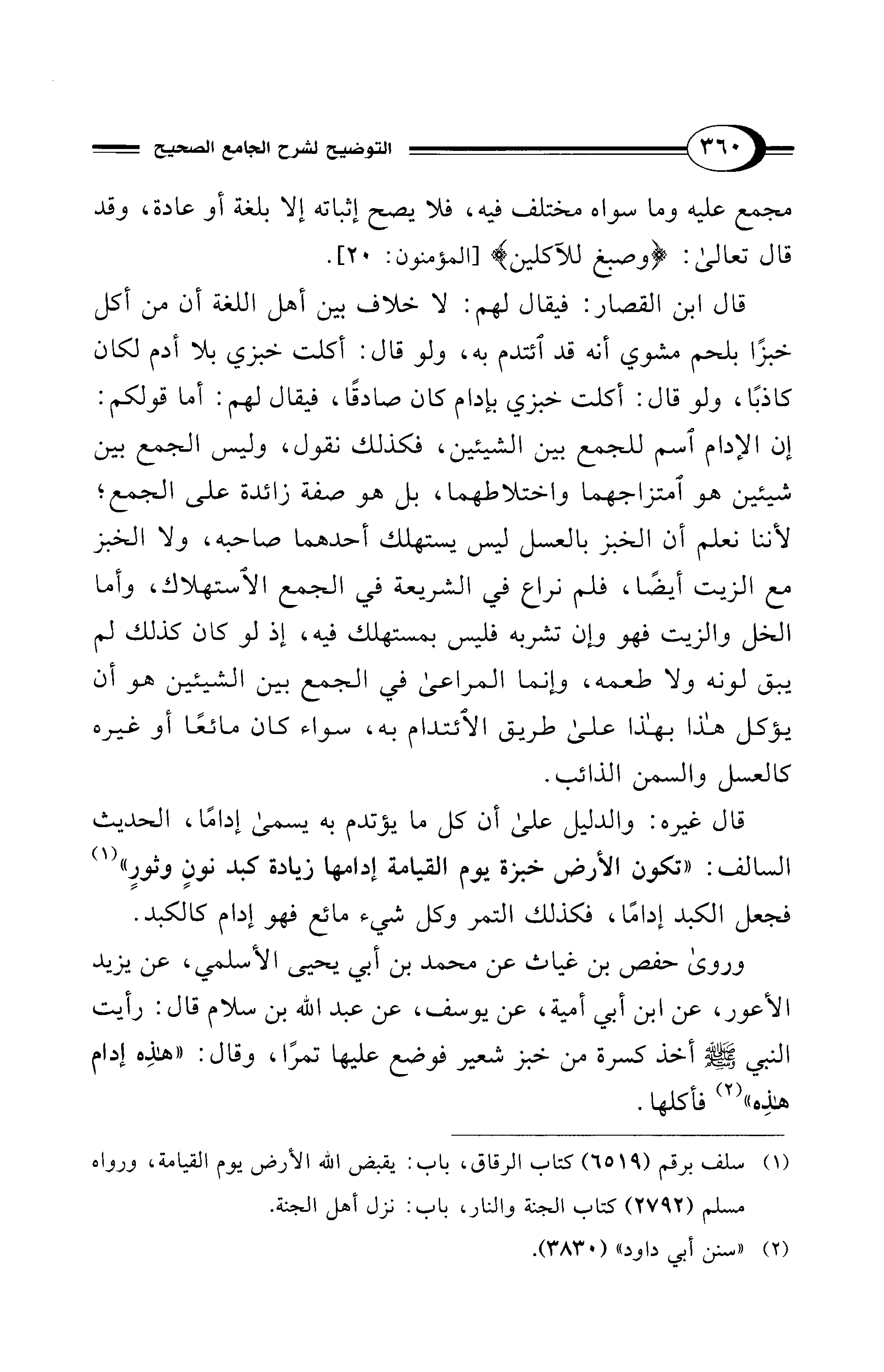 قال ابن القصار: فيقال لهم: لا خلاف بين أهل اللغة أن من أكل خبزًا بلحم مشوي أنه قد ائتدم به، ولو قال: أكلت خبزي بلا أدم لكان كاذبًا، ولو قال: أكلت خبزي بإدام كان صادقًا، فيقال لهم: أما قولكم: إن الإدام اسم للجمع بين الشيئين، فكذلك نقول، وليس الجمع بين شيئين هو امتزاجهما واختلاطهما، بل هو صفة زائدة على الجمع؛ لأننا نعلم أن الخبز بالعسل ليس يستهلك أحدهما صاحبه، ولا الخبز مع الزيت أيضًا، فلم نراع في الشريعة في الجمع الاستهلاك، وأما الخل والزيت فهو وإن تشربه فليس بمستهلك فيه، إذ لو كان كذلك لم يبق لونه ولا طعمه، وإنما المراعى في الجمع بين الشيئين هو أن يؤكل هذا بهذا على طريق الائتدام به، سواء كان مائعًا أو غيره كالعسل والسمن الذائب.