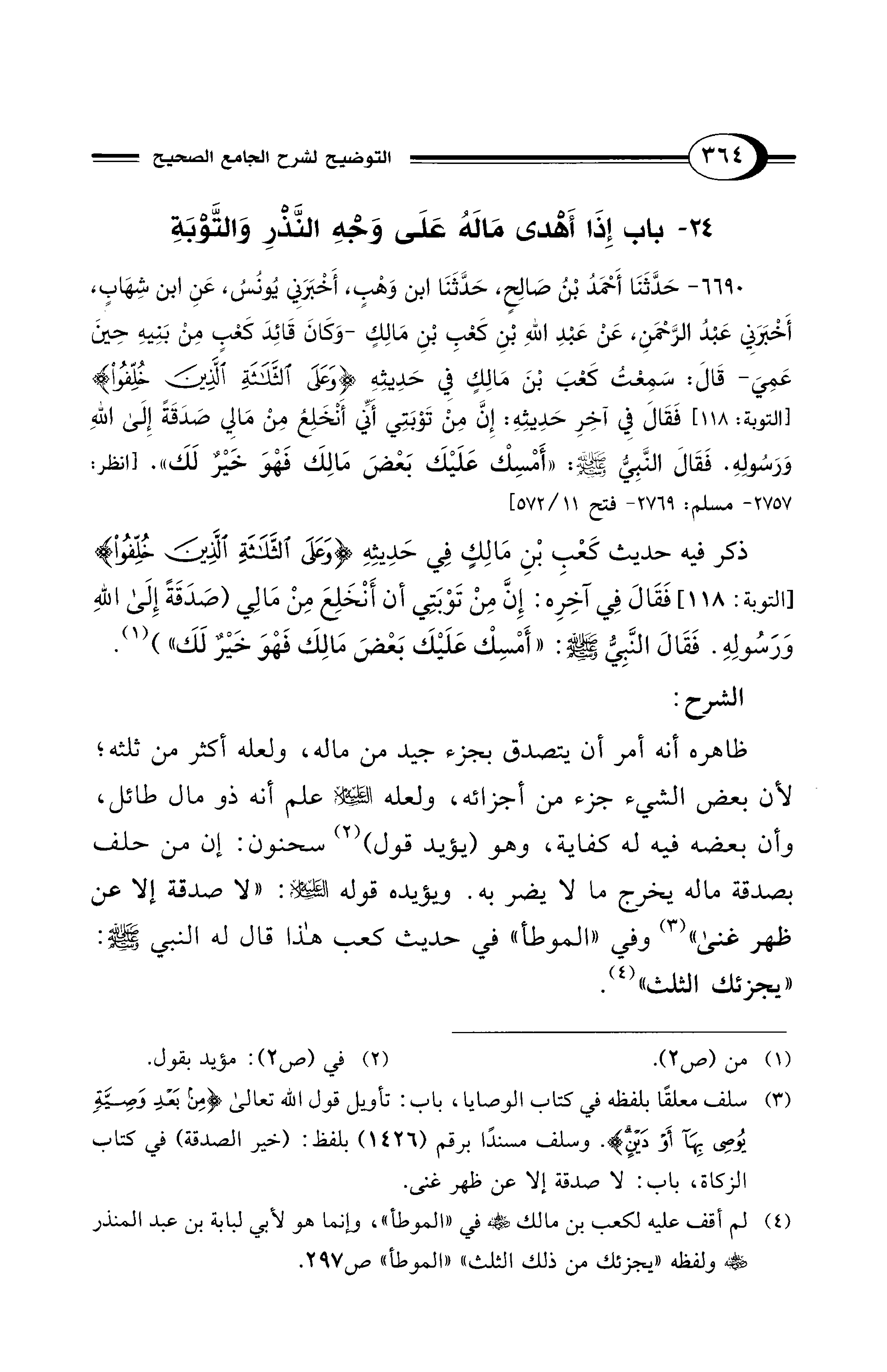ذكر فيه حديث كَعْبِ بْنِ مَالِكٍ فِي حَدِيثِهِ {وَعَلَى الثَّلَاثَةِ الَّذِينَ خُلِّفُوا} [التوبة: 118] فَقَالَ فِي آخِرِه: إِنَّ مِنْ تَوْبَتِي أن أَنْخَلِعَ مِنْ مَالِي (صَدَقَةً إلى اللهِ وَرَسُولِهِ. فَقَالَ النَّبِيُّ - صلى الله عليه وسلم -: "أَمْسِكْ عَلَيْكَ بَغضَ مَالِكَ فَهوَ خَيْرٌ لَكَ " (¬1).