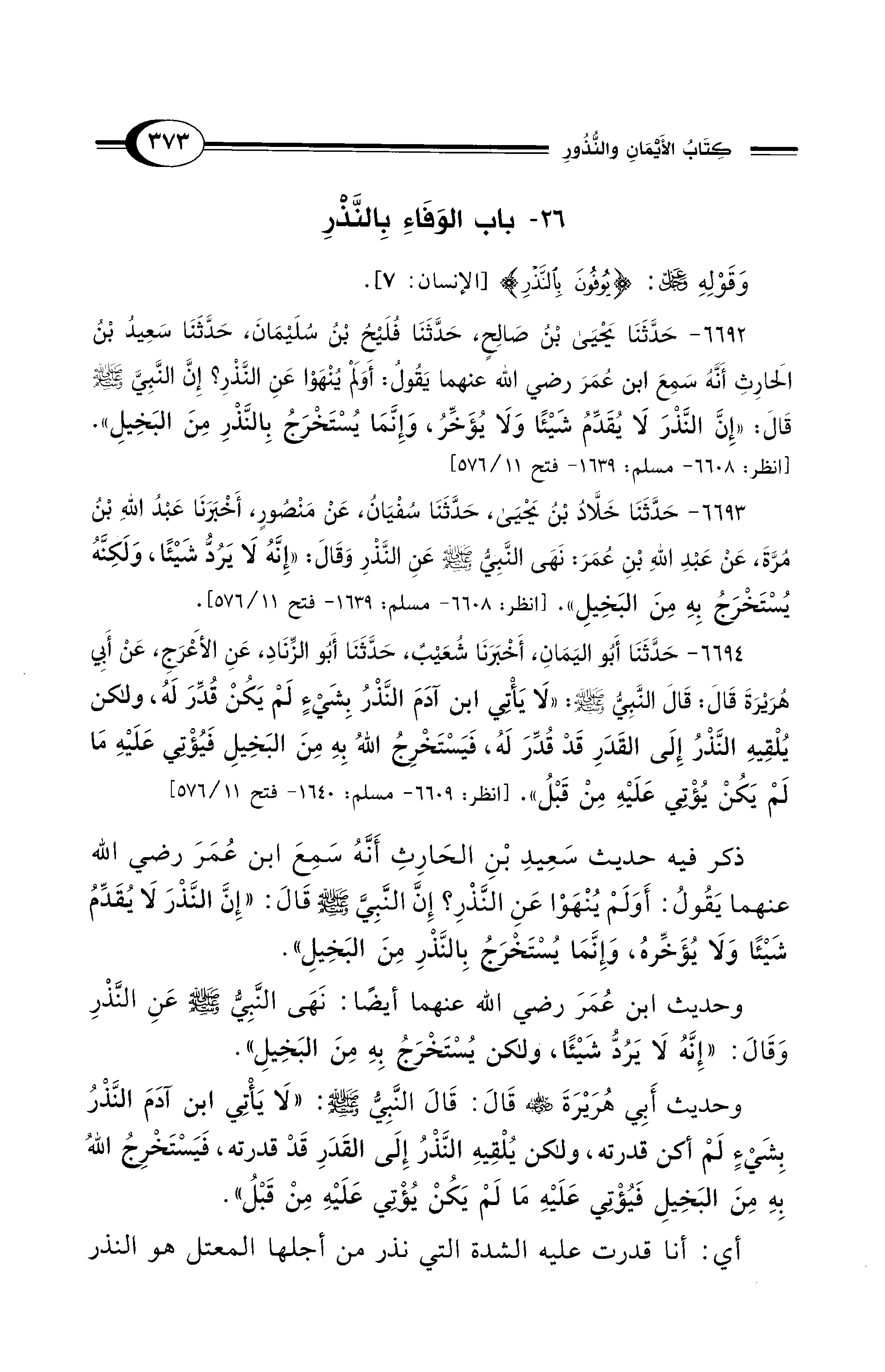 6692 - حَدَّثَنَا يَحْيَى بْنُ صَالِحٍ، حَدَّثَنَا فُلَيْحُ بْنُ سُلَيْمَانَ، حَدَّثَنَا سَعِيدُ بْنُ الْحَارِثِ أَنَّهُ سَمِعَ ابْنَ عُمَرَ - رضي الله عنهما - يَقُولُ: أَوَلَمْ يُنْهَوْا عَنِ النَّذْرِ؟ إِنَّ النَّبِيَّ - صلى الله عليه وسلم - قَالَ: «إِنَّ النَّذْرَ لاَ يُقَدِّمُ شَيْئًا وَلاَ يُؤَخِّرُ، وَإِنَّمَا يُسْتَخْرَجُ بِالنَّذْرِ مِنَ الْبَخِيلِ». [انظر: 6608 - مسلم: 1639 - فتح 11/ 576].