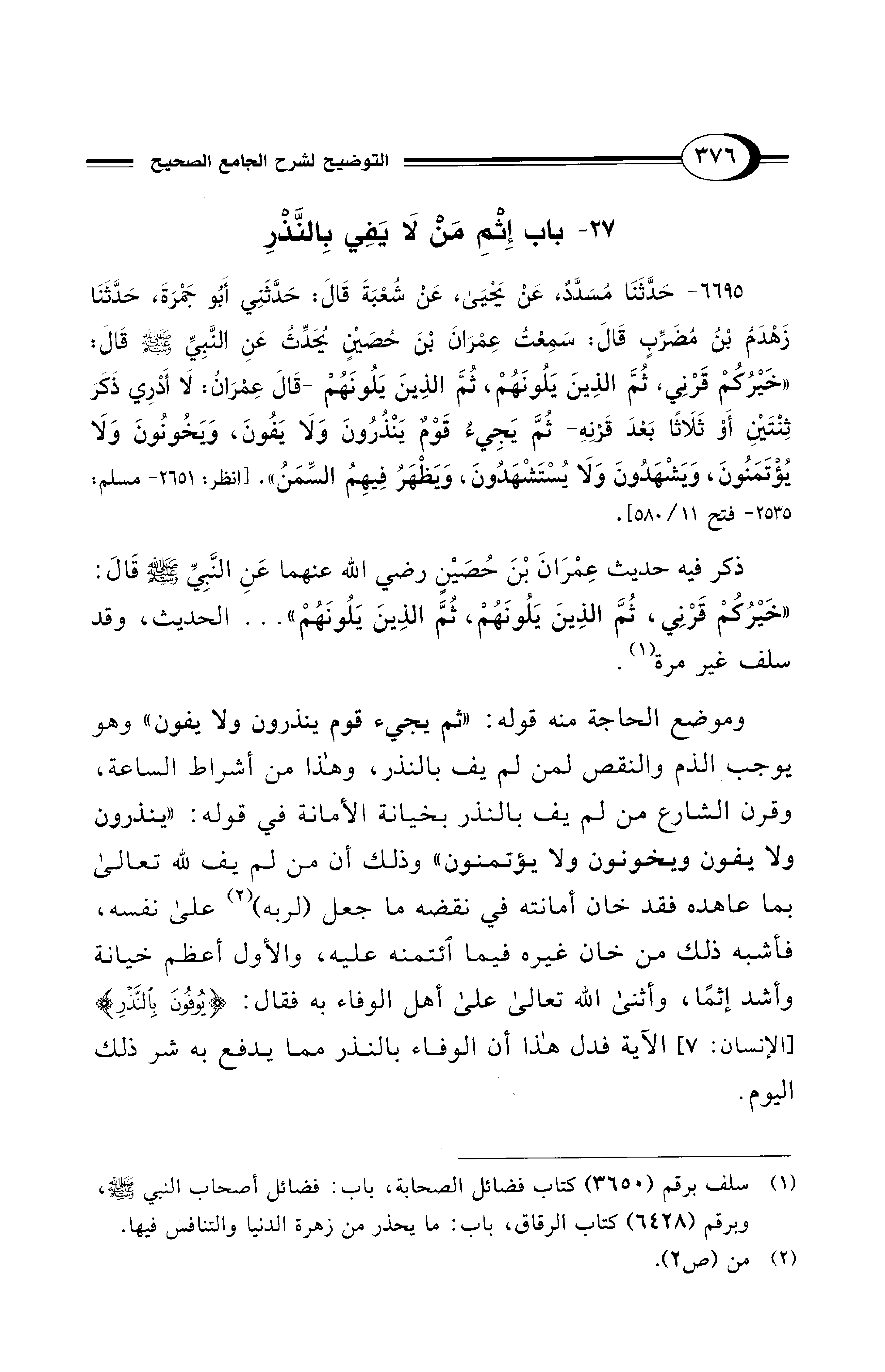 6695 - حَدَّثَنَا مُسَدَّد، عَنْ يَحْيَى، عَنْ شُعْبَةَ قَالَ: حَدَّثَنِي أَبُو جَمْرَةَ، حَدَّثَنَا زَهْدَمُ بْنُ مُضَرِّبٍ قَالَ: سَمِعْتُ عِمْرَانَ بْنَ حُصَيْنٍ يُحَدِّثُ عَنِ النَّبِيِّ - صلى الله عليه وسلم - قَالَ: «خَيْرُكُمْ قَرْنِي، ثُمَّ الَّذِينَ يَلُونَهُمْ، ثُمَّ الَّذِينَ يَلُونَهُمْ -قَالَ عِمْرَانُ: لاَ أَدْرِي ذَكَرَ ثِنْتَيْنِ أَوْ ثَلاَثًا بَعْدَ قَرْنِهِ- ثُمَّ يَجِيءُ قَوْمٌ يَنْذُرُونَ وَلاَ يَفُونَ، وَيَخُونُونَ وَلاَ يُؤْتَمَنُونَ، وَيَشْهَدُونَ وَلاَ يُسْتَشْهَدُونَ، وَيَظْهَرُ فِيهِمُ السِّمَنُ» [انظر: 2651 - مسلم: 2535 - فتح 11/ 580].