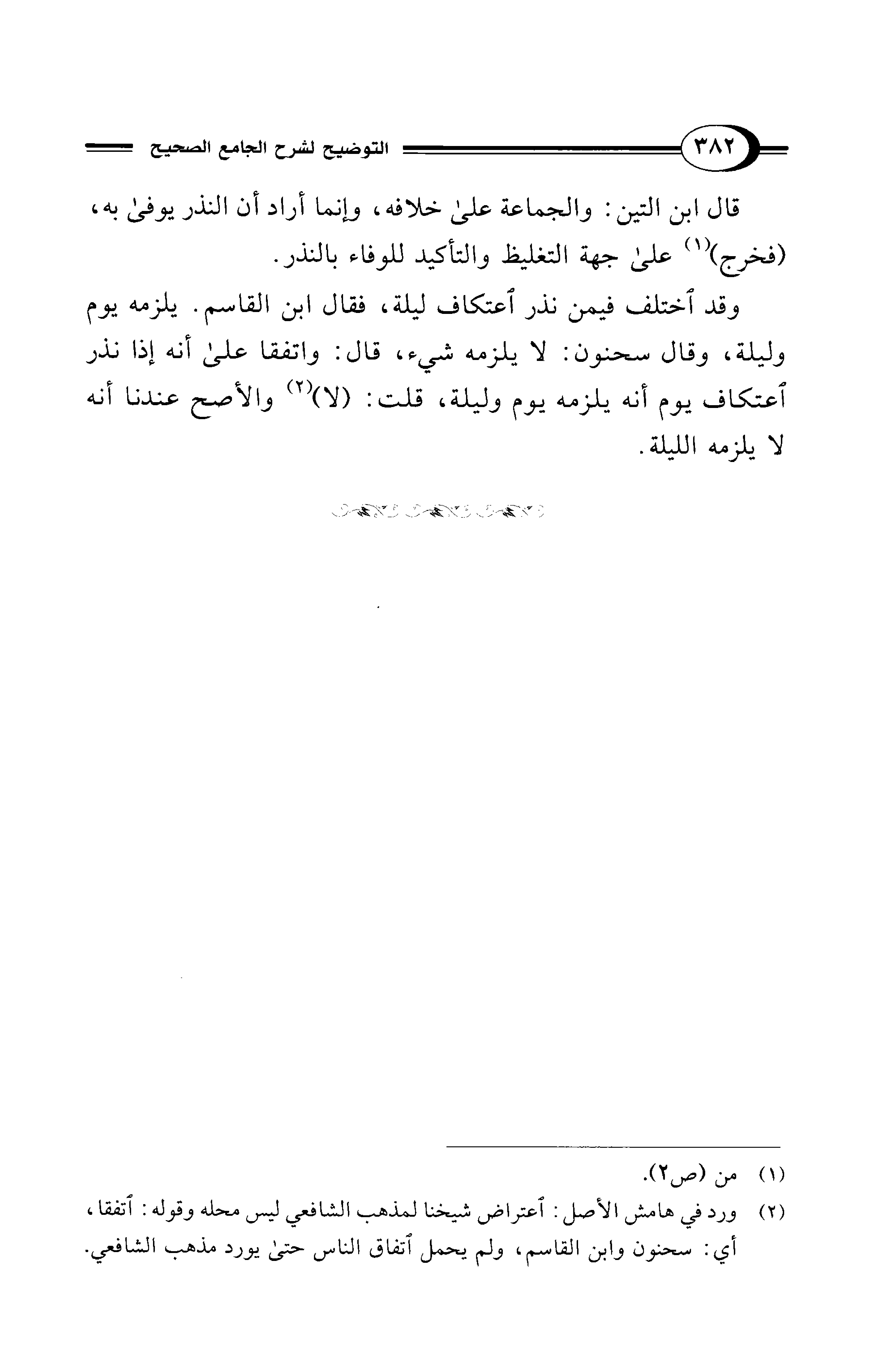 (¬2) ورد في هامش الأصل: اعتراض شيخنا لمذهب الشافعي ليس محله وقوله: اتفقا، أي: سحنون وابن القاسم، ولم يحمل اتفاق الناس حتى يورد مذهب الشافعي.