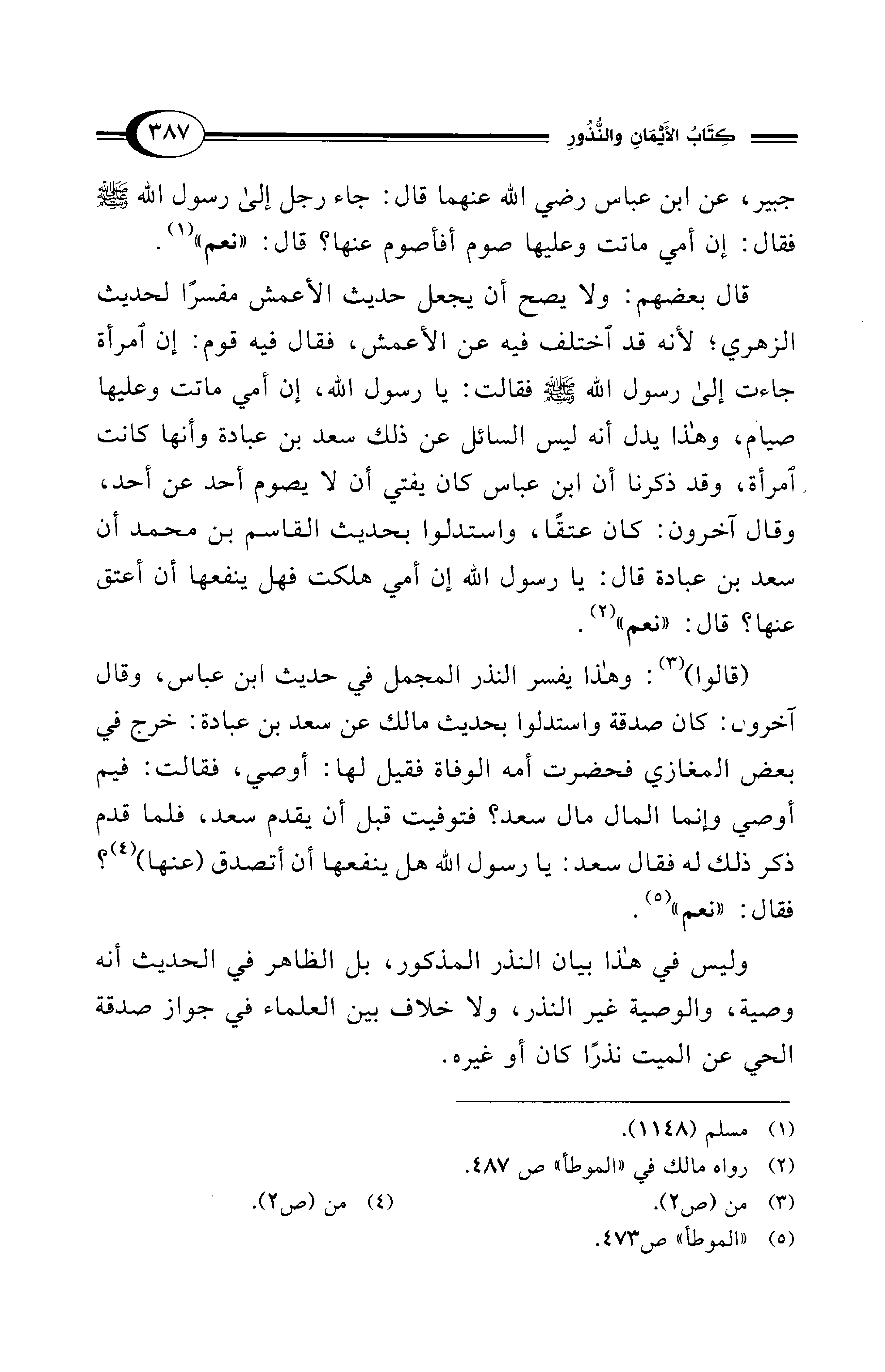 (قالوا) (¬3): وهذا يفسر النذر المجمل في حديث ابن عباس، وقال آخرون: كان صدقة واستدلوا بحديث مالك عن سعد بن عبادة: خرج في بعض المغازي فحضرت أمه الوفاة فقيل لها: أوصي، فقالت: فيم أوصي وإنما المال مال سعد؟ فتوفيت قبل أن يقدم سعد، فلما قدم ذكر ذلك له فقال سعد: يا رسول الله هل ينفعها أن أتصدق (عنها) (¬4)؟ فقال: "نعم" (¬5).