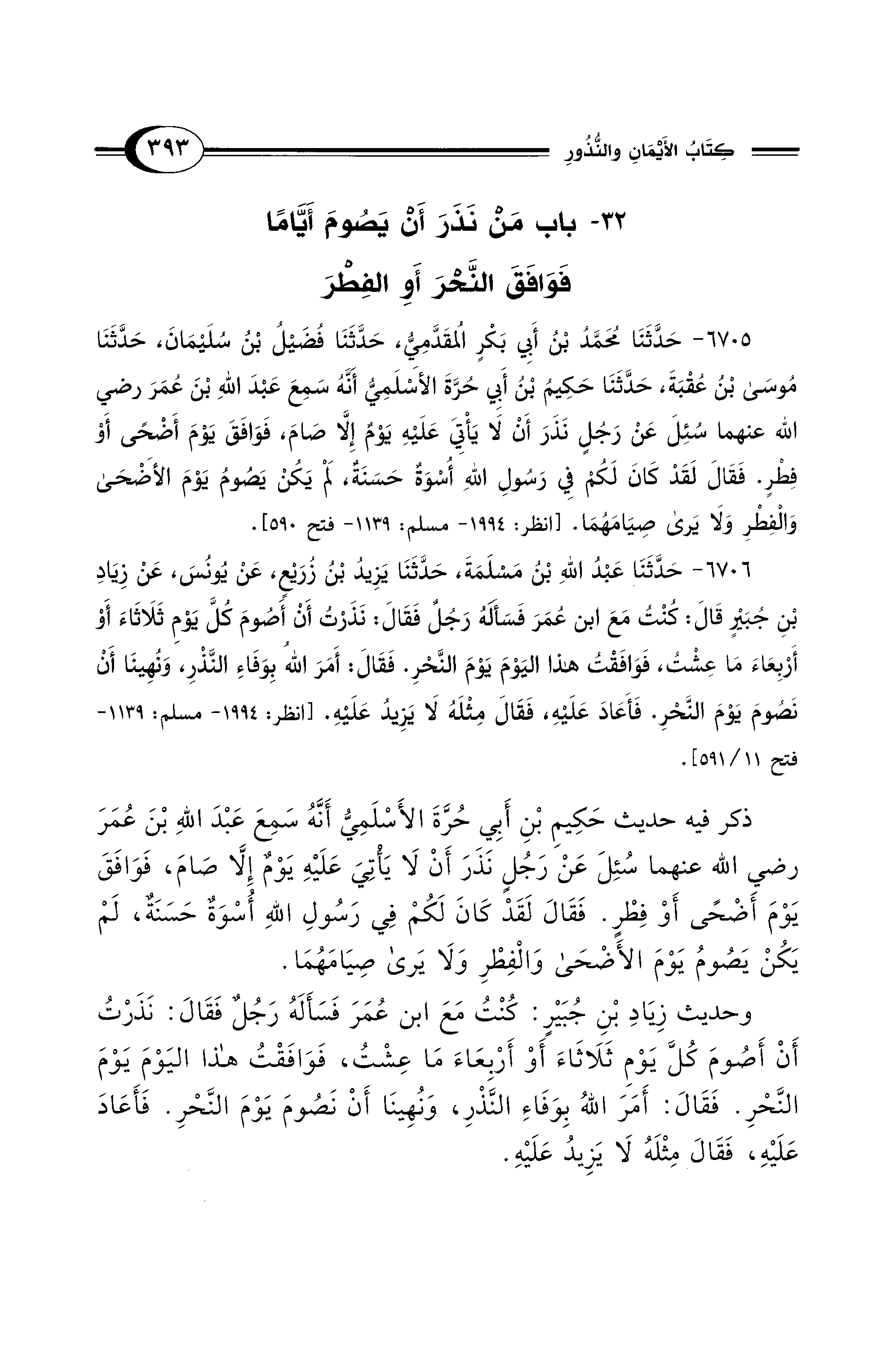 32 - باب مَنْ نَذَرَ أَنْ يَصُومَ أَيَّامًا فَوَافَقَ النَّحْرَ أَوِ الفِطْرَ