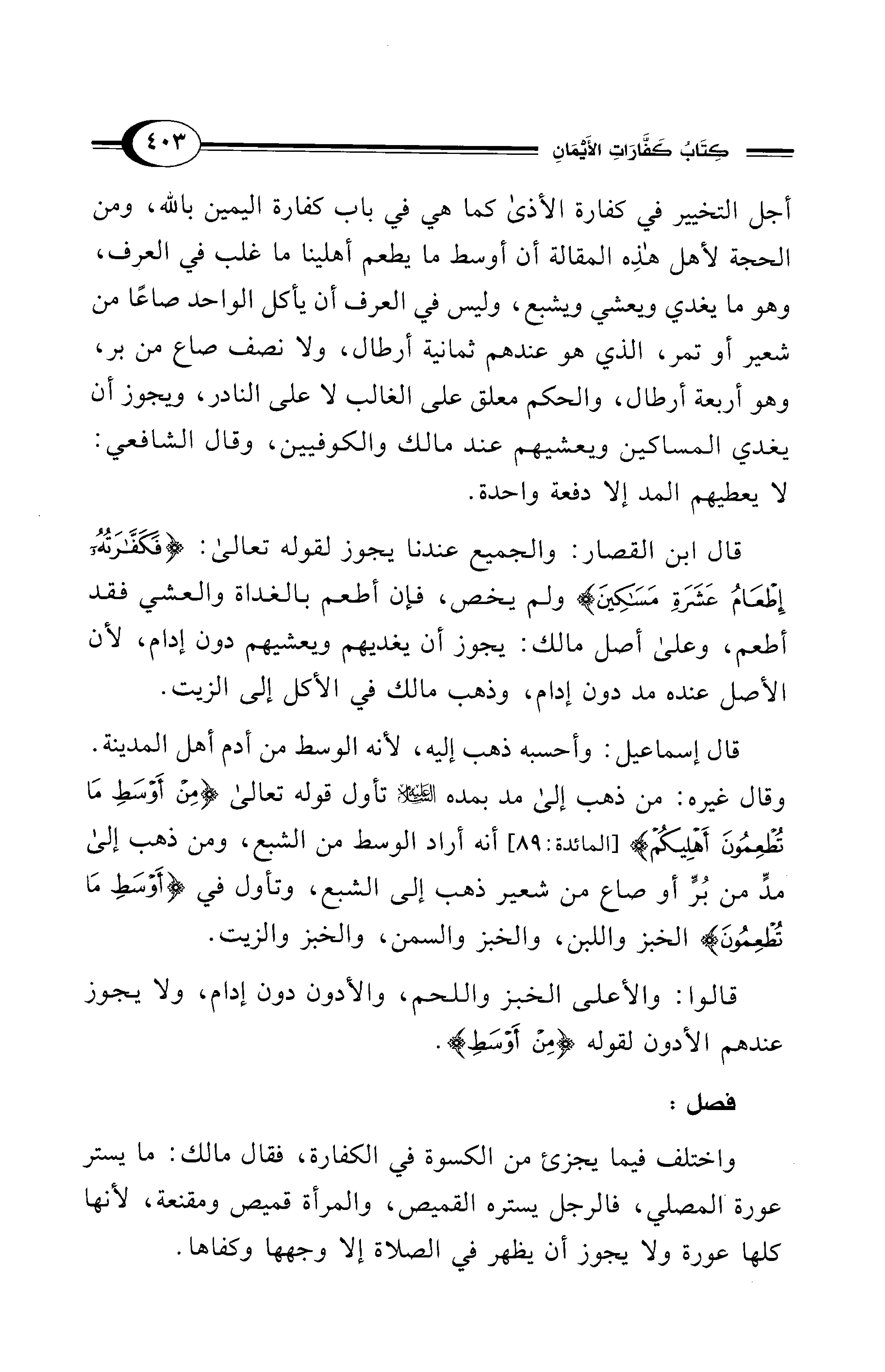 قال إسماعيل: وأحسبه ذهب إليه, لأنه الوسط من أدم أهل المدينة. وقال غيره: من ذهب إلى مد بمده - عليه السلام - تأول قوله تعالى {مِنْ أَوْسَطِ مَا تُطْعِمُونَ أَهْلِيكُمْ} [المائدة: 89] أنه أراد الوسط من الشبع، ومن ذهب إلى مدٍّ من بُرٍّ أو صاع من شعير ذهب إلى الشبع، وتأول في {أَوْسَطِ مَا تُطْعِمُونَ} الخبز واللبن، والخبر والسمن، والخبر والزيت.