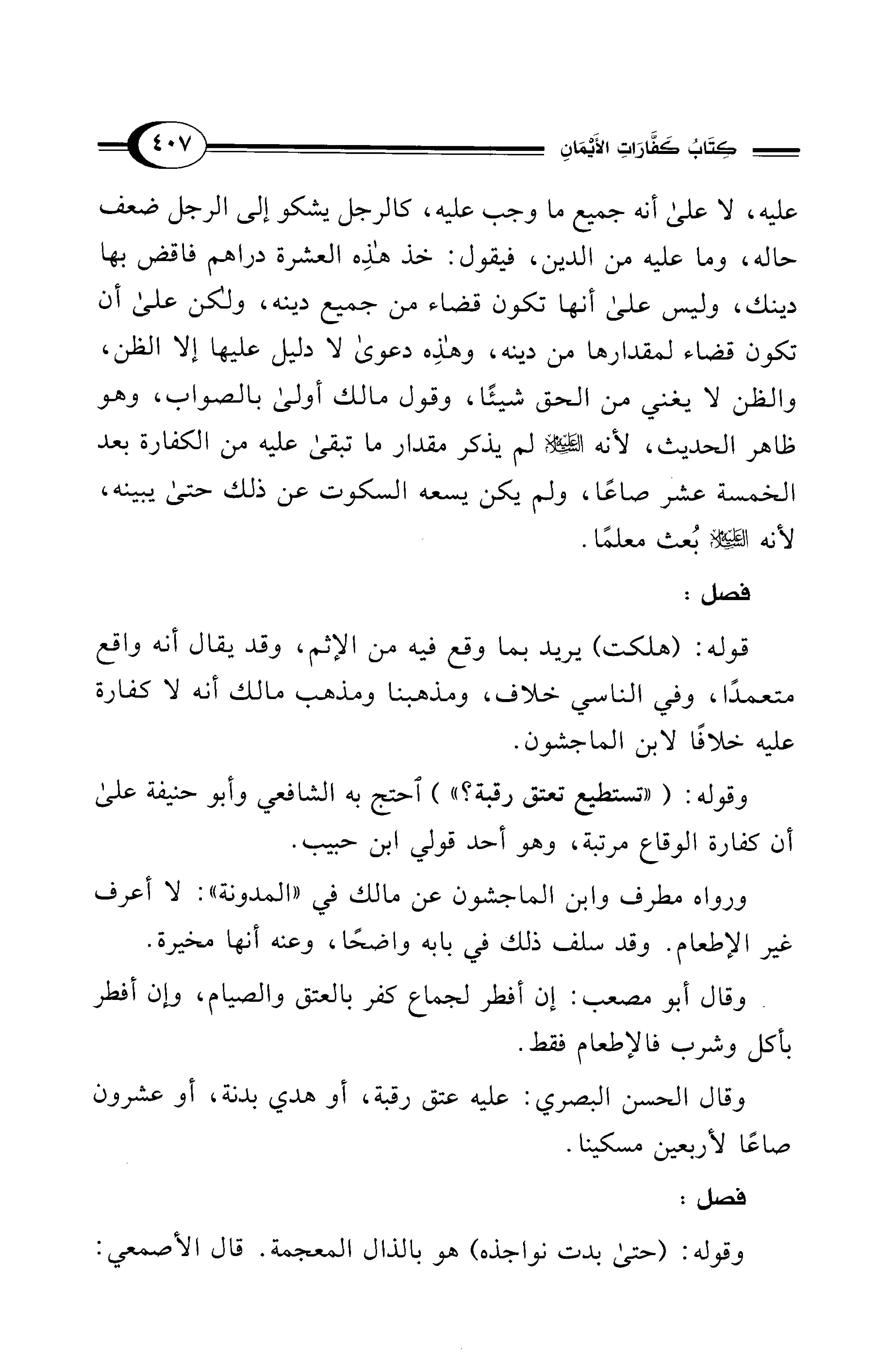 -وقال أبو مصعب: إن أفطر لجماع كفر بالعتق والصيام، وإن أفطر بأكل وشرب فالإطعام فقط.