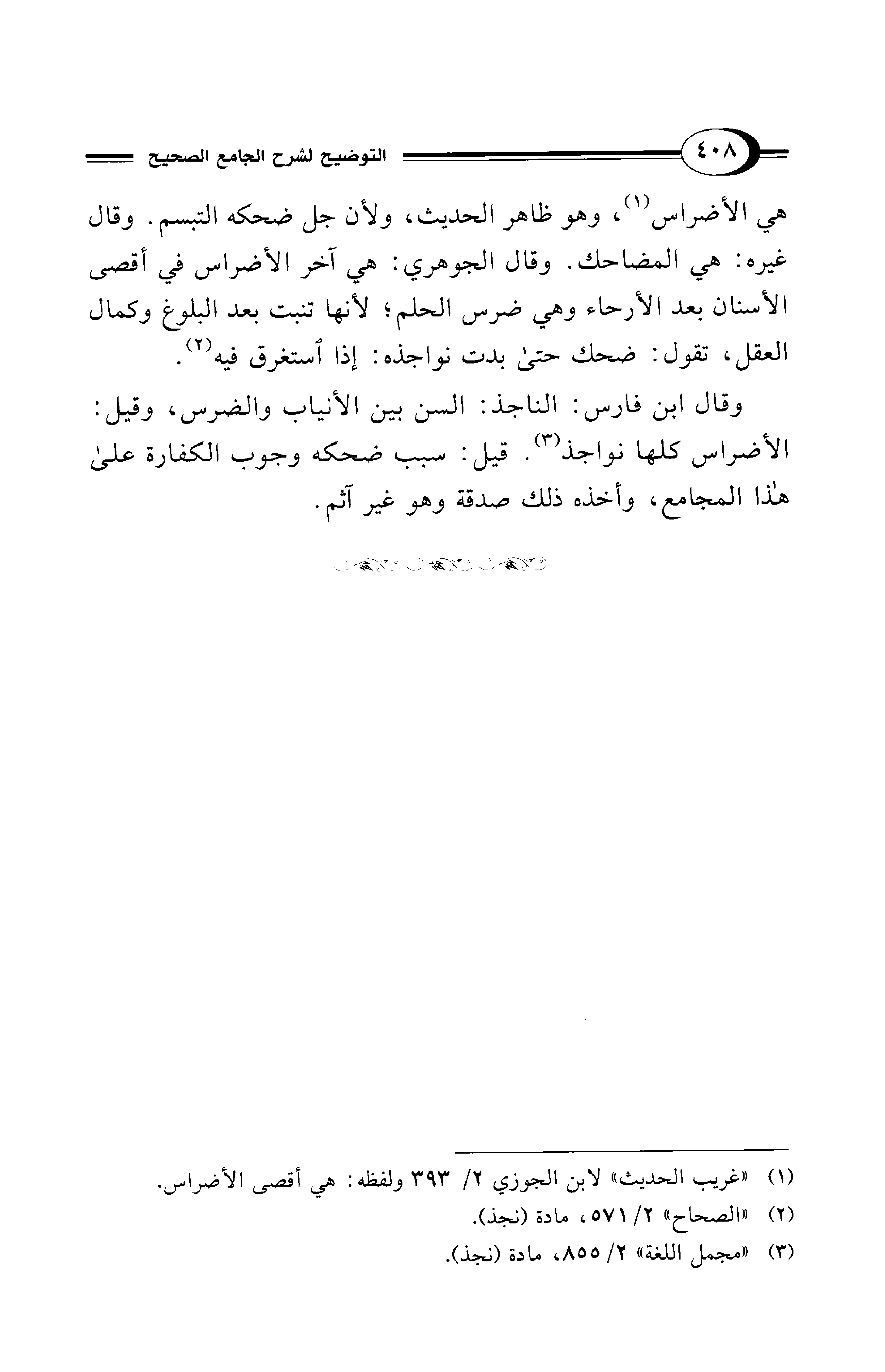 وقال ابن فارس: الناجذ: السنن بين الأنياب والضرس، وقيل: الأضراس كلها نواجذ (¬3). قيل: سبب ضحكه وجوب الكفارة على هذا المجامع، وأخذه ذلك صدقة وهو غير آثم.