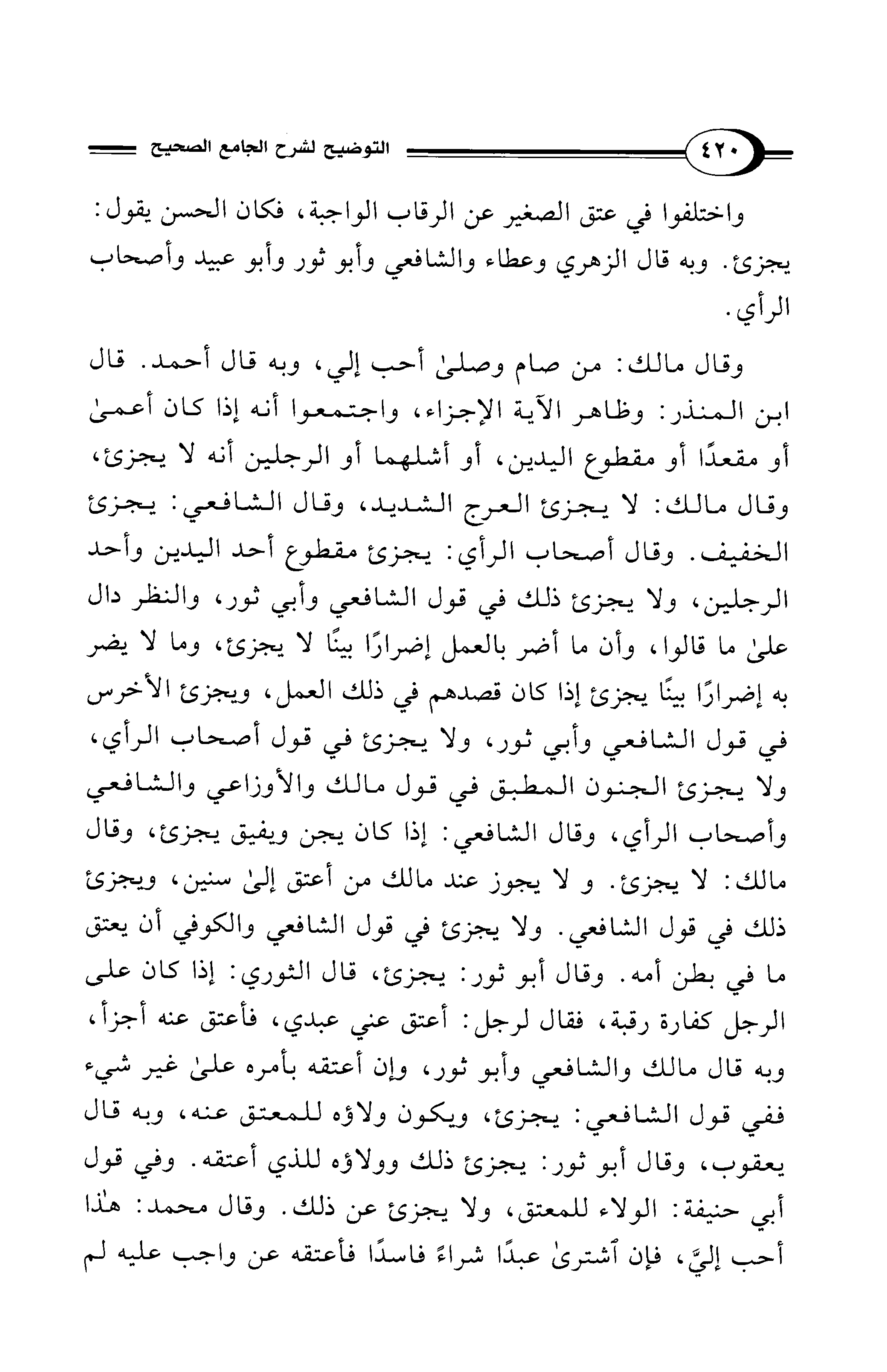 واختلفوا في عتق الصغير عن الرقاب الواجبة، فكان الحسن يقول: يجزئ. وبه قال الزهري وعطاء والشافعي وأبو ثور وأبو عبيد وأصحاب الرأي.