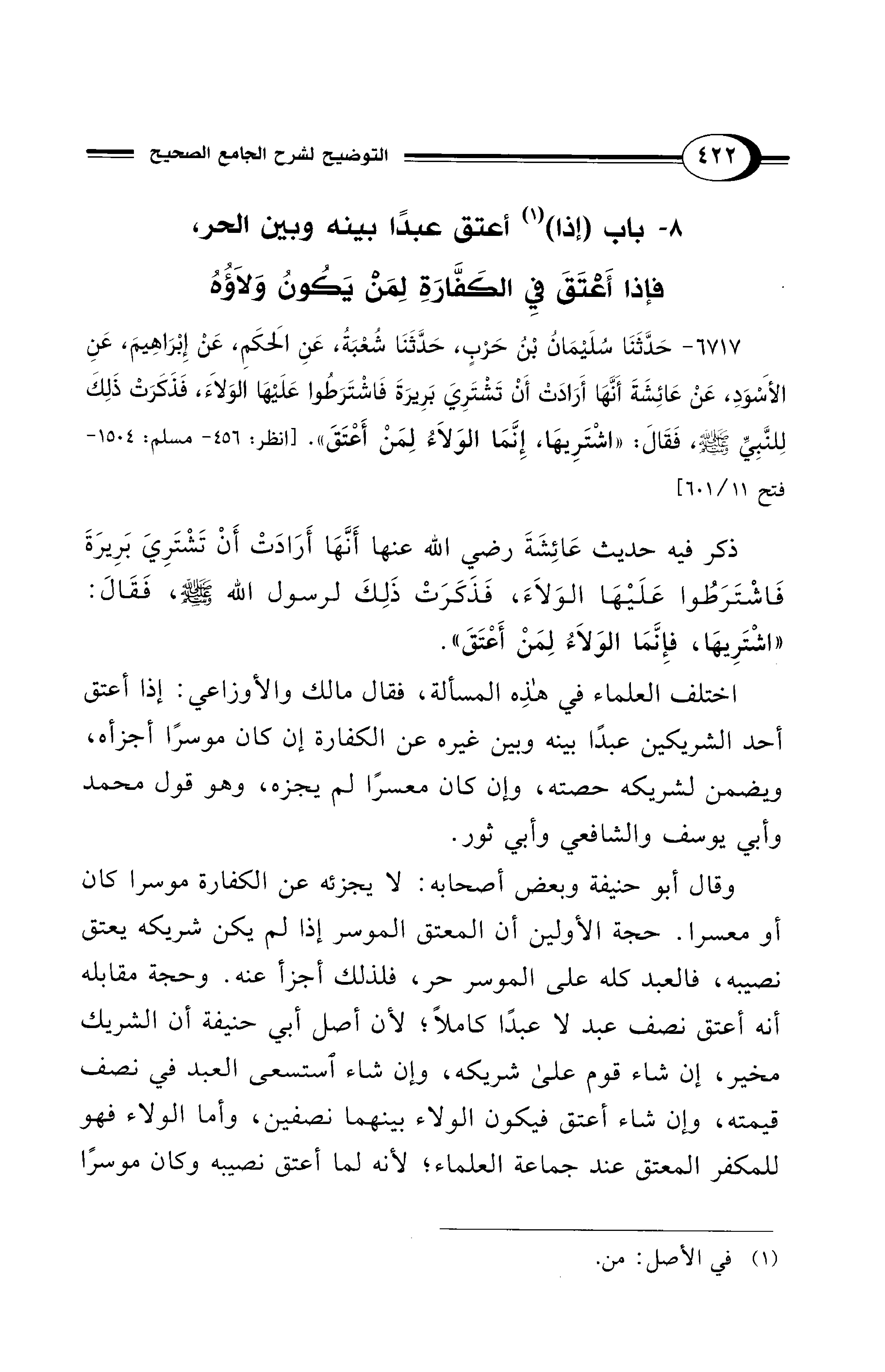 8 - باب (إذا) (¬1) أَعتق عبدًا بينه وبين الحر، فإذا أَعْتَقَ فِي الكَفَّارَةِ لِمَنْ يَكُونُ وَلاَؤُهُ