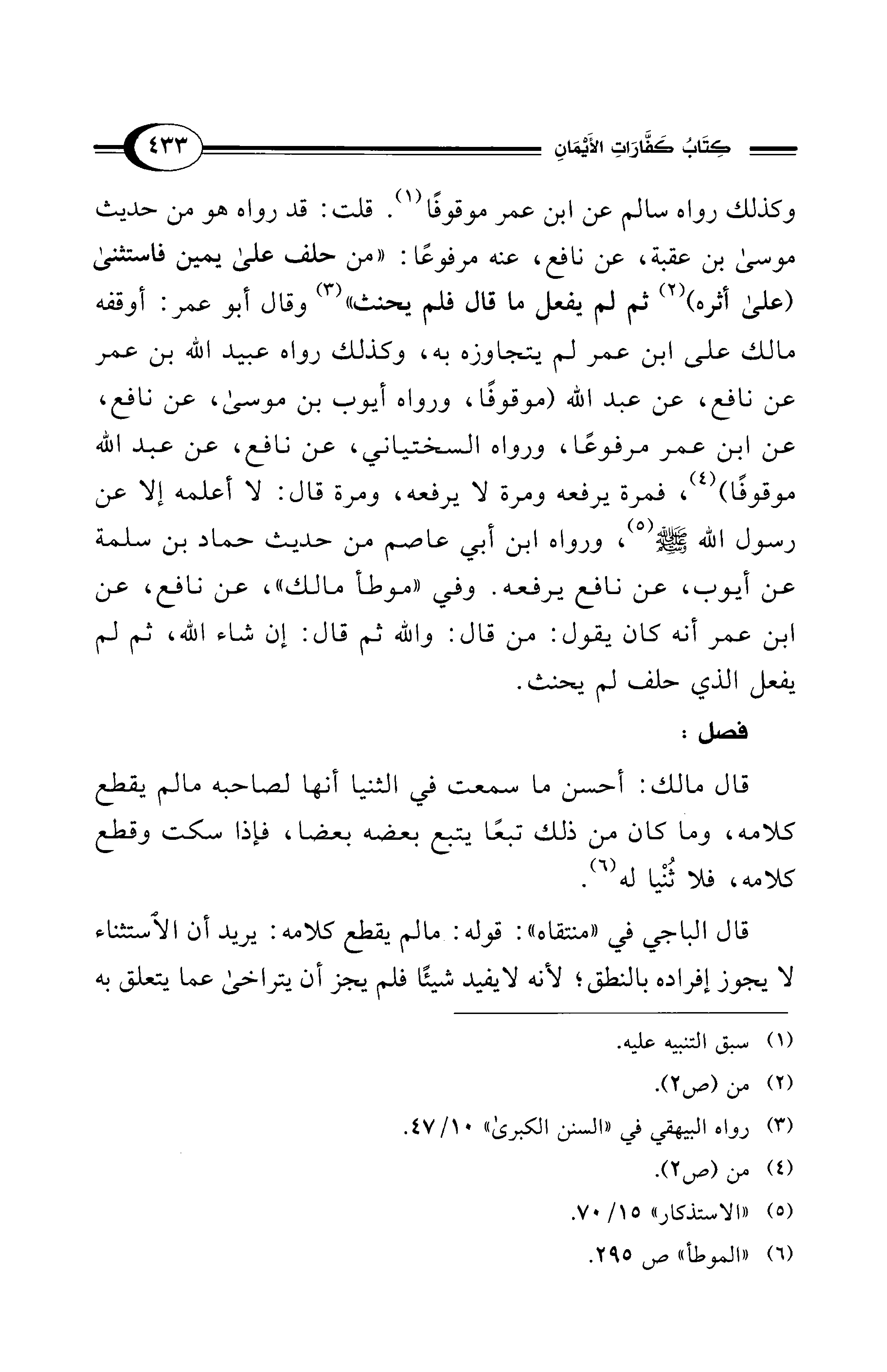 وكذلك رواه سالم عن ابن عمر موقوفًا (¬1). قلت: قد رواه هو من حديث موسى بن عقبة، عن نافع، عنه مرفوعًا: "من حلف على يمين فاستثنى (على أثره) (¬2) ثم لم يفعل ما قال فلم يحنت" (¬3) وقال أبو عمر: أوقفه مالك على ابن عمر لم يتجاوزه به، وكذلك رواه عبيد الله بن عمر عن نافع، عن عبد الله (موقوفًا، ورواه أيوب بن موسى، عن نافع، عن ابن عمر مرفوعًا، ورواه السختياني، عن نافع، عن عبد الله موقوفًا) (¬4)، فمرة يرفعه ومرة لا يرفعه، ومرة قال: لا أعلمه إلا عن رسول الله - صلى الله عليه وسلم - (¬5)، ورواه ابن أبي عاصم من حديث حماد بن سلمة عن أيوب، عن نافع يرفعه. وفي "موطأ مالك"، عن نافع، عن ابن عمر أنه كان يقول: من قال: والله ثم قال: إن شاء الله، ثم لم يفعل الذي حلف لم يحنث.