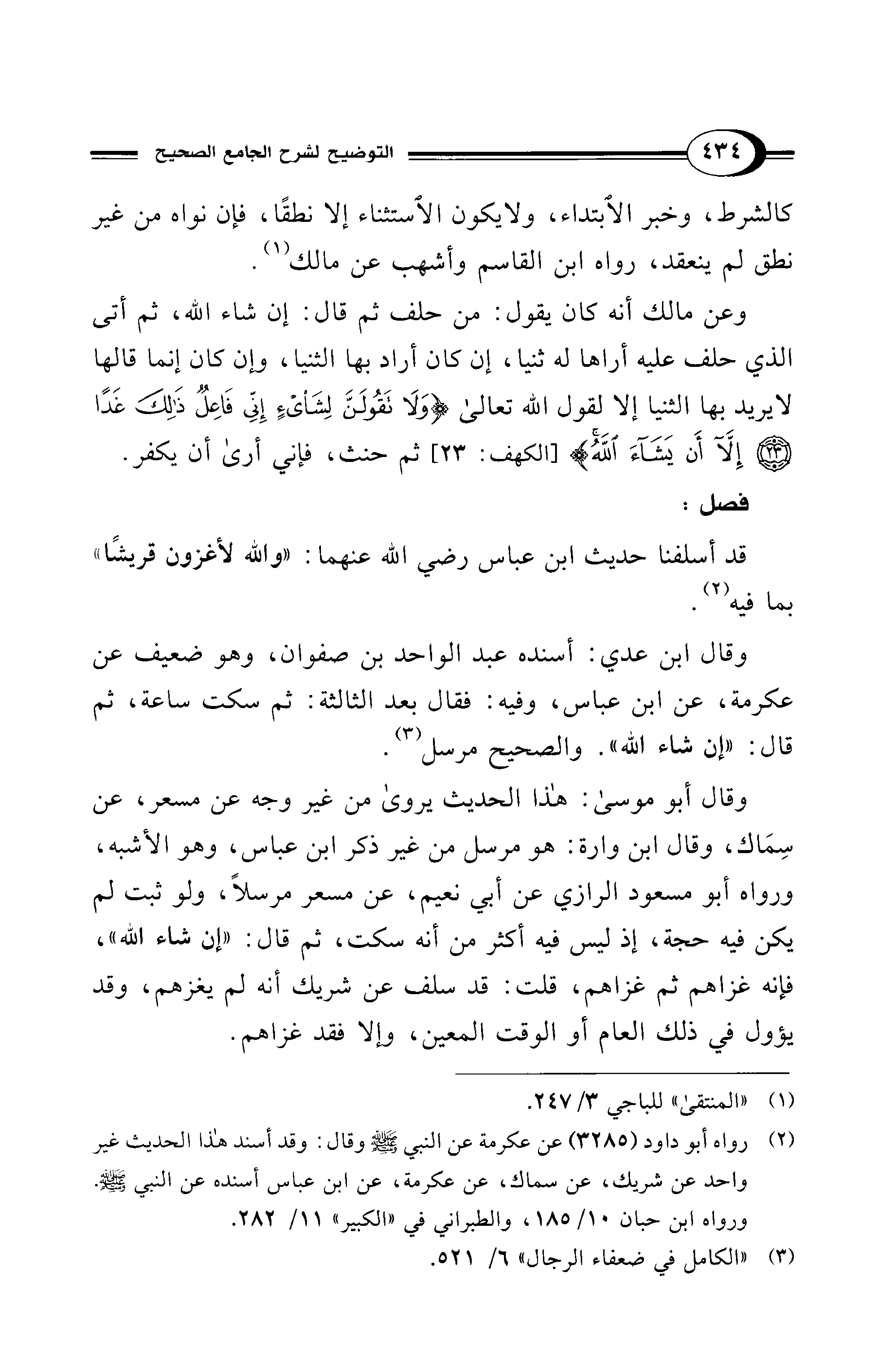 وعن مالك أنه كان يقول: من حلف ثم قال: إن شاء الله، ثم أتى الذي حلف عليه أراها له ثنيا، إن كان أراد بها الثنيا، وإن كان إنما قالها لايريد بها الثنيا إلا لقول الله تعالى {وَلَا تَقُولَنَّ لِشَيْءٍ إِنِّي فَاعِلٌ ذَلِكَ غَدًا (23)