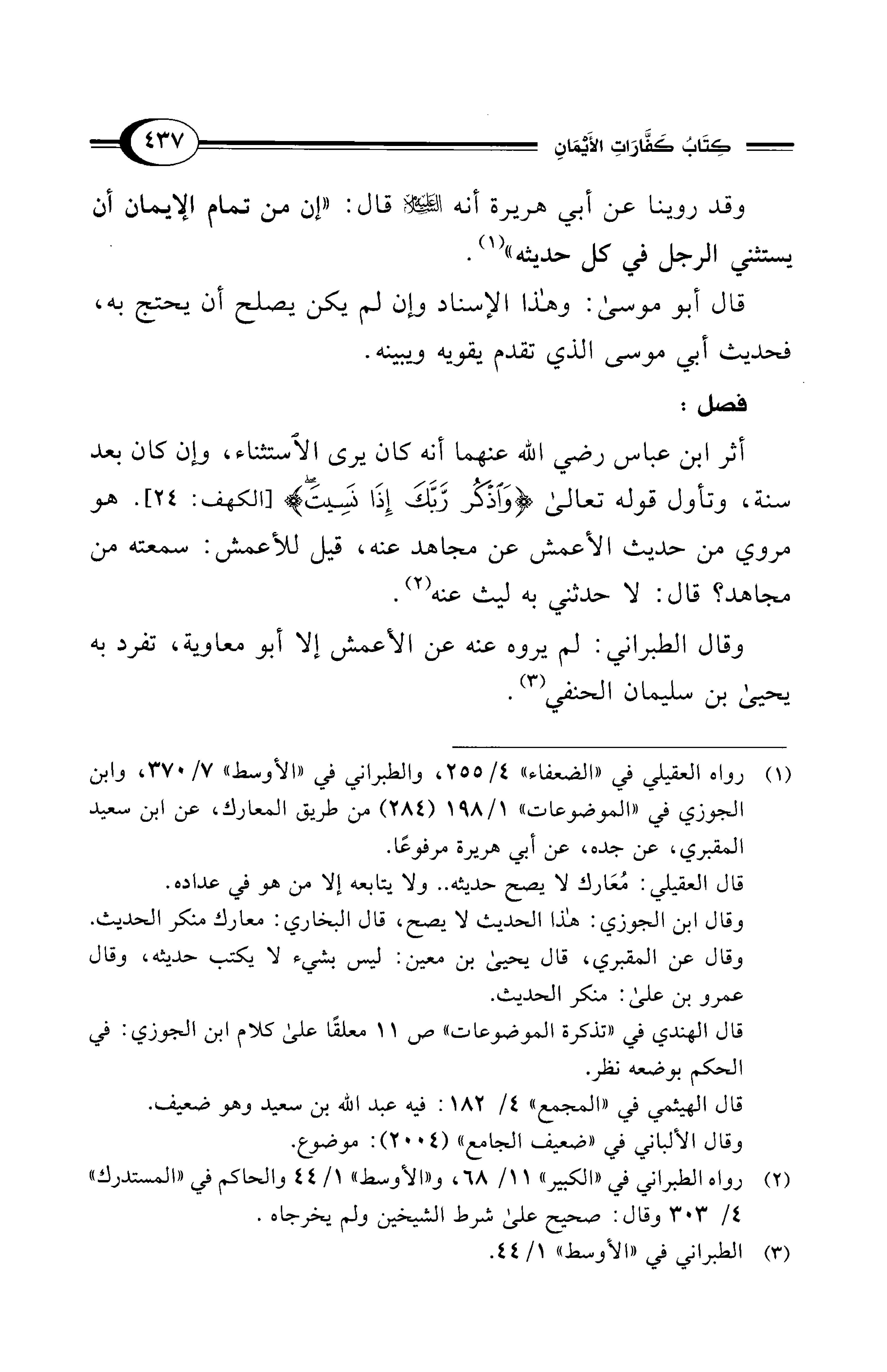 وقد روينا عن أبي هريرة أنه - عليه السلام - قال: "إن من تمام الإيمان أن يستثني الرجل في كل حديثه" (¬1).