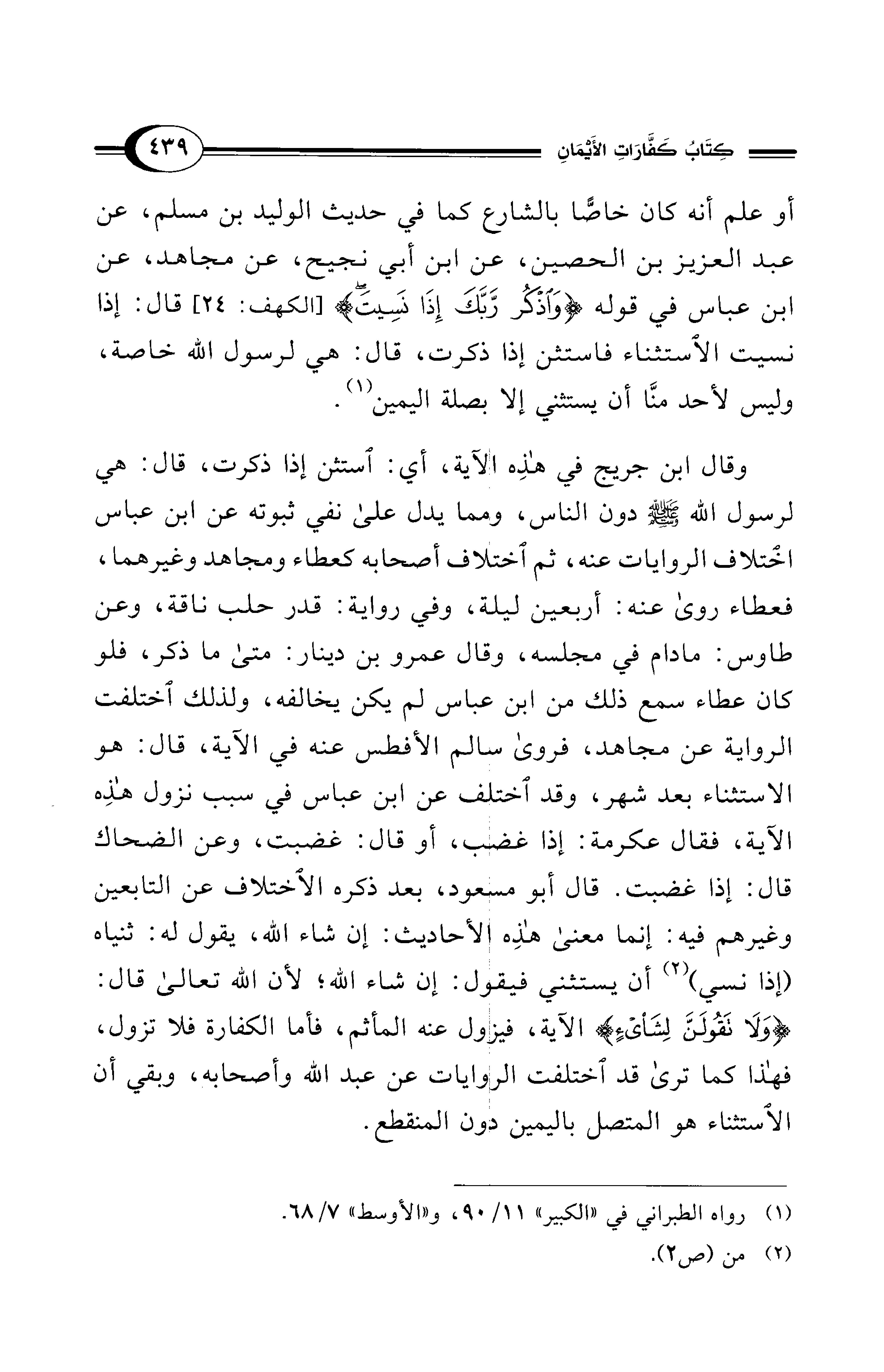وقال ابن جريج في هذِه الآية، أي: استثن إذا ذكرت، قال: هي لرسول الله - صلى الله عليه وسلم - دون الناس، ومما يدل على نفي ثبوته عن ابن عباس اختلاف الروايات عنه، ثم اختلاف أصحابه كعطاء ومجاهد وغيرهما، فعطاء روى عنه: أربعين ليلة، وفي رواية: قدر حلب ناقة، وعن طاوس: مادام في مجلسه، وقال عمرو بن دينار: متى ما ذكر، فلو كان عطاء سمع ذلك من ابن عباس لم يكن يخالفه، ولذلك اختلفت الرواية عن مجاهد، فروى سالم الأفطس عنه في الآية، قال: هو الاستثناء بعد شهر، وقد اختلف عن ابن عباس في سبب نزول هذِه الآية، فقال عكرمة: إذا غضب، أو قال: غضبت، وعن الضحاك قال: إذا غضبت. قال أبو مسعود، بعد ذكره الاختلاف عن التابعين وغيرهم فيه: إنما معنى هذِه الأحاديث: إن شاء الله، يقول له: ثنياه (إذا نسي) (¬2) أن يستثني فيقول: إن شاء الله؛ لأن الله تعالى قال: {وَلَا تَقُولَنَّ لِشَيْءٍ} الآية، فيزول عنه المأثم فأما الكفارة فلا تزول، فهذا كما ترى قد اختلفت الروايات عن عبد الله وأصحابه، وبقي أن الاستثناء هو المتصل باليمين دون المنقطع.