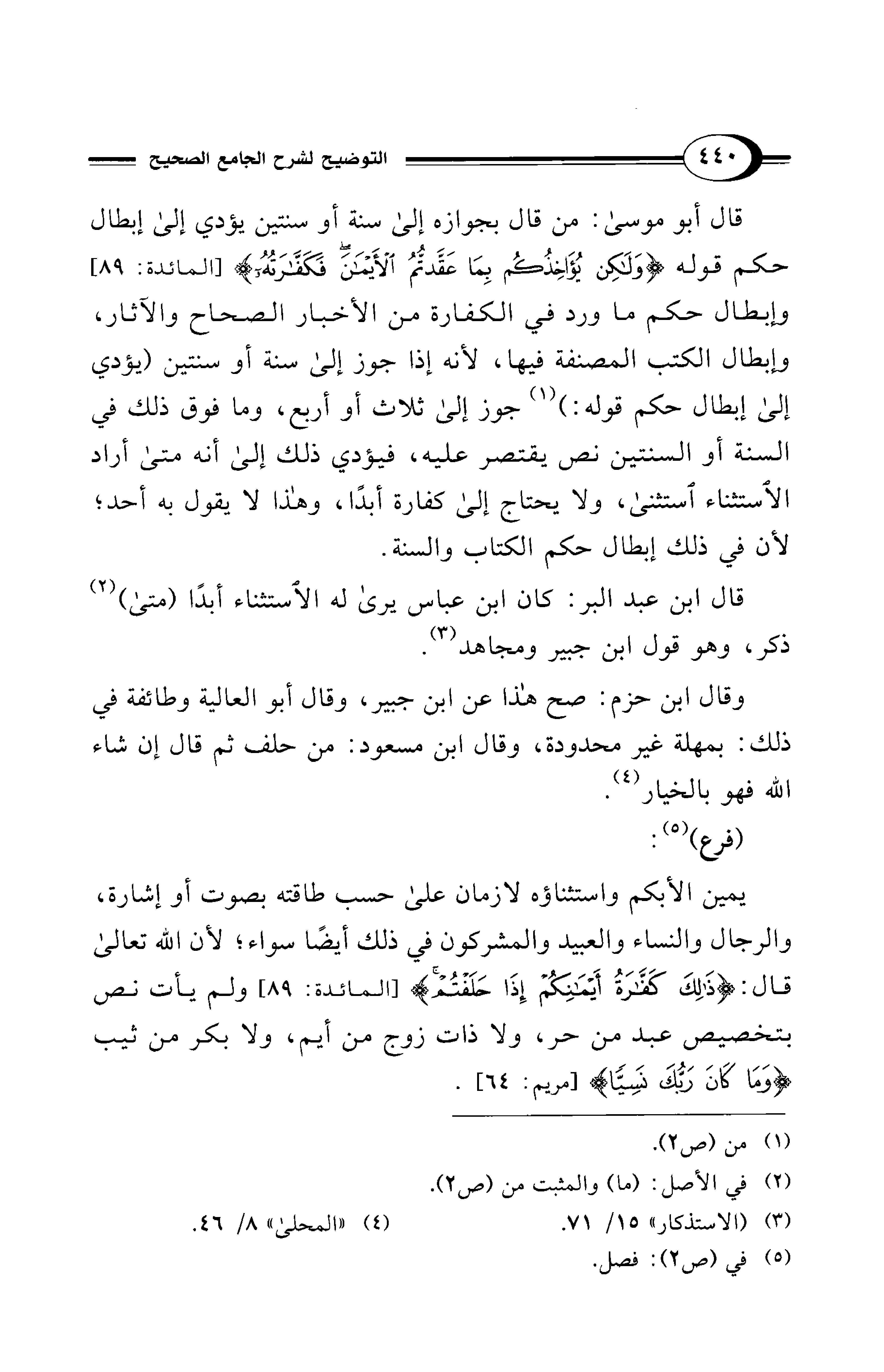 قال أبو موسى: من قال بجوازه إلى سنة أو سنتين يؤدي إلى إبطال حكم قوله {وَلَكِنْ يُؤَاخِذُكُمْ بِمَا عَقَّدْتُمُ الْأَيْمَانَ فَكَفَّارَتُهُ} [المائدة: 89] وإبطال حكم ما ورد في الكفارة من الأخبار الصحاح والآثار، وإبطال الكتب المصنفة فيها، لأنه إذا جوز إلى سنة أو سنتين (يؤدي إلى إبطال حكم قوله:) (¬1) جوز إلى ثلاث أو أربع، وما فوق ذلك في السنة أو السنتين نص يقتصر عليه، فيؤدي ذلك إلى أنه متى أراد الاستثناء استثنى، ولا يحتاج إلى كفارة أبدًا، وهذا لا يقول به أحد؛ لأن في ذلك إبطال حكم الكتاب والسنة.