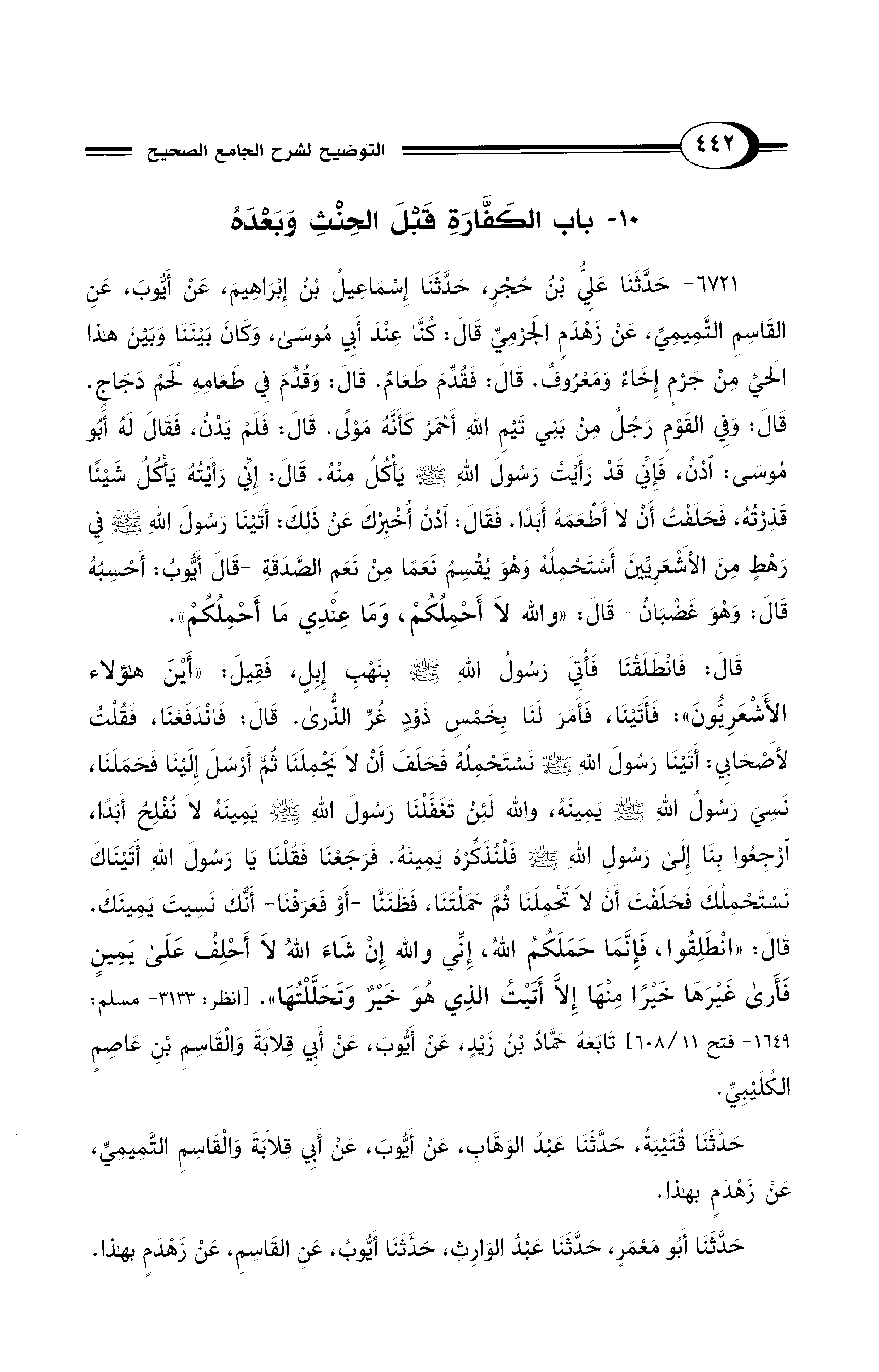 قَالَ: فَانْطَلَقْنَا فَأُتِيَ رَسُولُ اللهِ - صلى الله عليه وسلم - بِنَهْبِ إِبِلٍ، فَقِيلَ: "أَيْنَ هَؤُلاَءِ الأَشْعَرِيُّونَ": فَأَتَيْنَا, فَأَمَرَ لَنَا بِخَمْسِ ذَوْدٍ غُرِّ الذُّرَى. قَالَ: فَانْدَفَعْنَا، فَقُلْتُ لأَصْحَابِي: أَتَيْنَا رَسُولَ اللهِ - صلى الله عليه وسلم - نَسْتَحْمِلُهُ، فَحَلَفَ أَنْ لاَ يَحْمِلَنَا، ثُمَّ أَرْسَلَ إِلَيْنَا فَحَمَلَنَا، نَسِيَ رَسُولُ اللهِ - صلى الله عليه وسلم - يَمِينَهُ، وَاللهِ لَئِنْ تَغَفَّلْنَا رَسُولَ اللهِ - صلى الله عليه وسلم - يَمِينَهُ لاَ نُفْلِحُ أَبَدًا، ارْجِعُوا بِنَا إِلَى رَسُولِ اللهِ - صلى الله عليه وسلم - فَلْنُذَكِّرْهُ يَمِينَهُ. فَرَجَعْنَا فَقُلْنَا يَا رَسُولَ اللهِ أَتَيْنَاكَ نَسْتَحْمِلُكَ، فَحَلَفْتَ أَنْ لاَ تَحْمِلَنَا ثُمَّ حَمَلْتَنَا فَظَنَنَّا -أَوْ فَعَرَفْنَا- أَنَّكَ نَسِيتَ يَمِينَكَ. قَالَ: «انْطَلِقُوا، فَإِنَّمَا حَمَلَكُمُ اللهُ، إِنِّي وَاللهِ إِنْ شَاءَ اللهُ لاَ أَحْلِفُ عَلَى يَمِينٍ فَأَرَى غَيْرَهَا خَيْرًا مِنْهَا إِلاَّ أَتَيْتُ الَّذِي هُوَ خَيْرٌ وَتَحَلَّلْتُهَا». [انظر: 3133 - مسلم: 1649 - فتح 11/ 608] تَابَعَهُ حَمَّادُ بْنُ زَيْدٍ، عَنْ أَيُّوبَ، عَنْ أَبِي قِلاَبَةَ وَالْقَاسِمِ بْنِ عَاصِمٍ الكُلَيْبِيِّ.