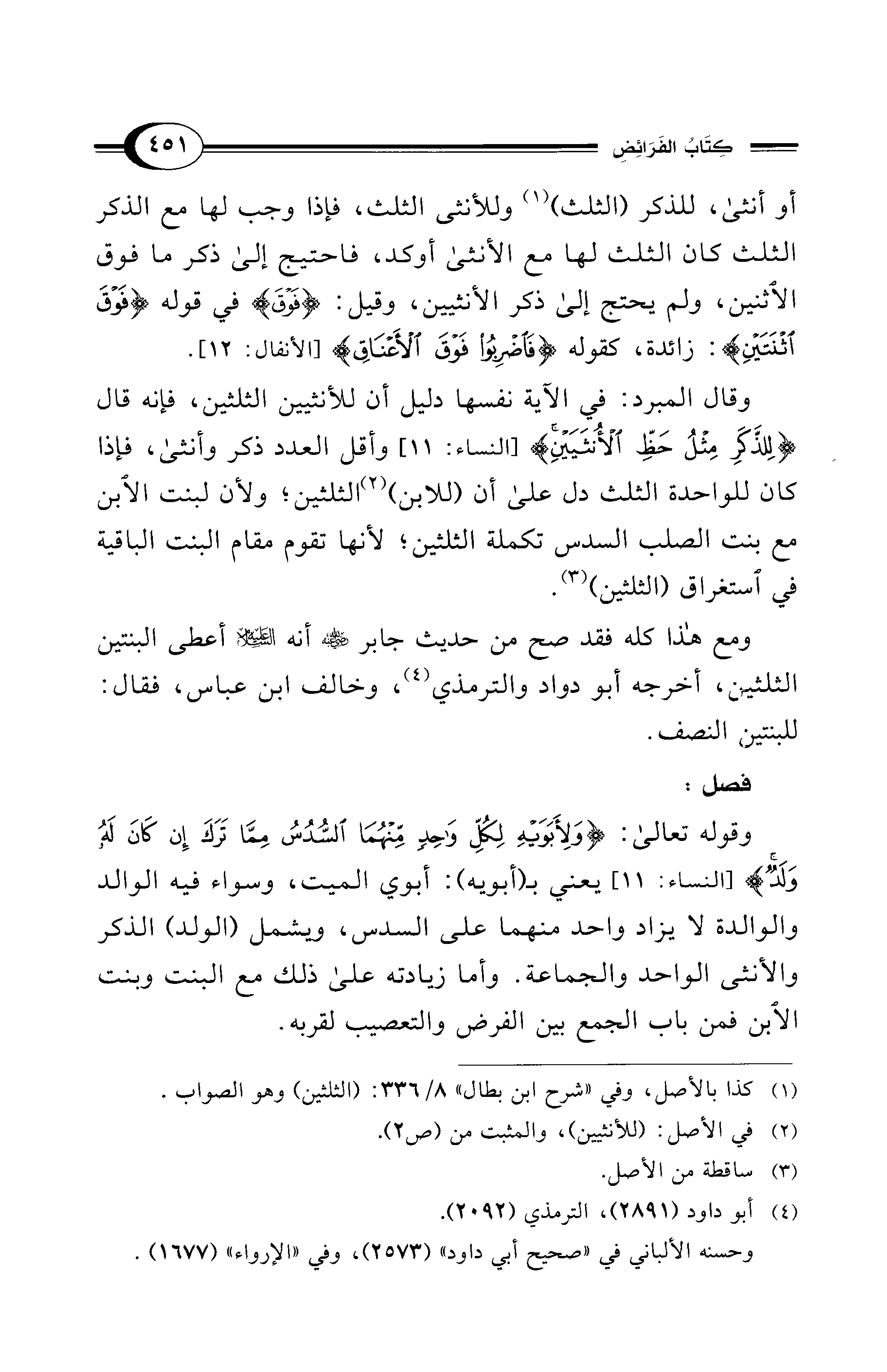 وقال المبرد: في الآية نفسها دليل أن للأنثيين الثلثين، فإنه قال {لِلذَّكَرِ مِثْلُ حَظِّ الْأُنْثَيَيْنِ} [النساء: 11] وأقل العدد ذكر وأنثى، فإذا كان للواحدة الثلث دل على أن (للابن) (¬2) الثلثين؛ ولأن لبنت الابن مع بنت الصلب السدس تكملة الثلثين؛ لأنها تقوم مقام البنت الباقية في استغراق (الثلثين) (¬3).
