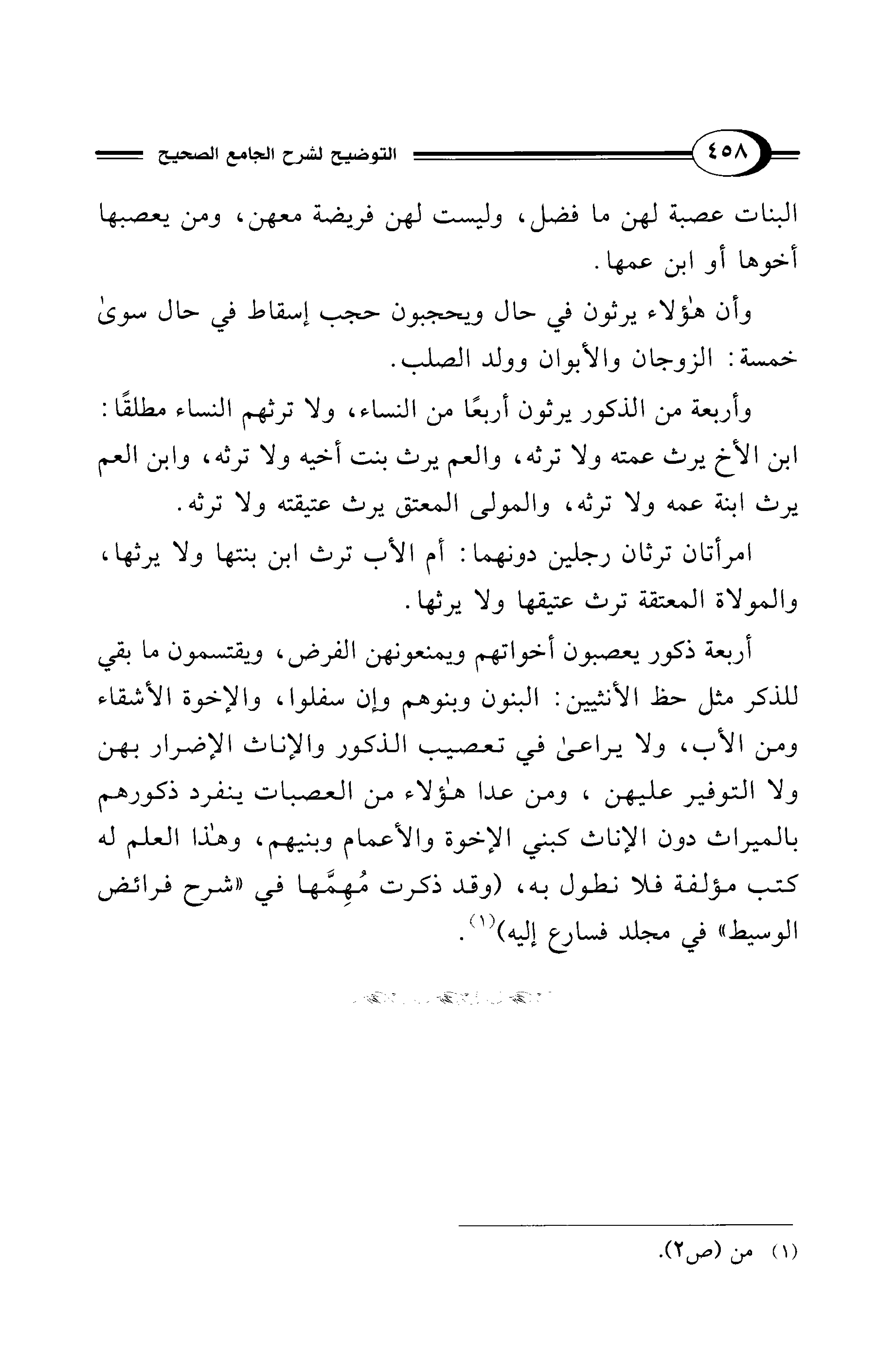أربعة ذكور يعصبون أخواتهم ويمنعونهن الفرض، ويقتسمون ما بقي للذكر مثل حظ الأنثيين: البنون وبنوهم وإن سفلوا، والإخوة الأشقاء ومن الأب، ولا يراعى في تعصيب الذكور والإناث الإضرار بهن ولا التوفير عليهن، ومن عدا هؤلاء من العصبات ينفرد ذكورهم بالميراث دون الإناث كبني الإخوة والأعمام وبنيهم، وهذا العلم له كتب مؤلفة فلا نطول به، (وقد ذكرت مُهِمَّها في "شرح فرائض الوسيط" في مجلد فسارع إليه) (¬1).