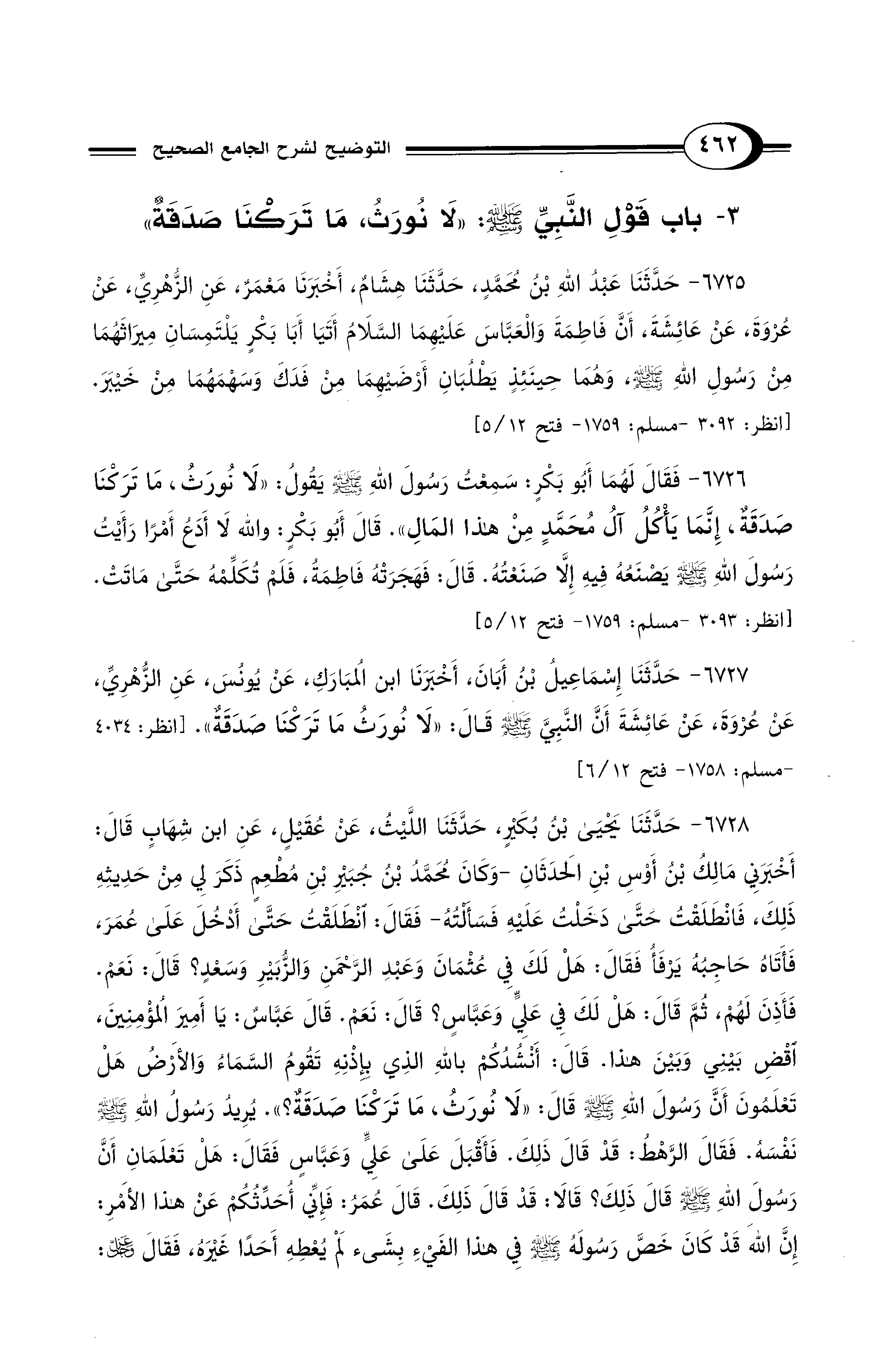 6726 - فَقَالَ لَهُمَا أَبُو بَكْرٍ: سَمِعْتُ رَسُولَ اللهِ - صلى الله عليه وسلم - يَقُولُ: «لاَ نُورَثُ، مَا تَرَكْنَا صَدَقَةٌ، إِنَّمَا يَأْكُلُ آلُ مُحَمَّدٍ مِنْ هَذَا الْمَالِ». قَالَ أَبُو بَكْرٍ: وَاللهِ لاَ أَدَعُ أَمْرًا رَأَيْتُ رَسُولَ اللهِ - صلى الله عليه وسلم - يَصْنَعُهُ فِيهِ إِلاَّ صَنَعْتُهُ. قَالَ: فَهَجَرَتْهُ فَاطِمَةُ، فَلَمْ تُكَلِّمْهُ حَتَّى مَاتَتْ. [انظر: 3093 - مسلم: 1759 - فتح 12/ 5]
