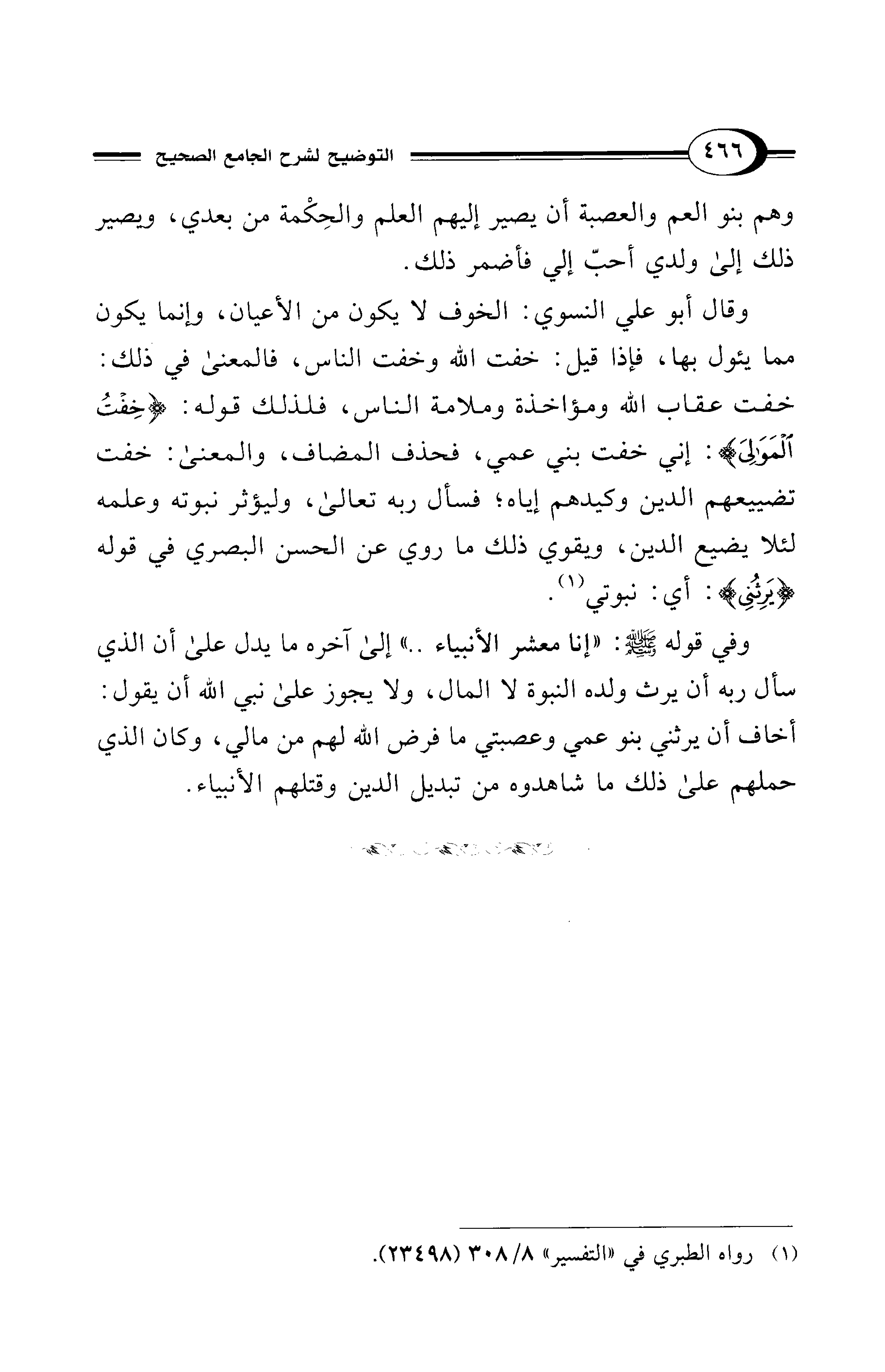 وقال أبو علي النسوي: الخوف لا يكون من الأعيان، وإنما يكون بما يئول بها، فإذا قيل: خفت الله وخفت الناس، فالمعنى في ذلك: خفت عقاب الله ومؤاخذة وملامة الناس، فلذلك قوله: {خِفْتُ الْمَوَالِيَ}: إني خفت بني عمي، فحذف المضاف، والمعنى؛ خفت تضييعهم الدين وكيدهم إياه، فسأل ربه تعالى، وليؤثر نبوته وعلمه لئلا يضيع الدين، ويقوي ذلك ما روي عن الحسن البصري في قوله {يَرِثُنِي}: أي: نبوتي (¬1).