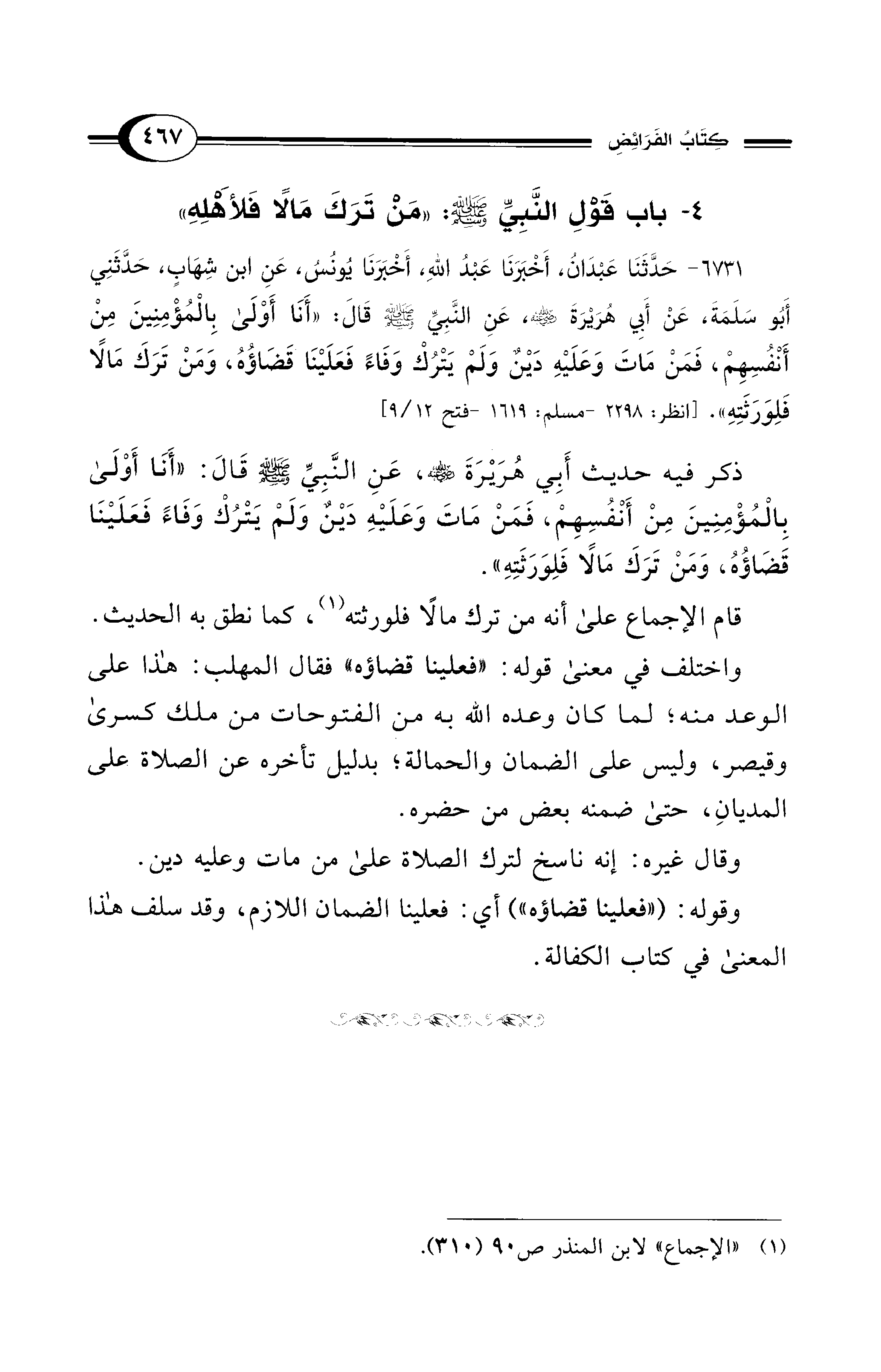 ذكر فيه حديث أَبِي هُرَيْرَةَ - رضي الله عنه -، عَنِ النَّبِيِّ - صلى الله عليه وسلم - قَالَ: "أَنَا أَوْلَى بِائمُؤْمِنِينَ مِن أَنْفُسِهِمْ، فَمَنْ مَاتَ وَعَلَيْهِ دَيْنٌ وَلَمْ يَتْرُكْ وَفَاءً فَعَلَيْنَا قَضَاؤُه، وَمَن تَرَكَ مَالًا فَلِوَرَثَتِهِ".