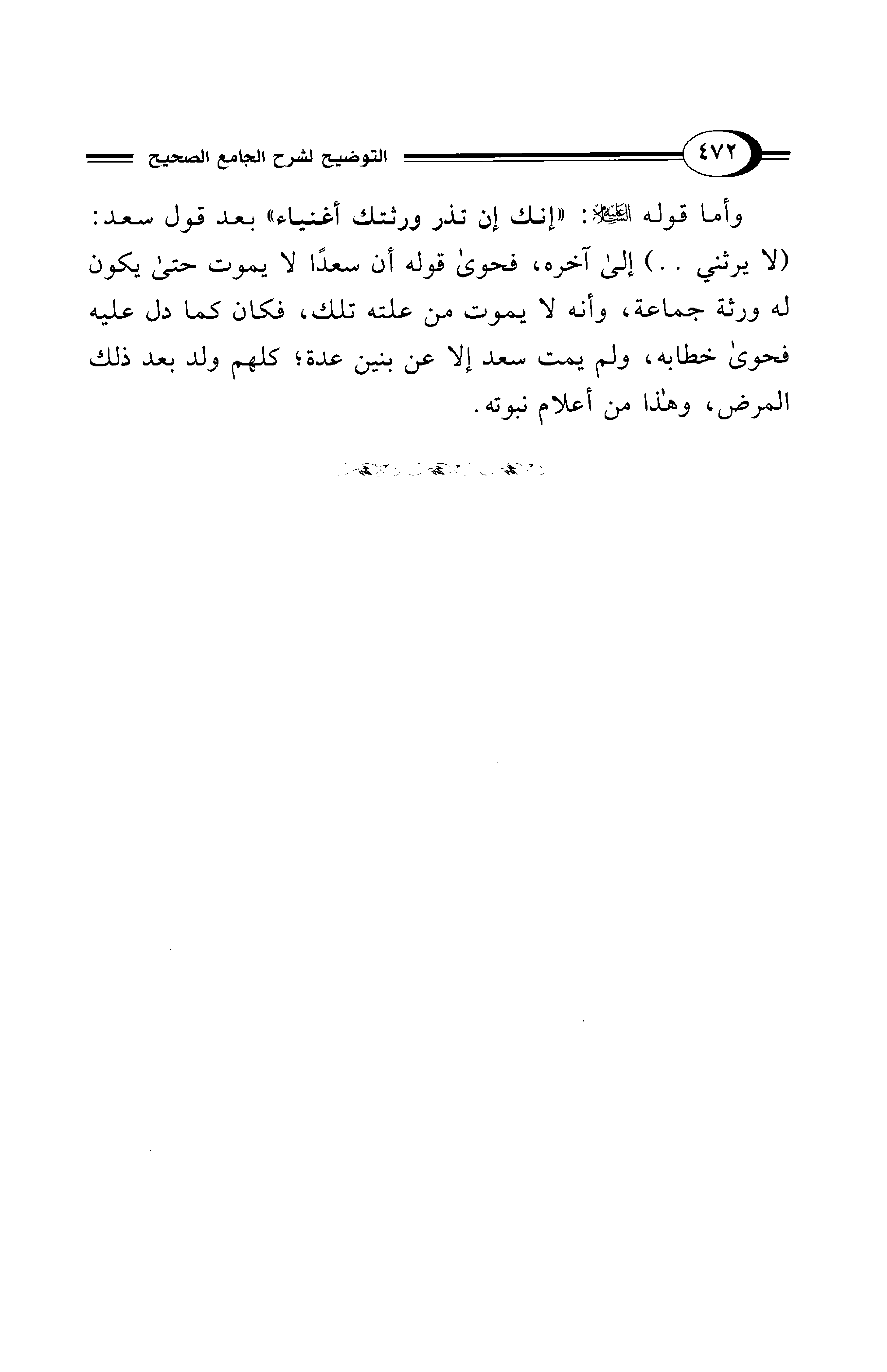 وأما قوله - عليه السلام -: "إنك إن تذر ورثتك أغنياء" بعد قول سعد: (لا يرثني ..) إلى آخره، فحوى قوله أن سعدًا لا يموت حتى يكون له ورثة جماعة، وأنه لا يموت من علته تلك، فكان كما دل عليه فحوى خطابه، ولم يمت سعد إلا عن بنين عدة؛ كلهم ولد بعد ذلك المرض، وهذا من أعلام نبوته.