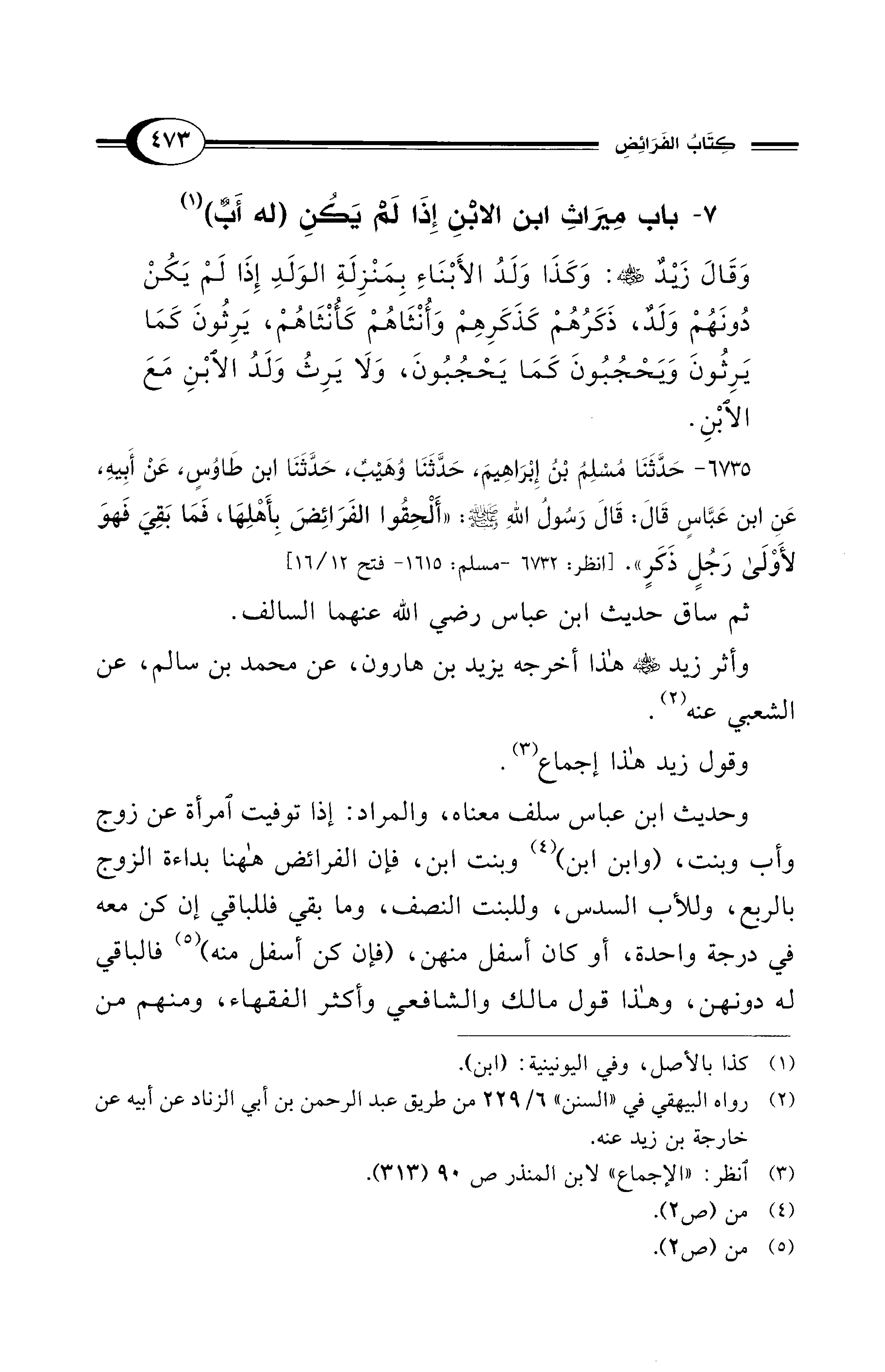 6735 - حَدَّثَنَا مُسْلِمُ بْنُ إِبْرَاهِيمَ، حَدَّثَنَا وُهَيْبٌ، حَدَّثَنَا ابْنُ طَاوُسٍ، عَنْ أَبِيهِ، عَنِ ابْنِ عَبَّاسٍ قَالَ: قَالَ رَسُولُ اللهِ - صلى الله عليه وسلم -: «أَلْحِقُوا الْفَرَائِضَ بِأَهْلِهَا، فَمَا بَقِيَ فَهْوَ لأَوْلَى رَجُلٍ ذَكَرٍ» [انظر: 6732 - مسلم: 1615 - فتح 12/ 16]